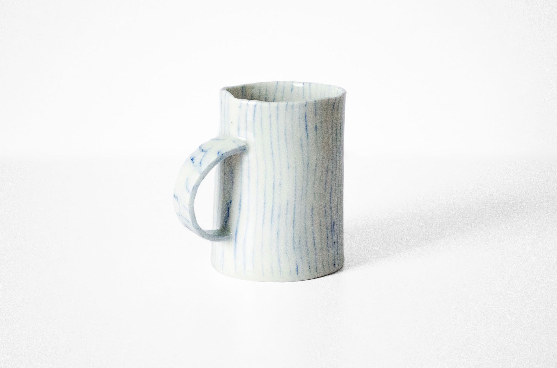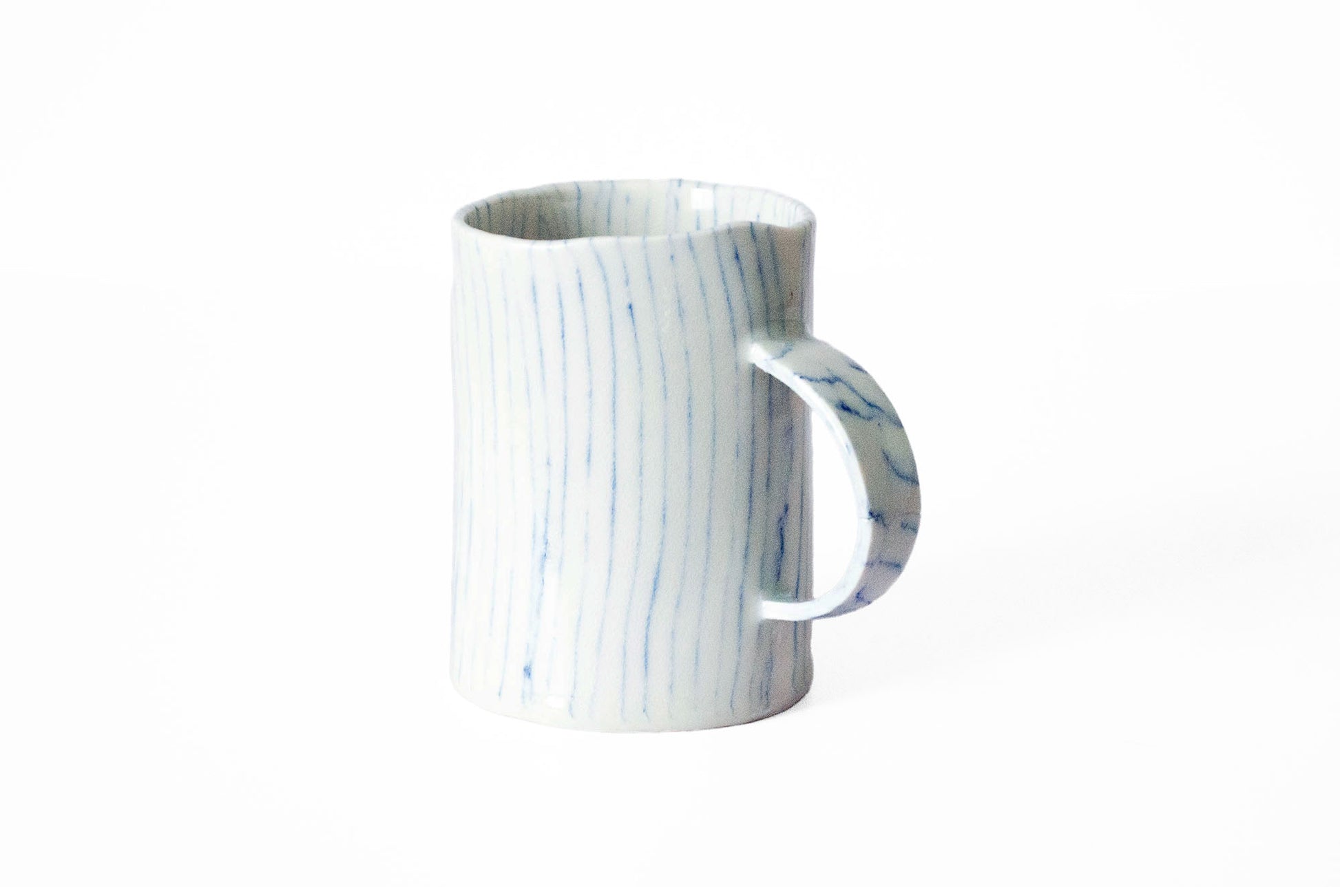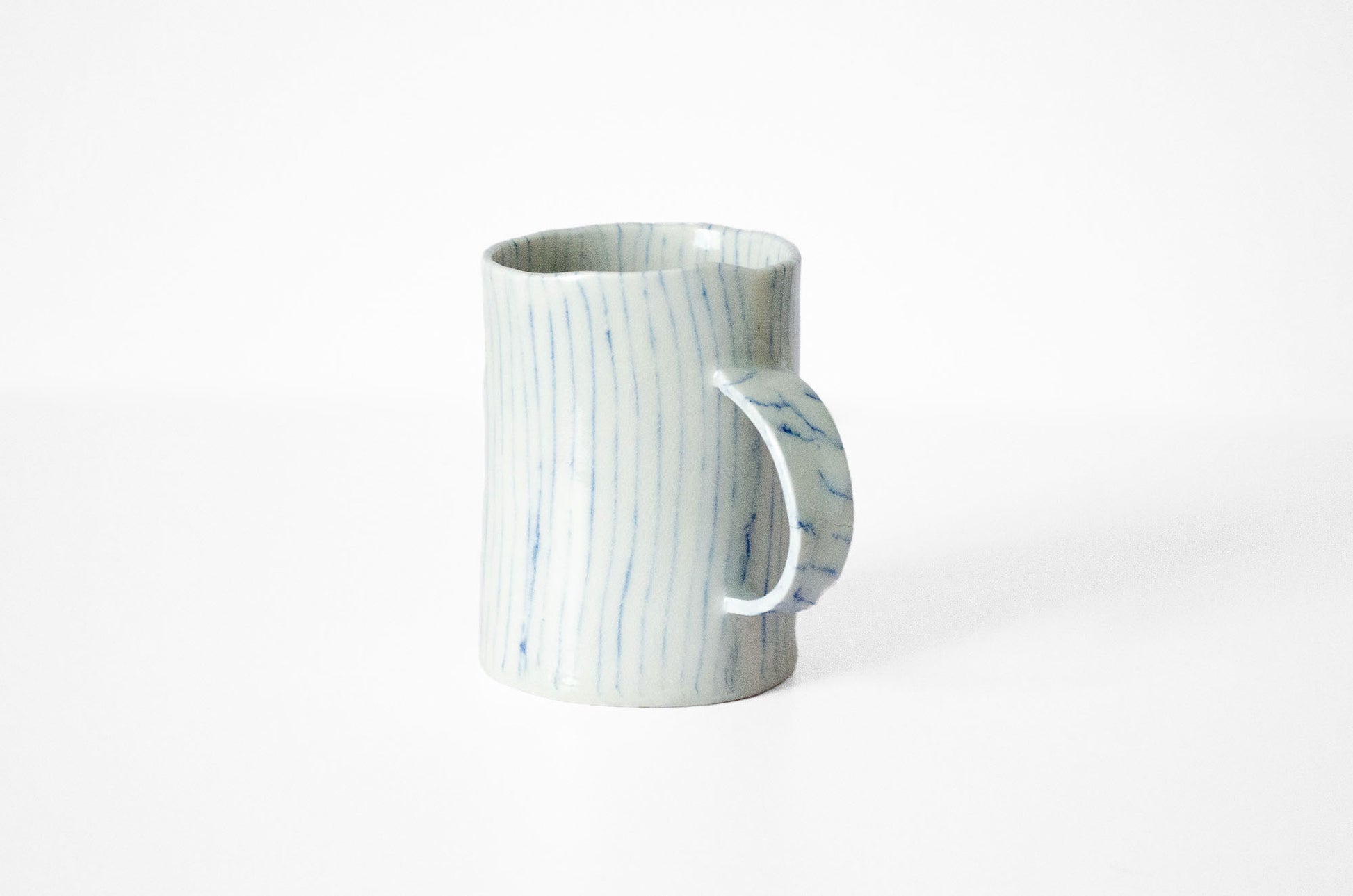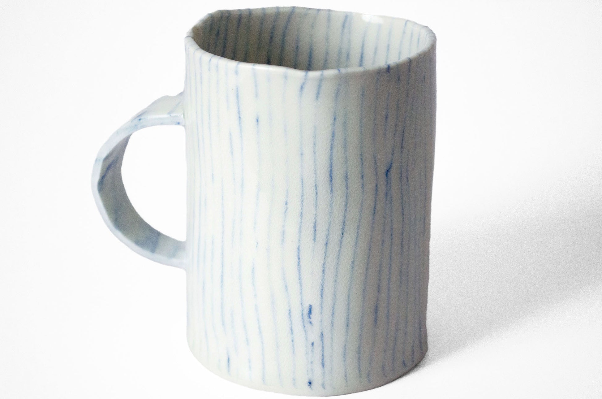 This mug has a chalk stripe pattern made by applying the Nerikomi technique.