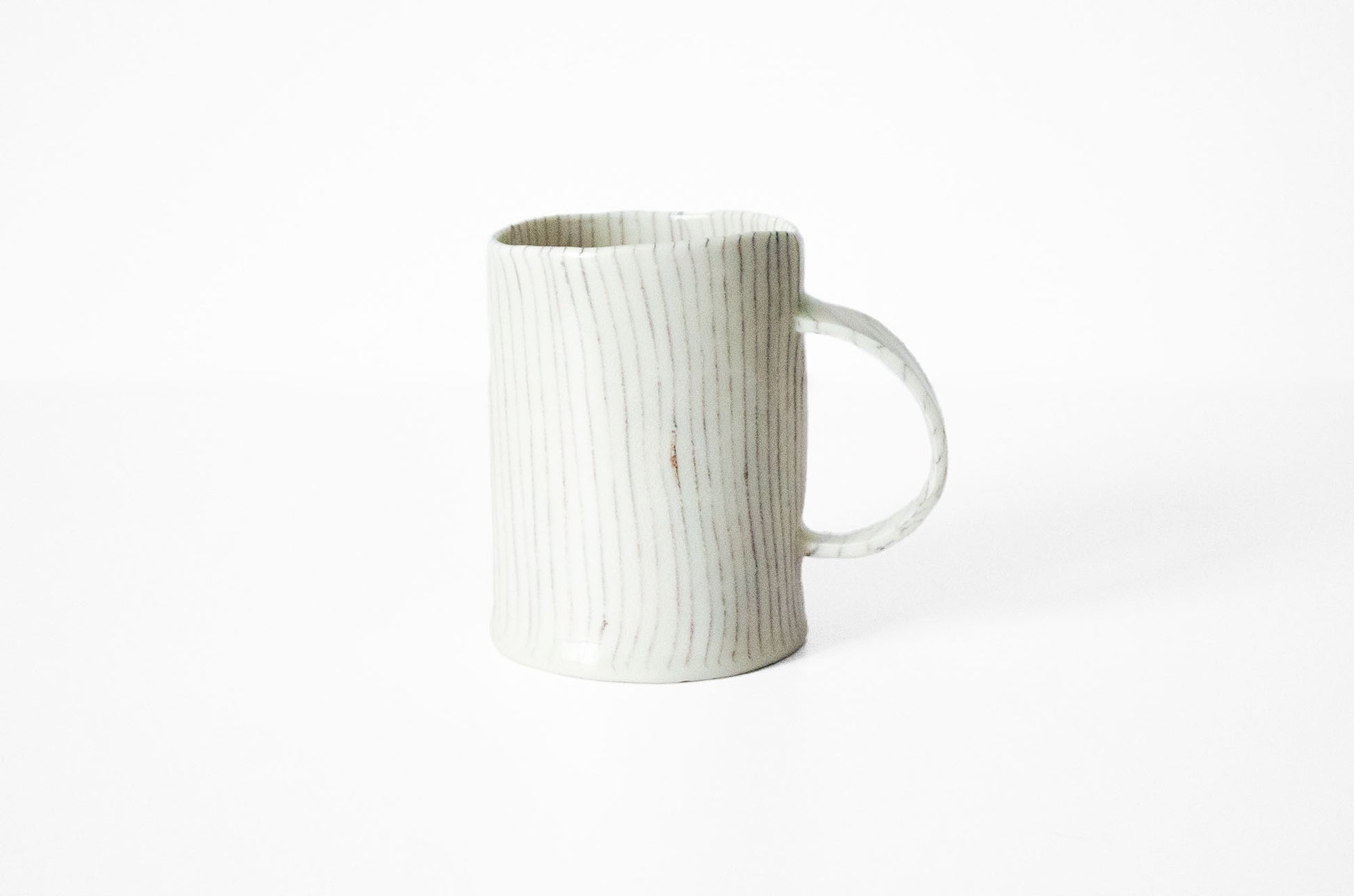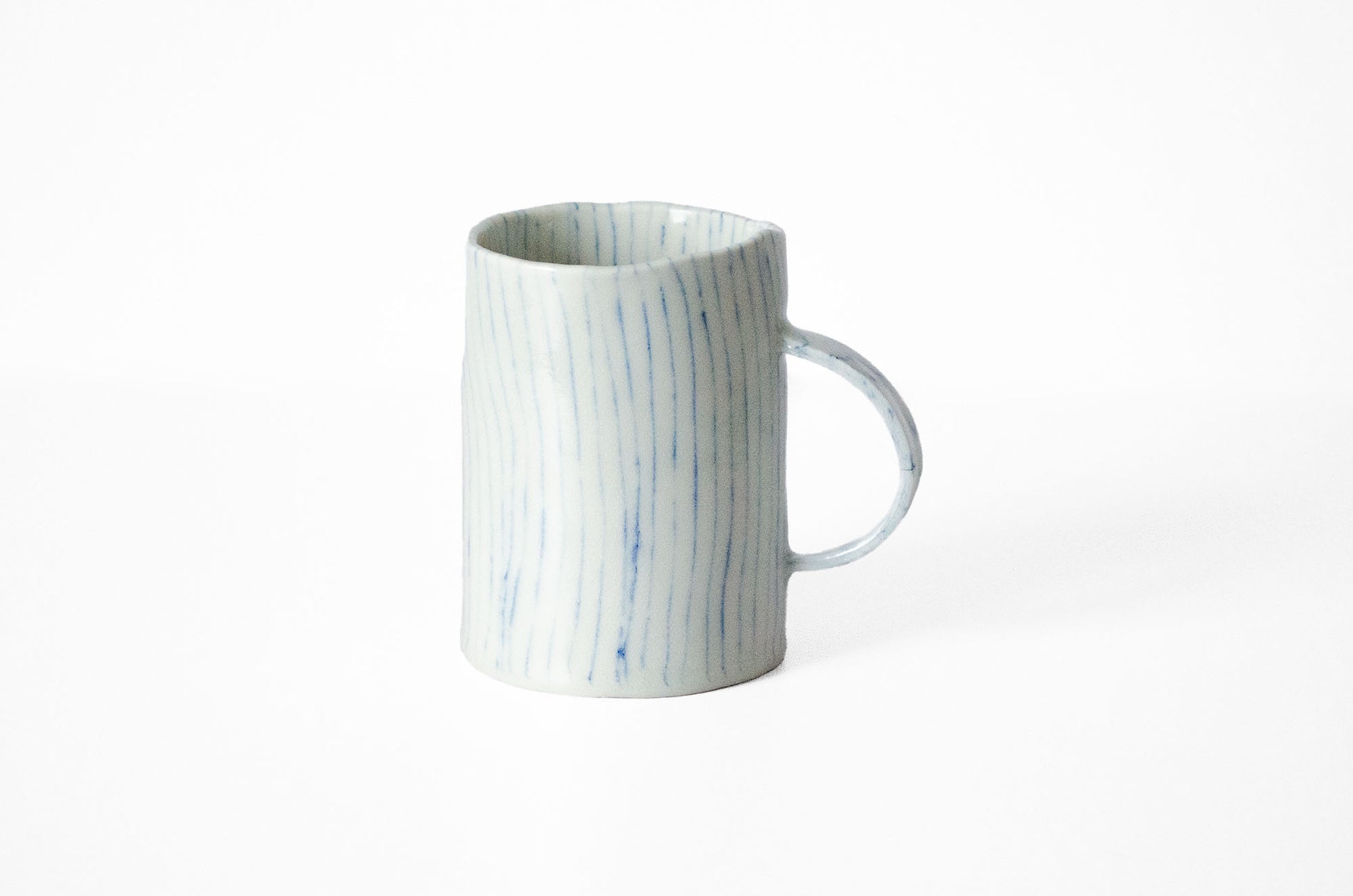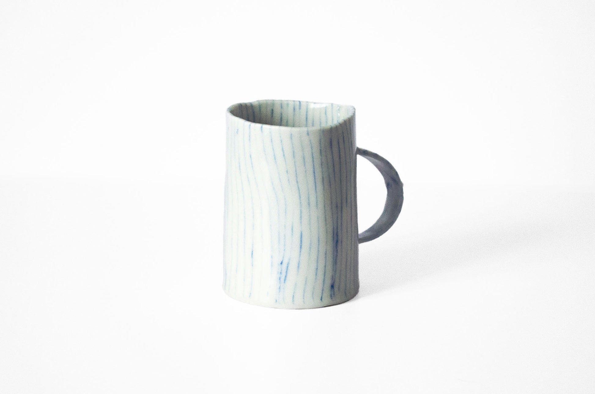 This mug has a chalk stripe pattern made by applying the Nerikomi technique.