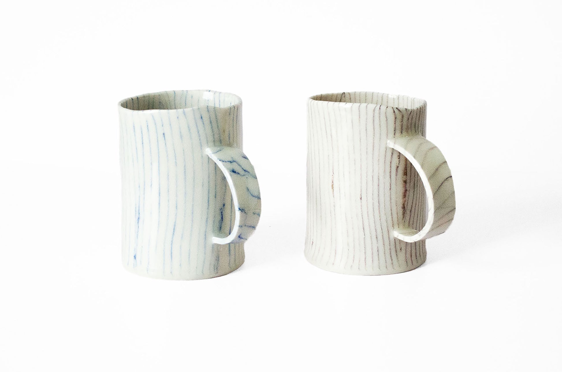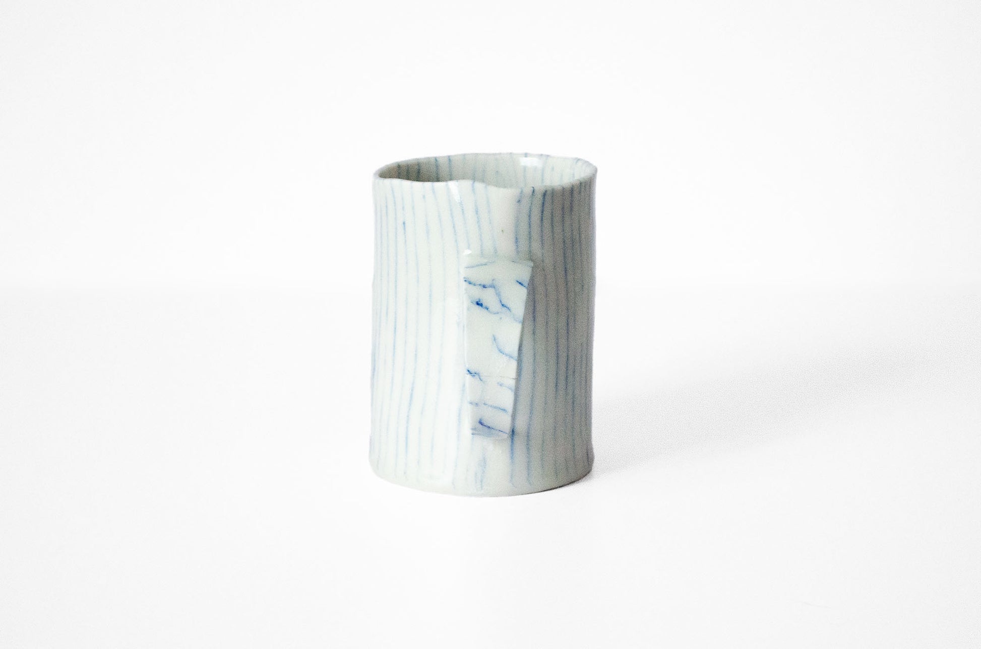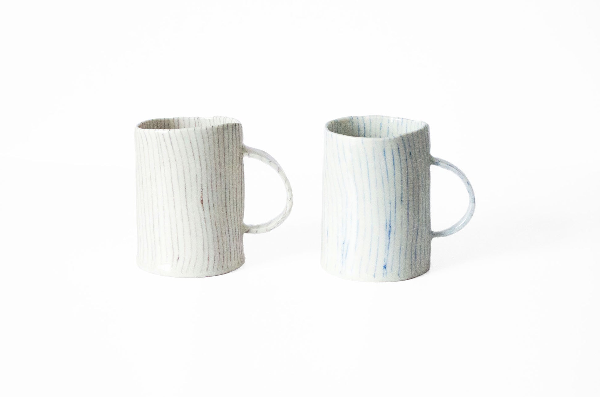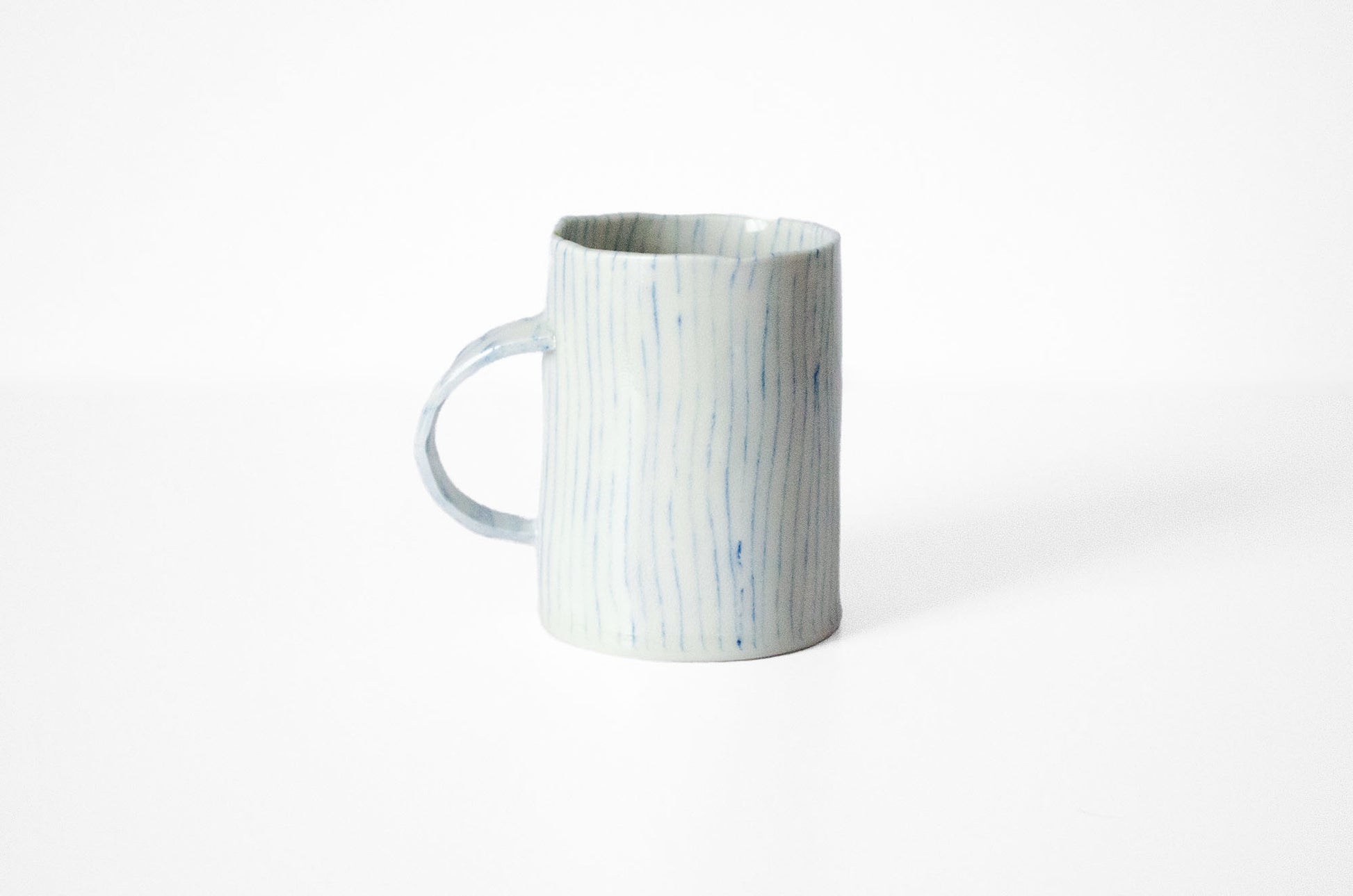 This mug has a chalk stripe pattern made by applying the Nerikomi technique.