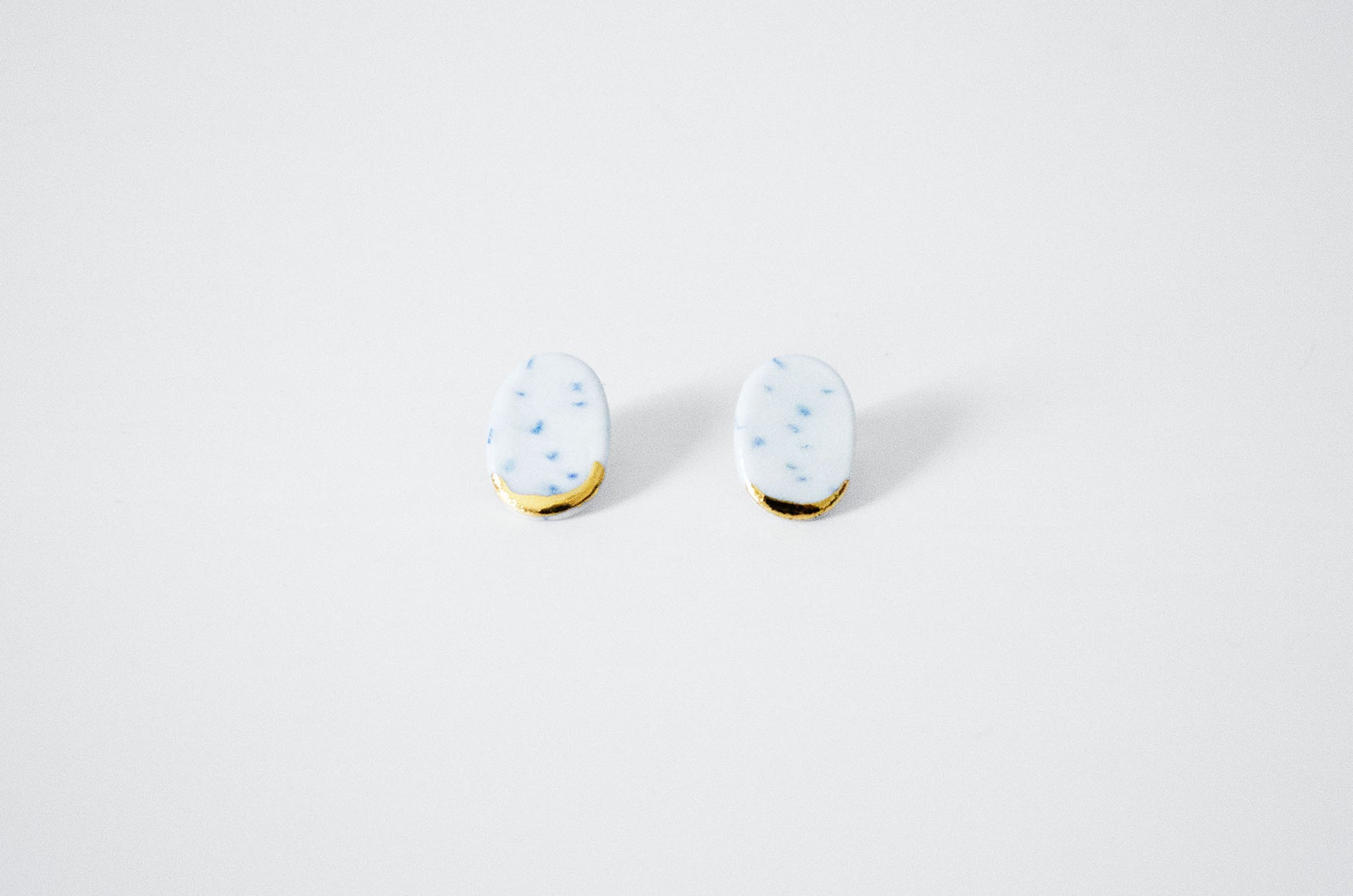 These porcelain earrings feature a modern design with natural blue patterns subtly blending into white porcelain, complemented by bow-shaped gold accents.