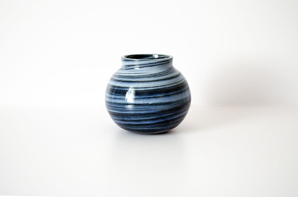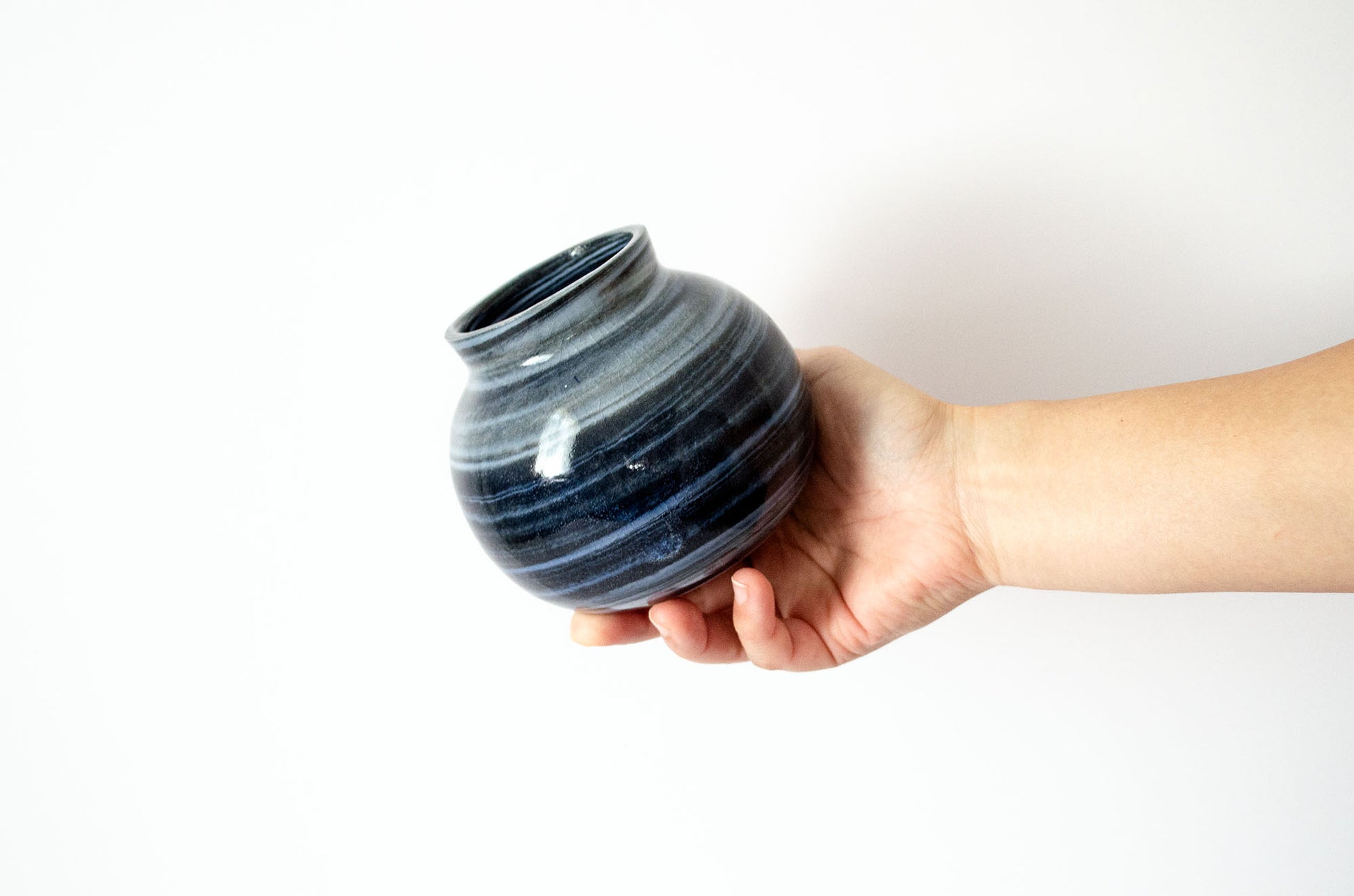 A beautiful blue-black marble pattern is created by forming black colored clay and white porcelain clay using the Neriage technique. This Moon Jar has a glossy texture due to the transparent glaze.