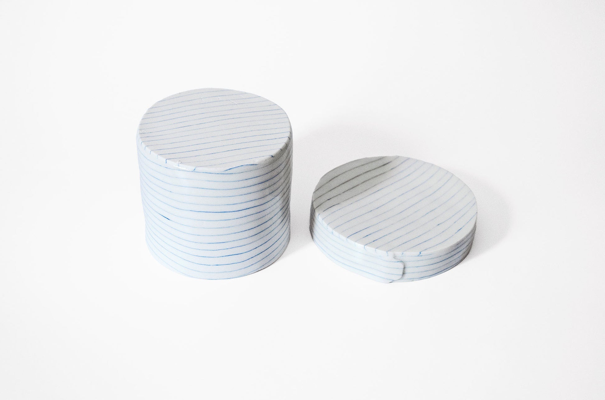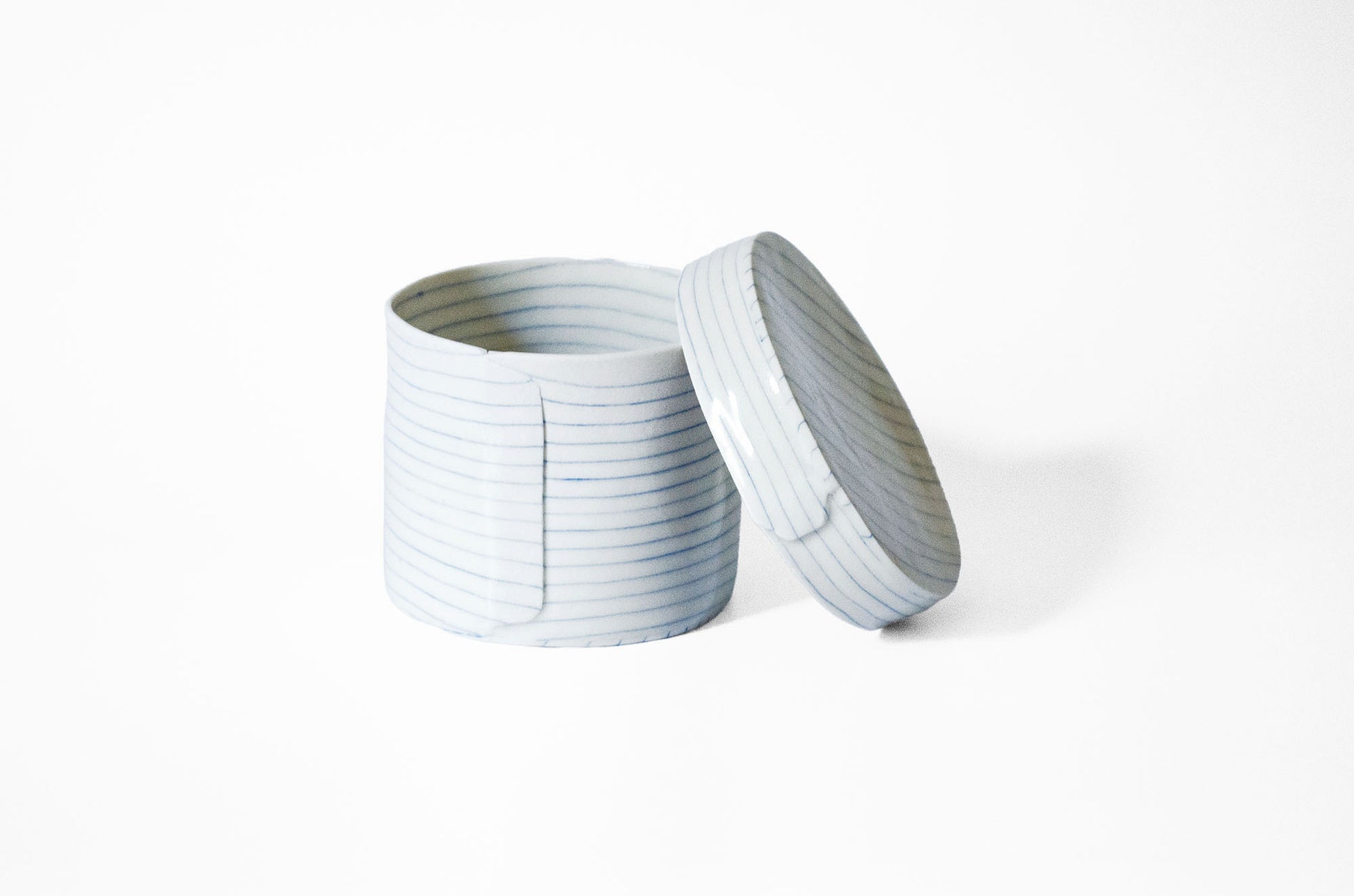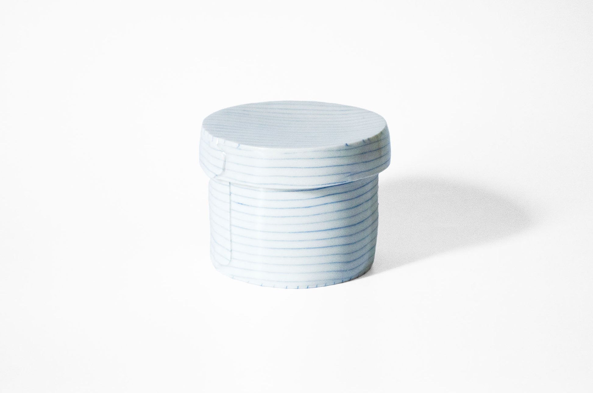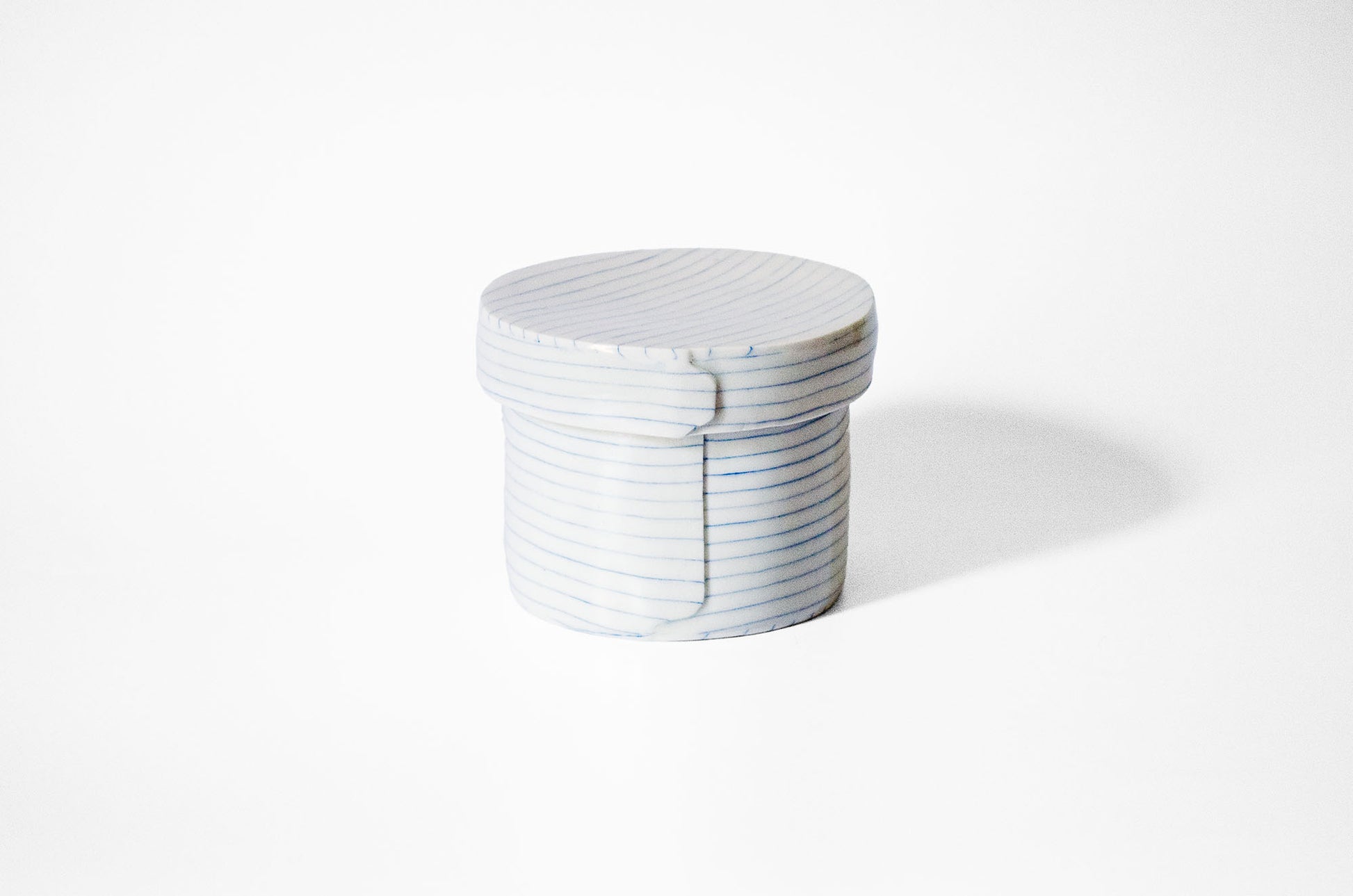 It's a porcelain box, made by forming thin slabs decorated with blue striped patterns using the Nerikomi technique into a cylindrical shape.