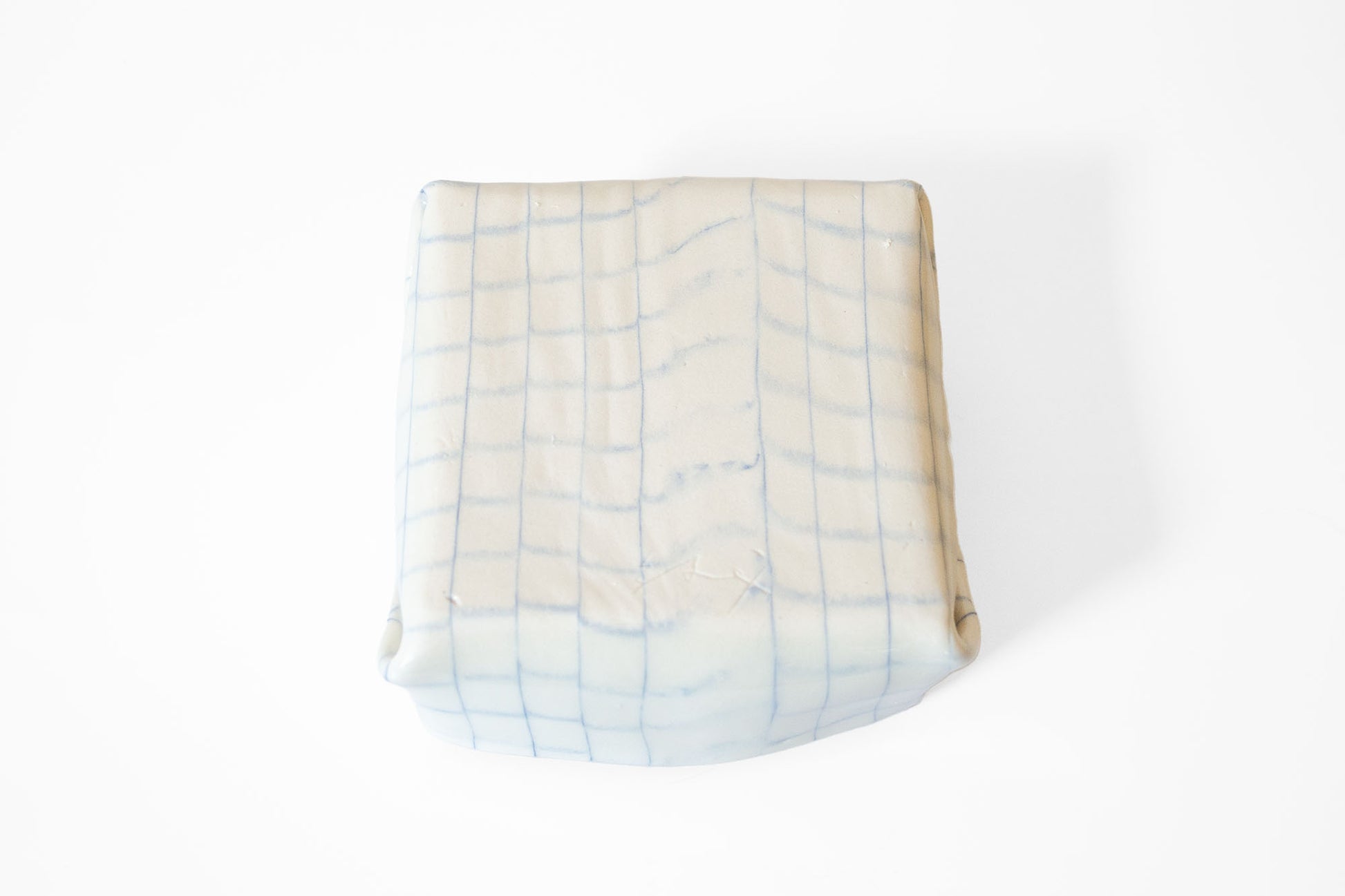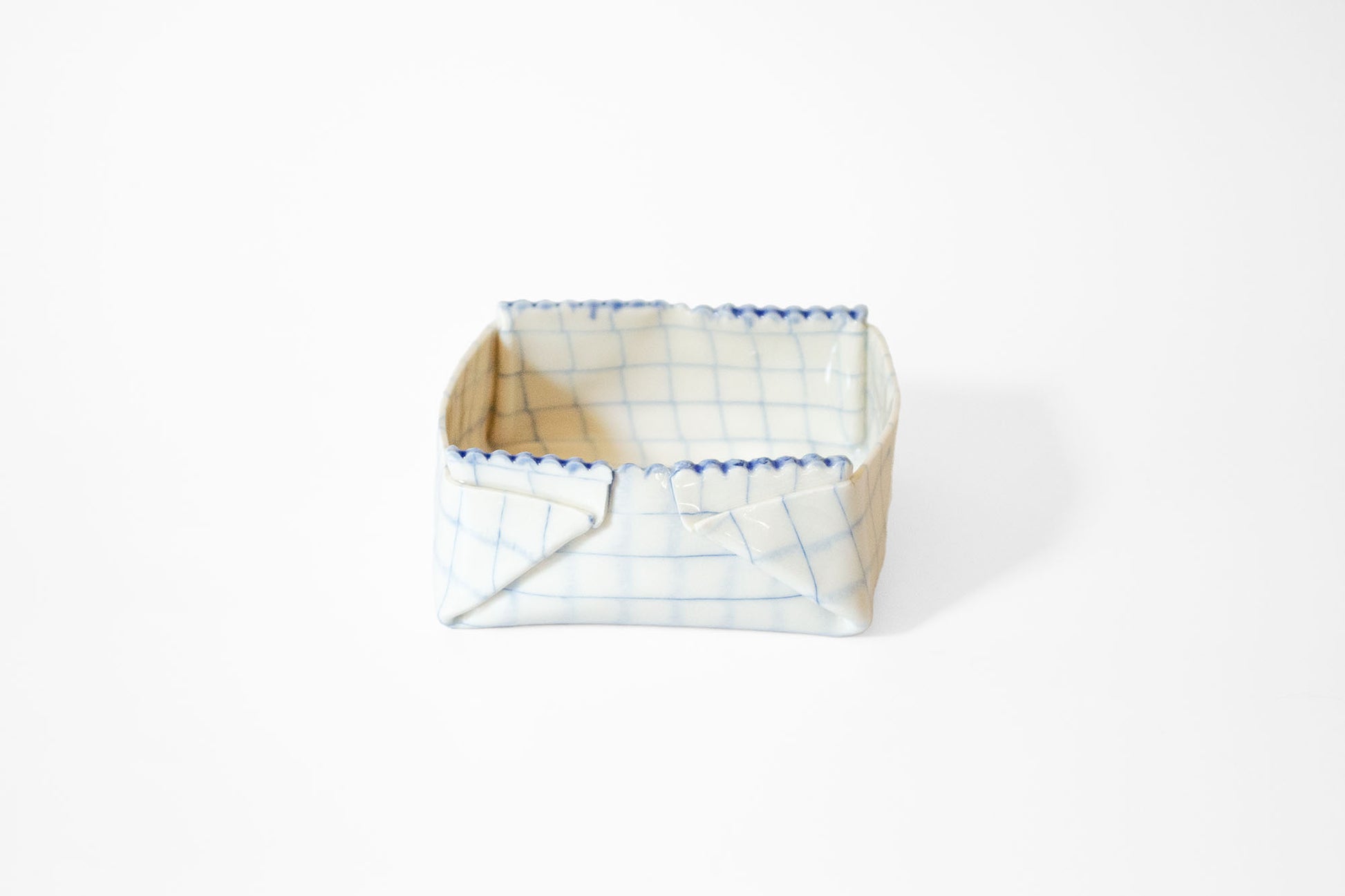 This is a porcelain bowl assembled like origami, with a reversible grid pattern created by the Nerikomi technique and scalloped edges that add a lovely accent.