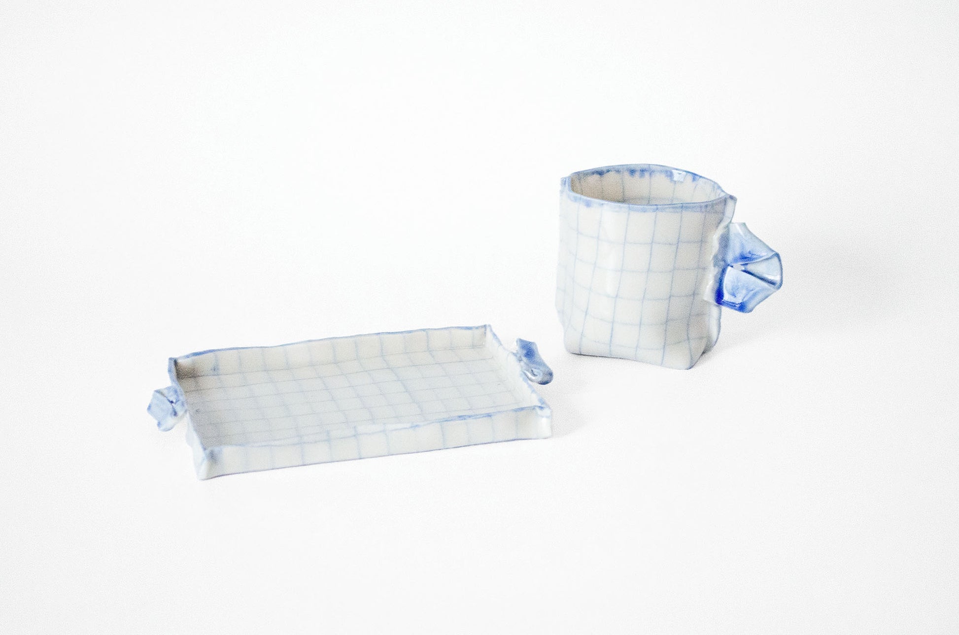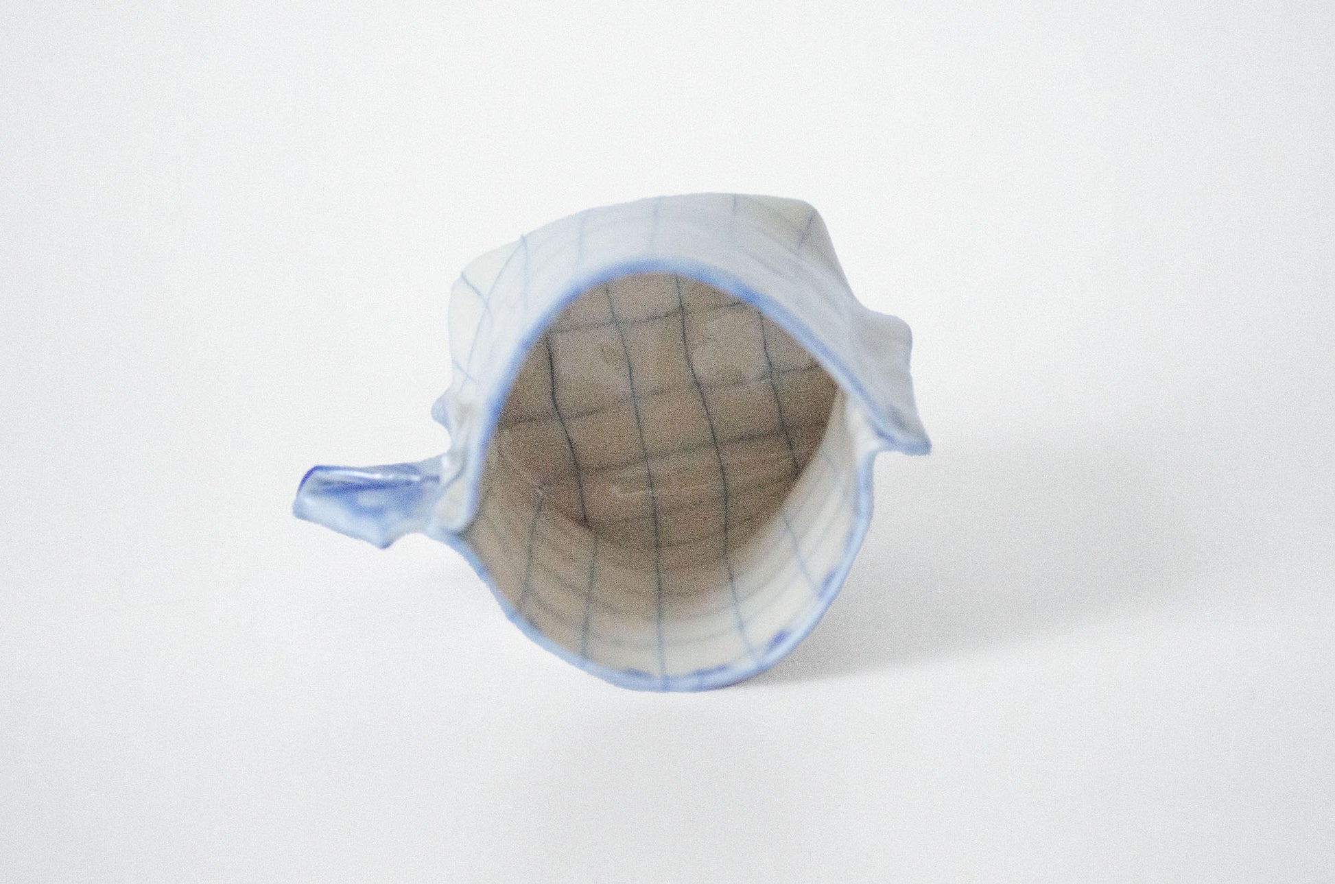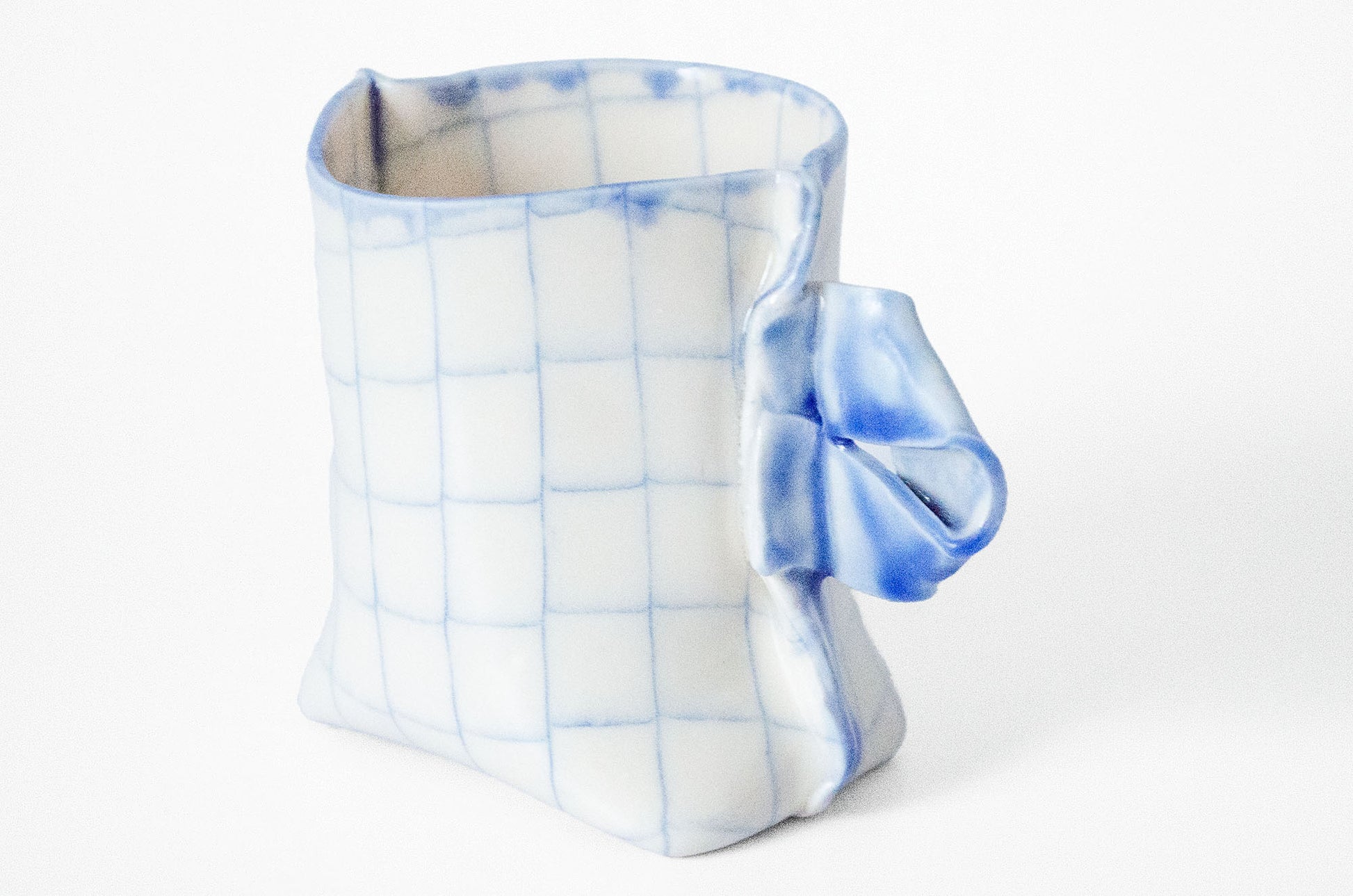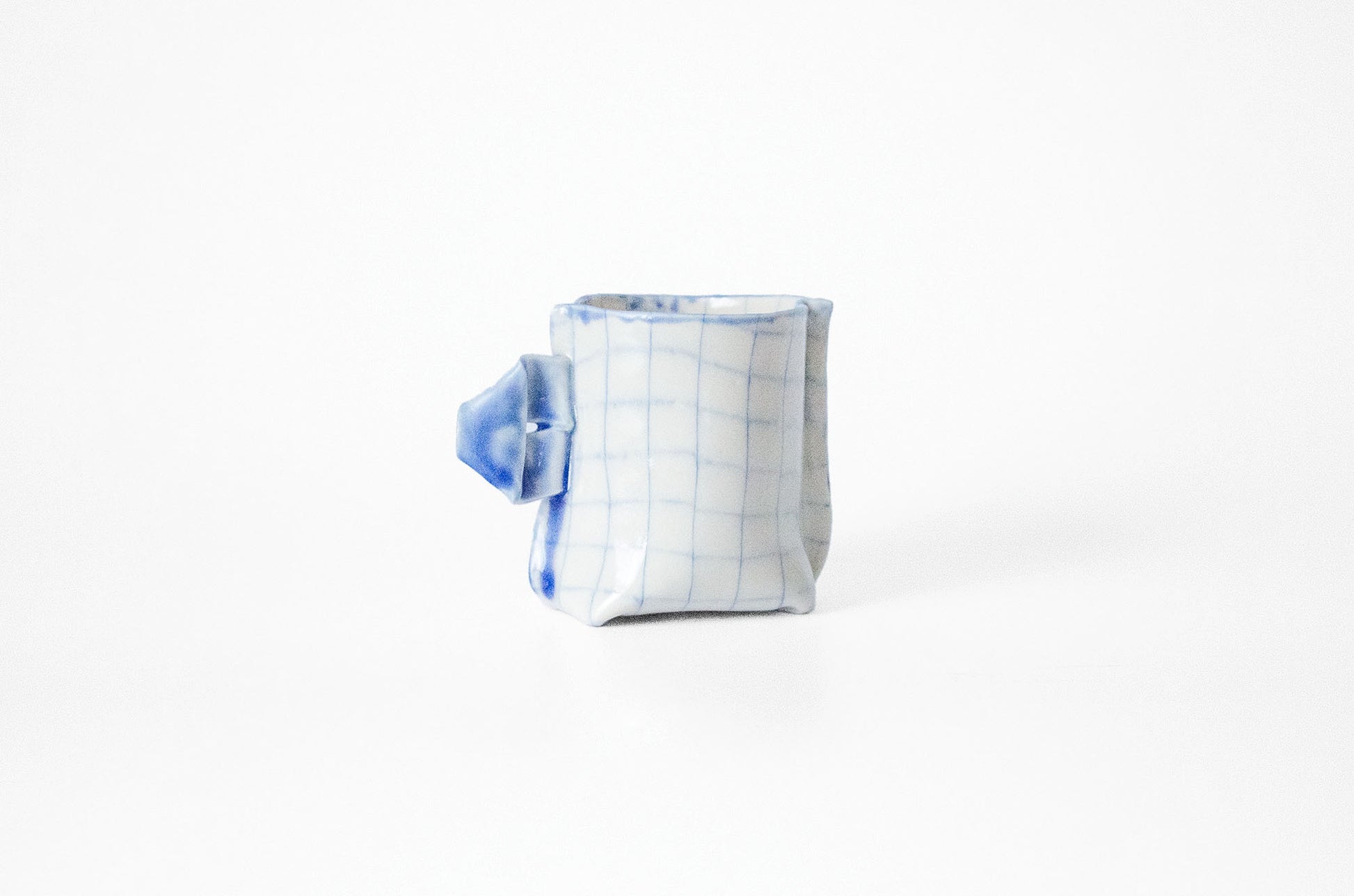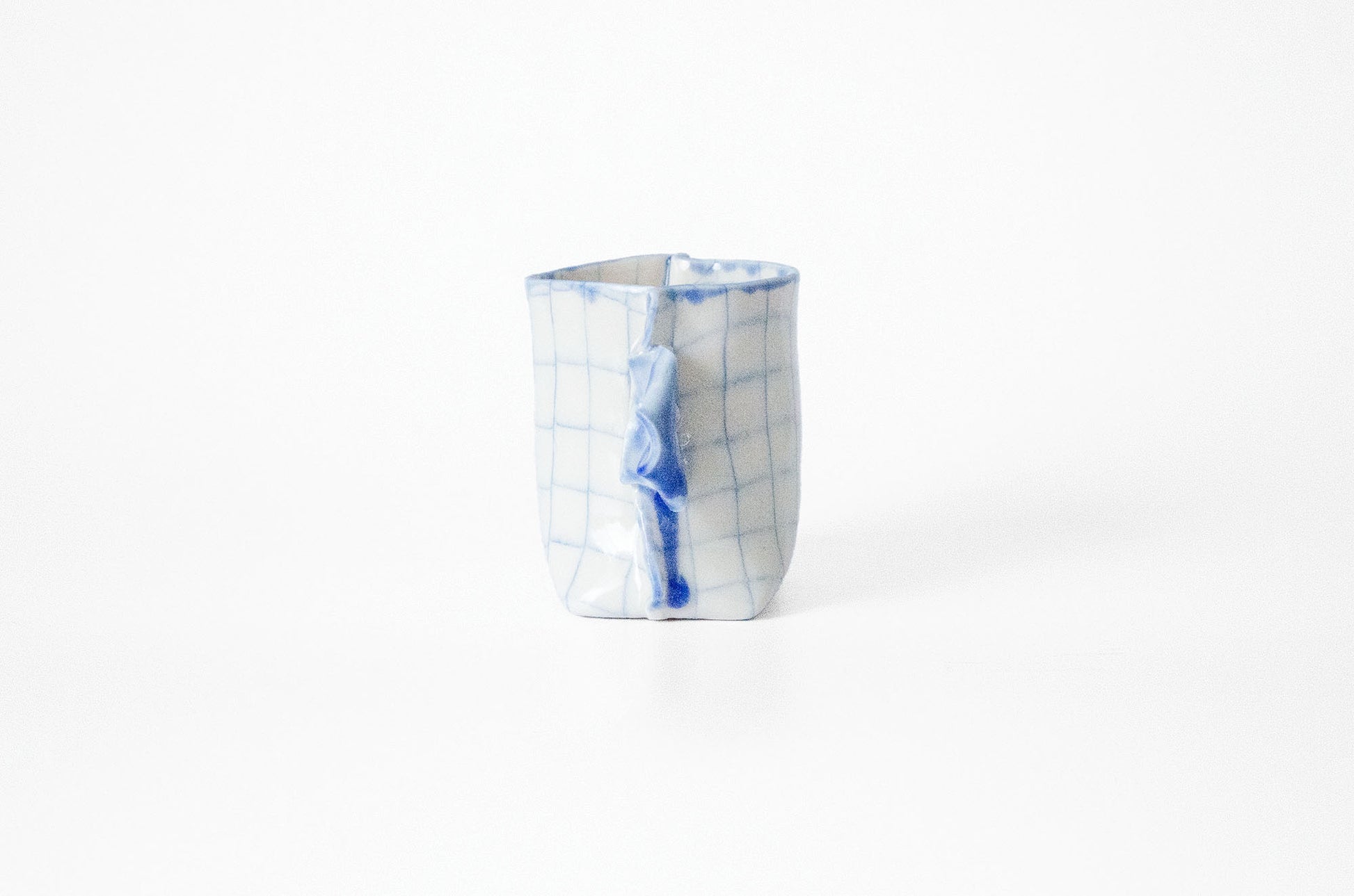 The neat impression of the blue check pattern, created using the Nerikomi technique, makes it look as if a paper cup folded in childhood origami has been transformed into tableware.