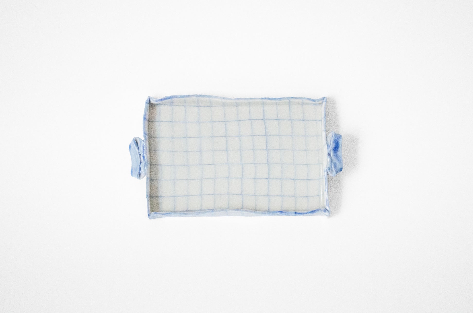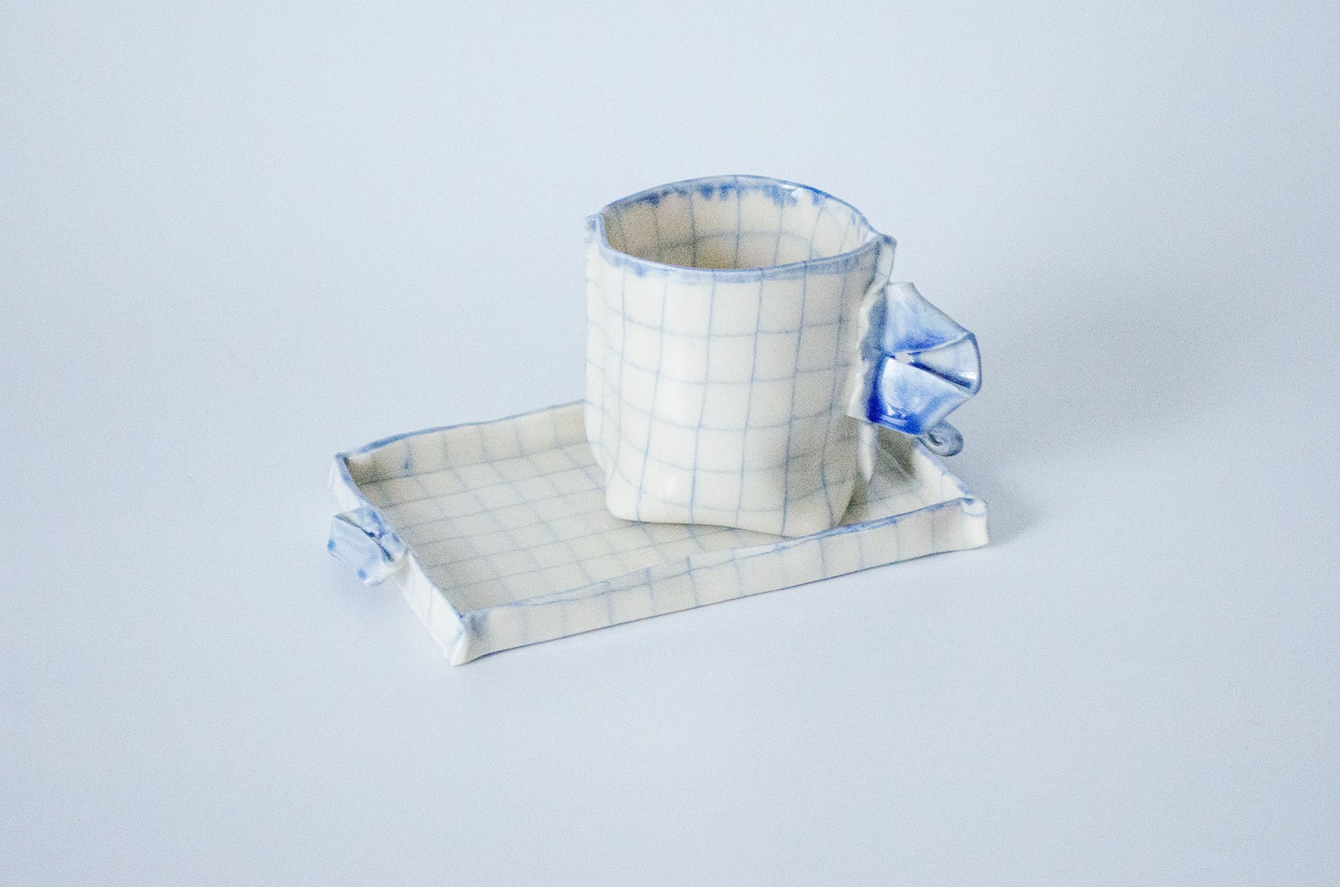 The neat impression of the blue check pattern, created using the Nerikomi technique, makes it look as if a paper tableware folded in childhood origami has been transformed into tableware.