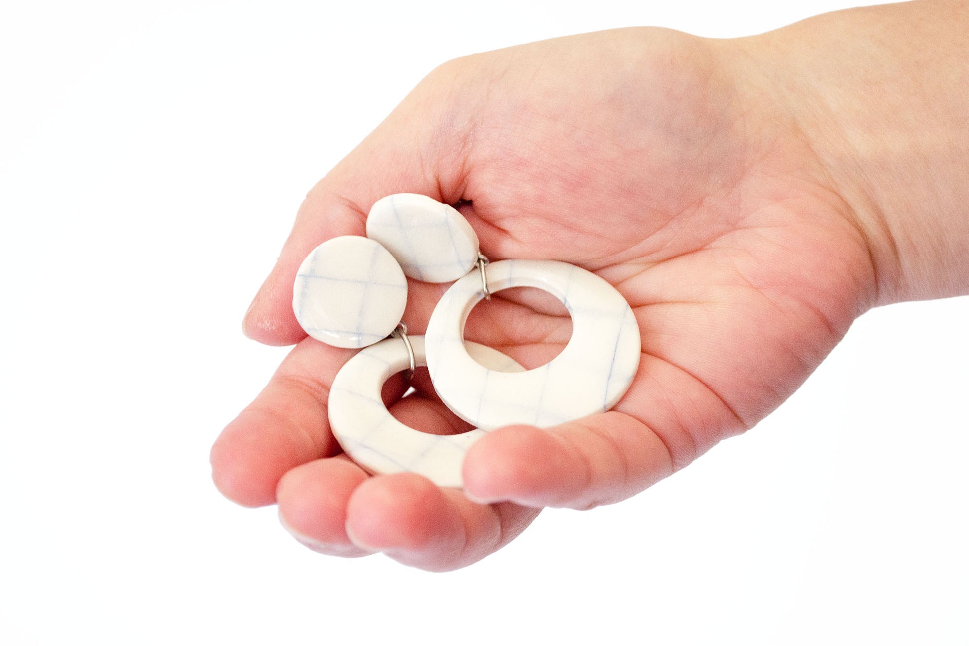 This pair of large porcelain earrings features a combination of round and crescent-shaped hoops.
