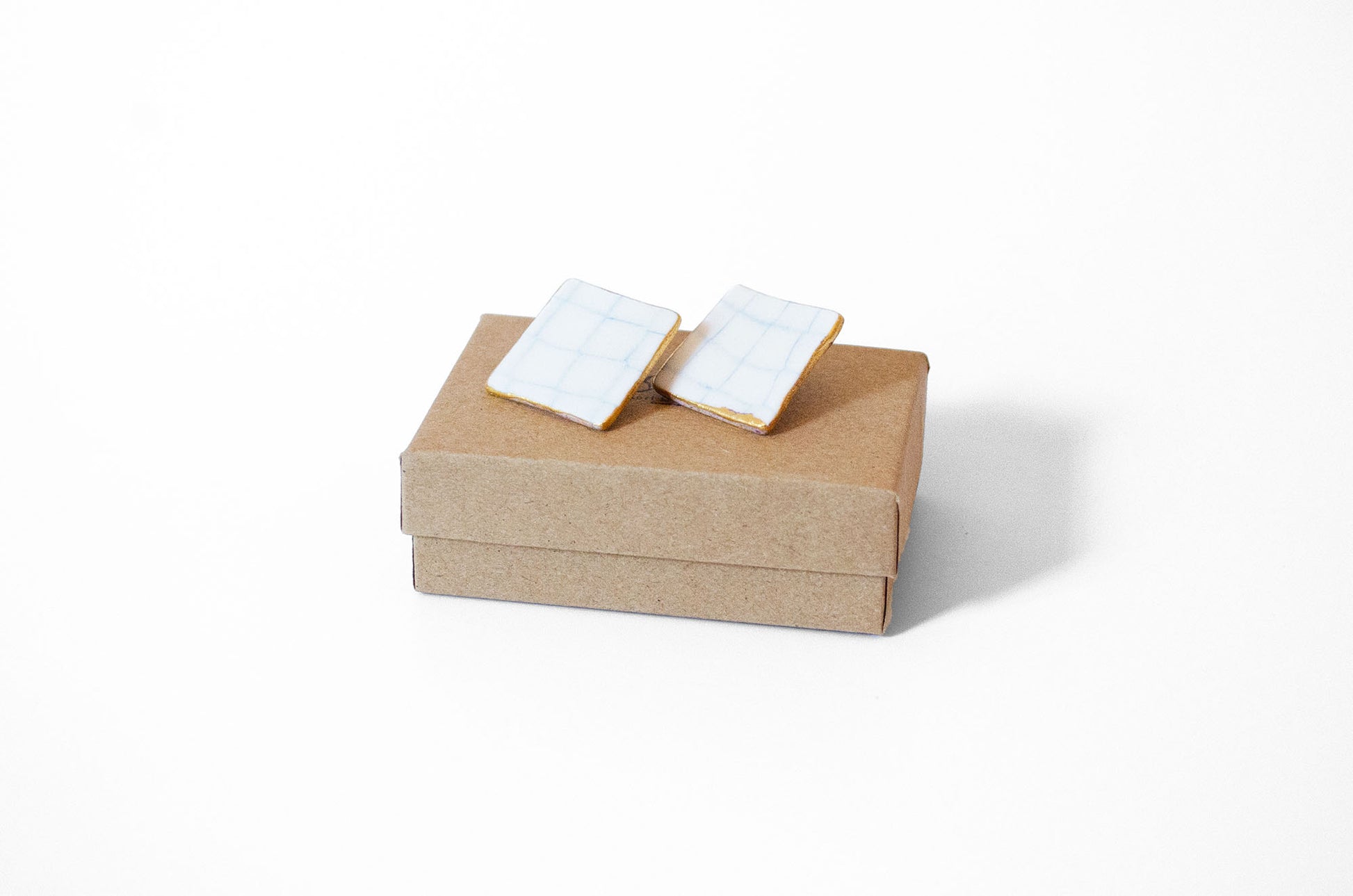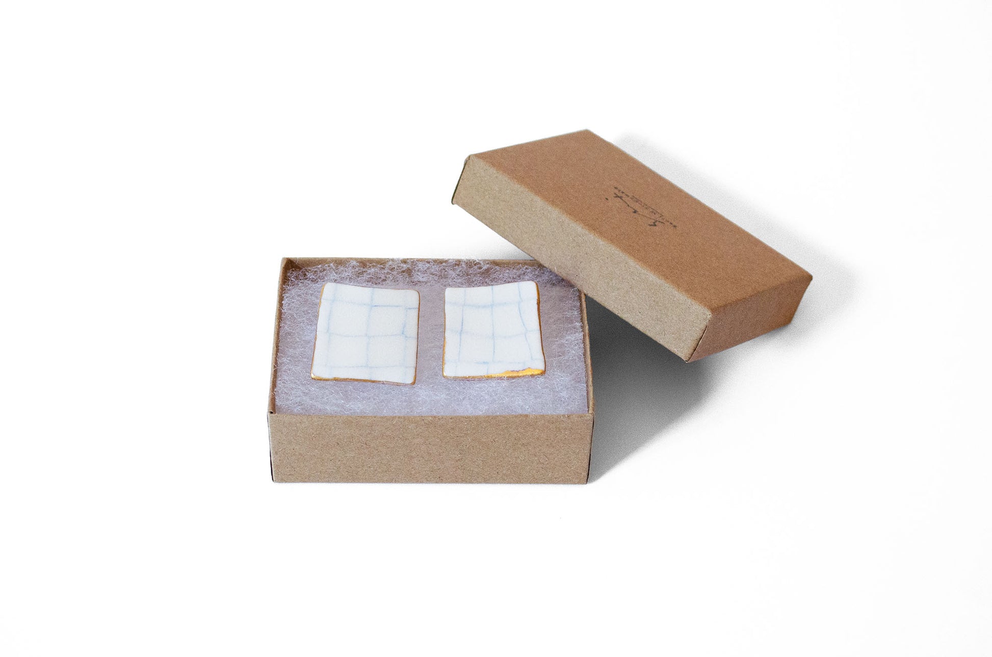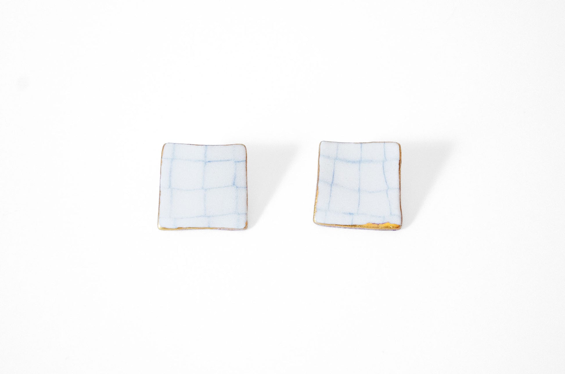 These modern square earrings are made from porcelain using the Nerikomi technique, featuring an organic blue checkered pattern. The edges are accented with gold for a refined touch.