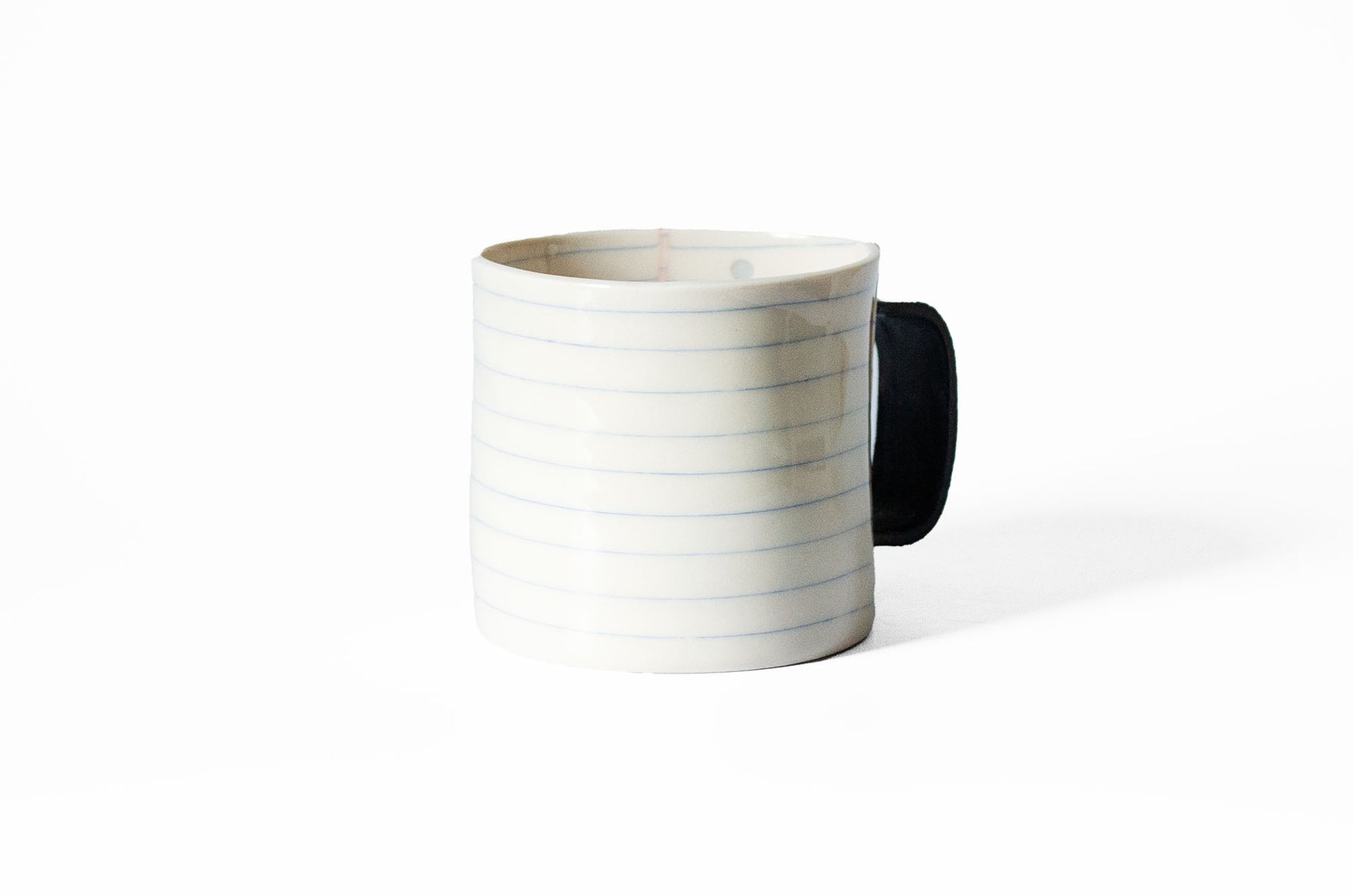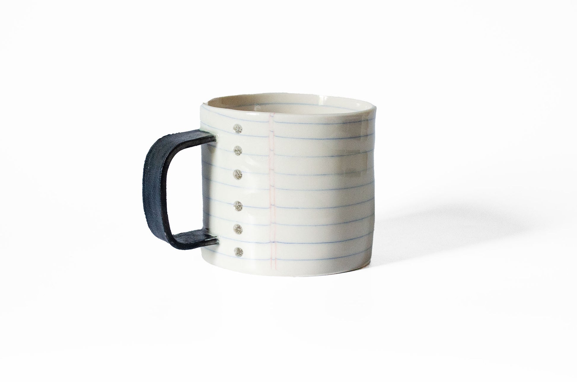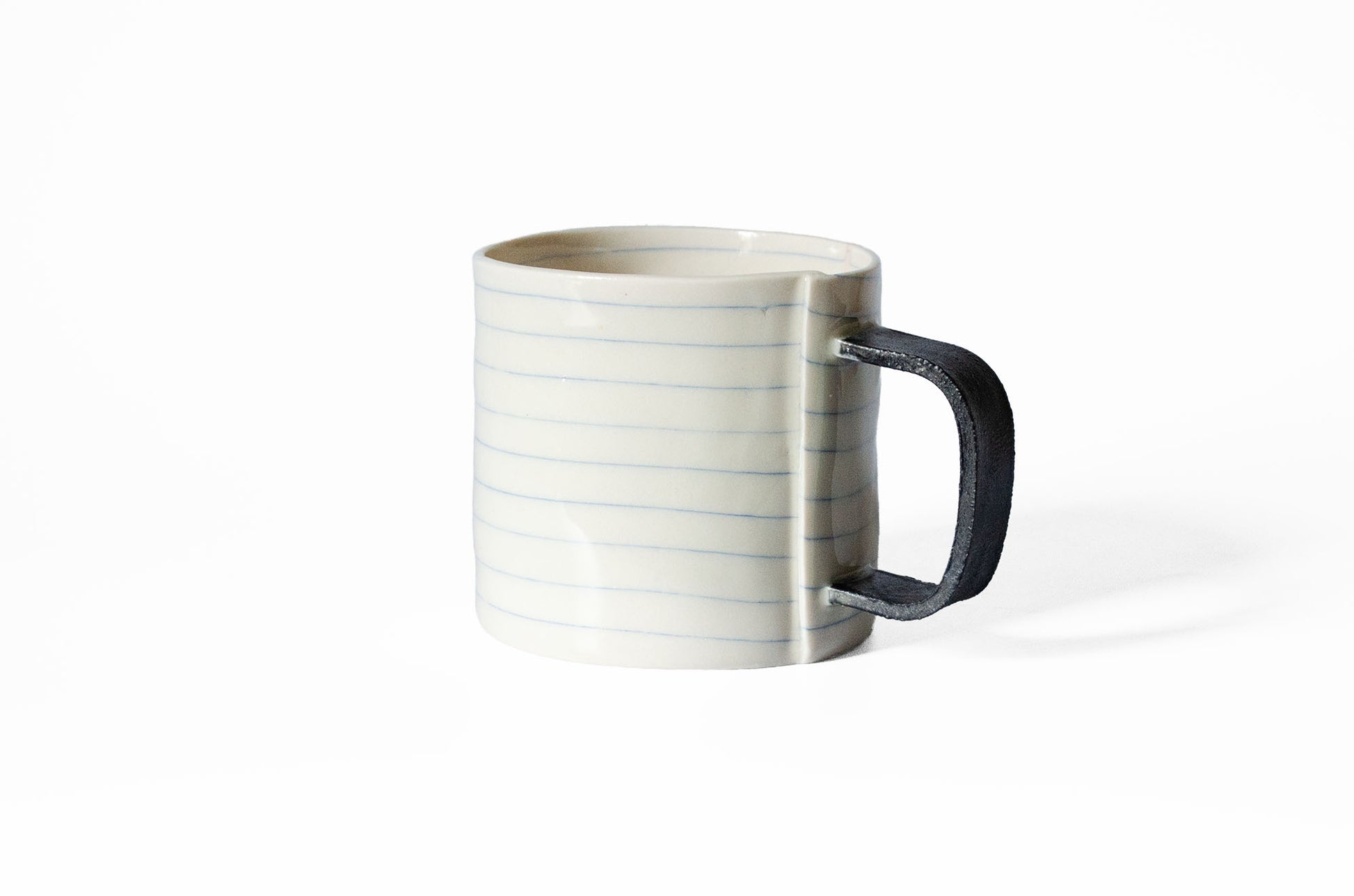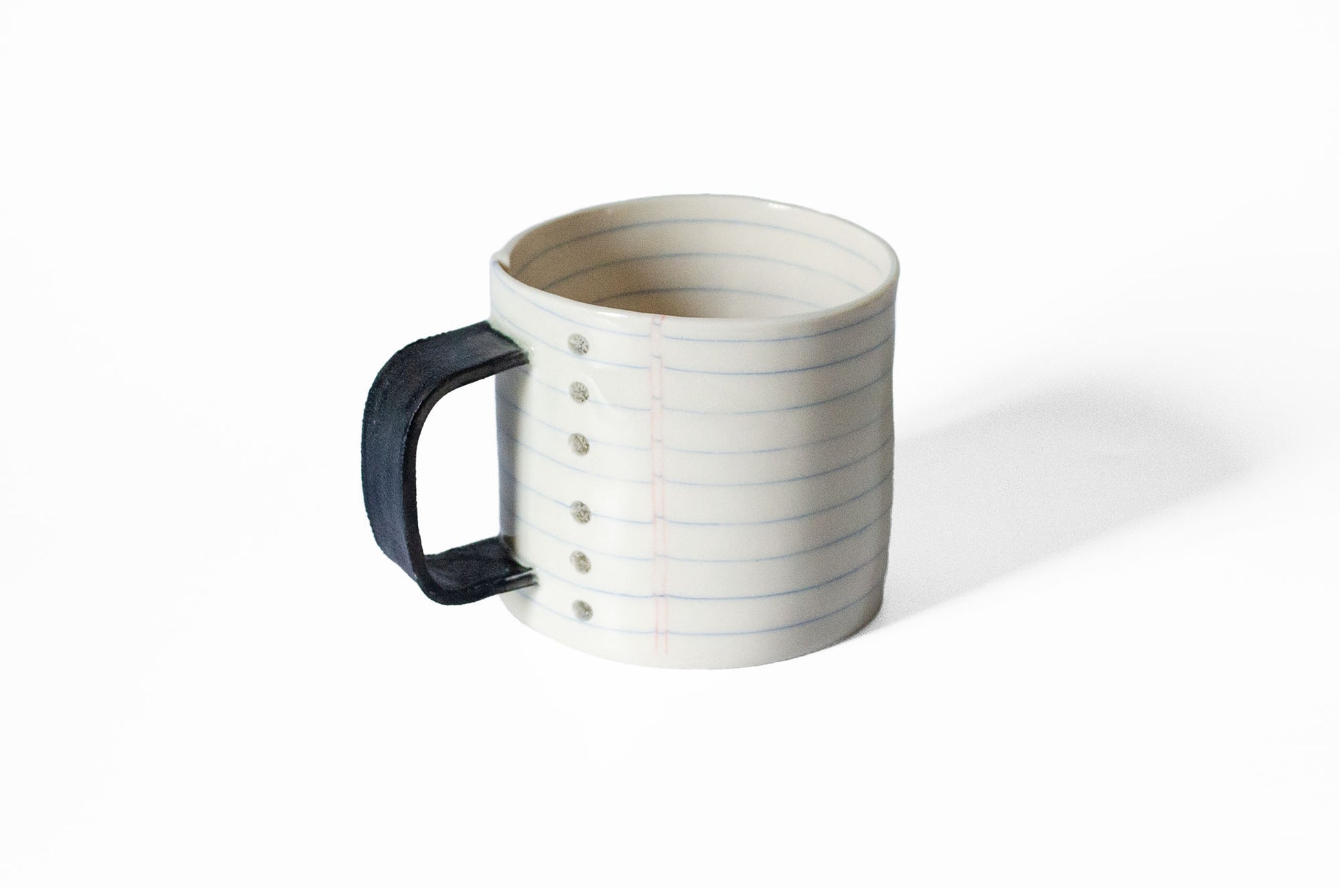 This mug features a design reminiscent of a notepad. The thin, slyghtly translucent white porcelain, akin to paper, is decorated with patterns resembling the ruled lines of a notebook using the Nerikomi technique. The playful design includes punch holes resembling loose-leaf paper.