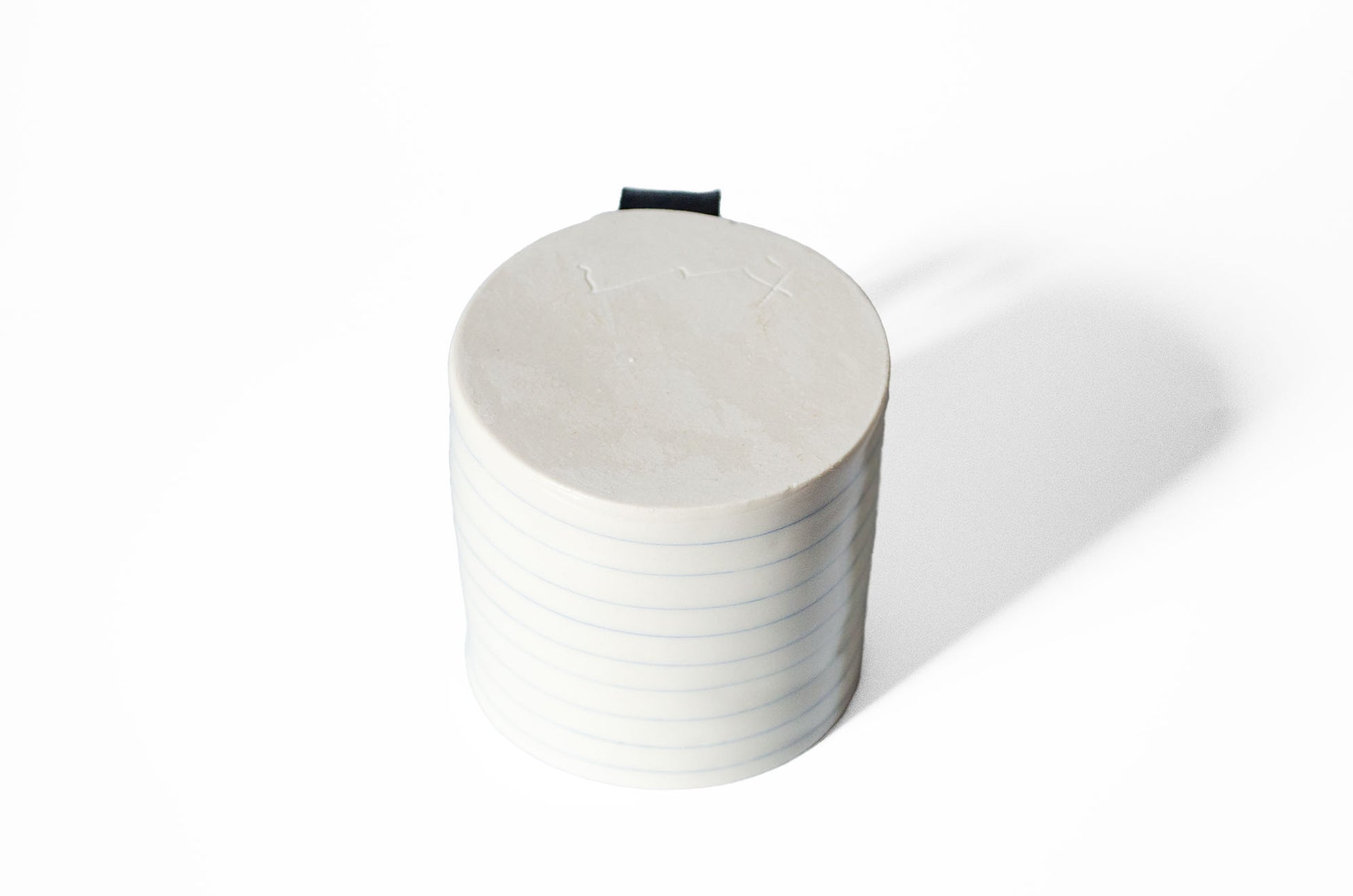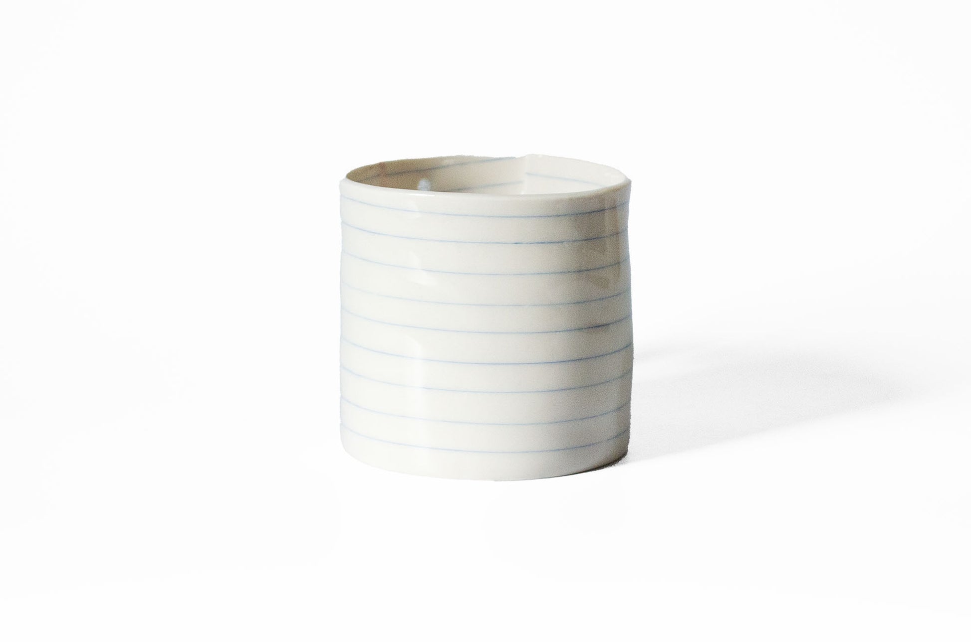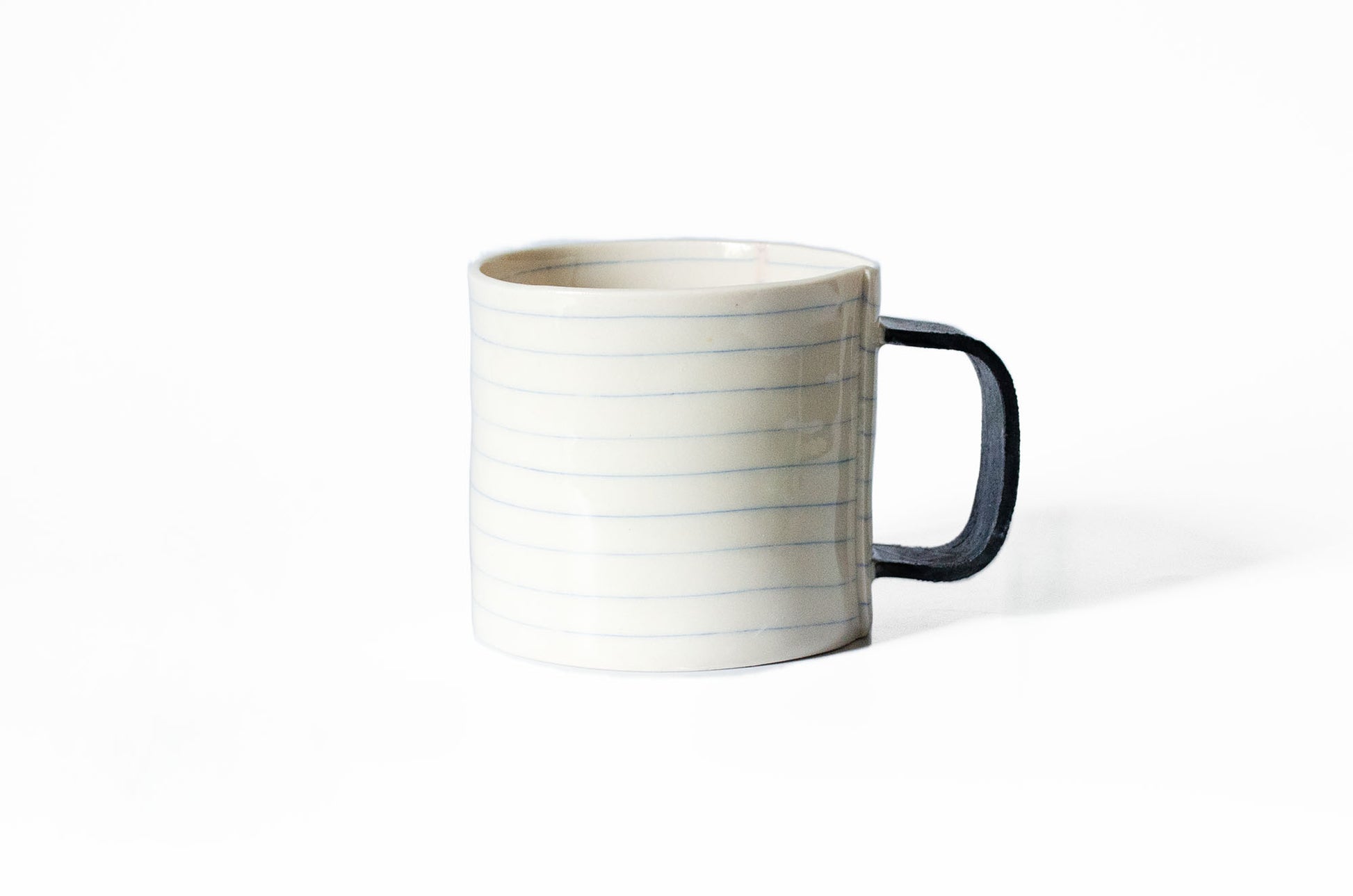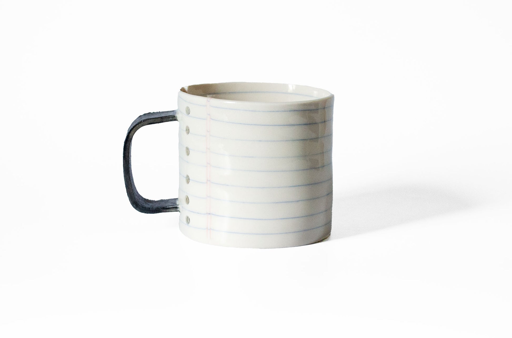 This mug features a design reminiscent of a notepad. The thin, slyghtly translucent white porcelain, akin to paper, is decorated with patterns resembling the ruled lines of a notebook using the Nerikomi technique. The playful design includes punch holes resembling loose-leaf paper.