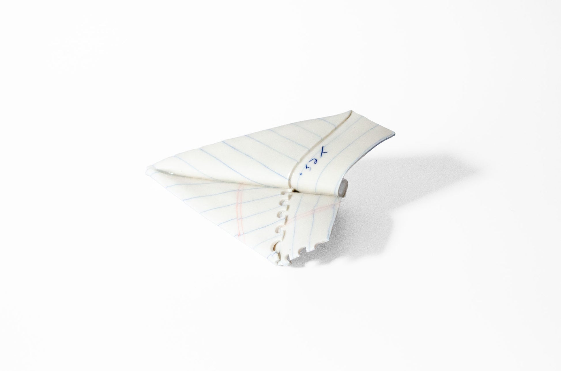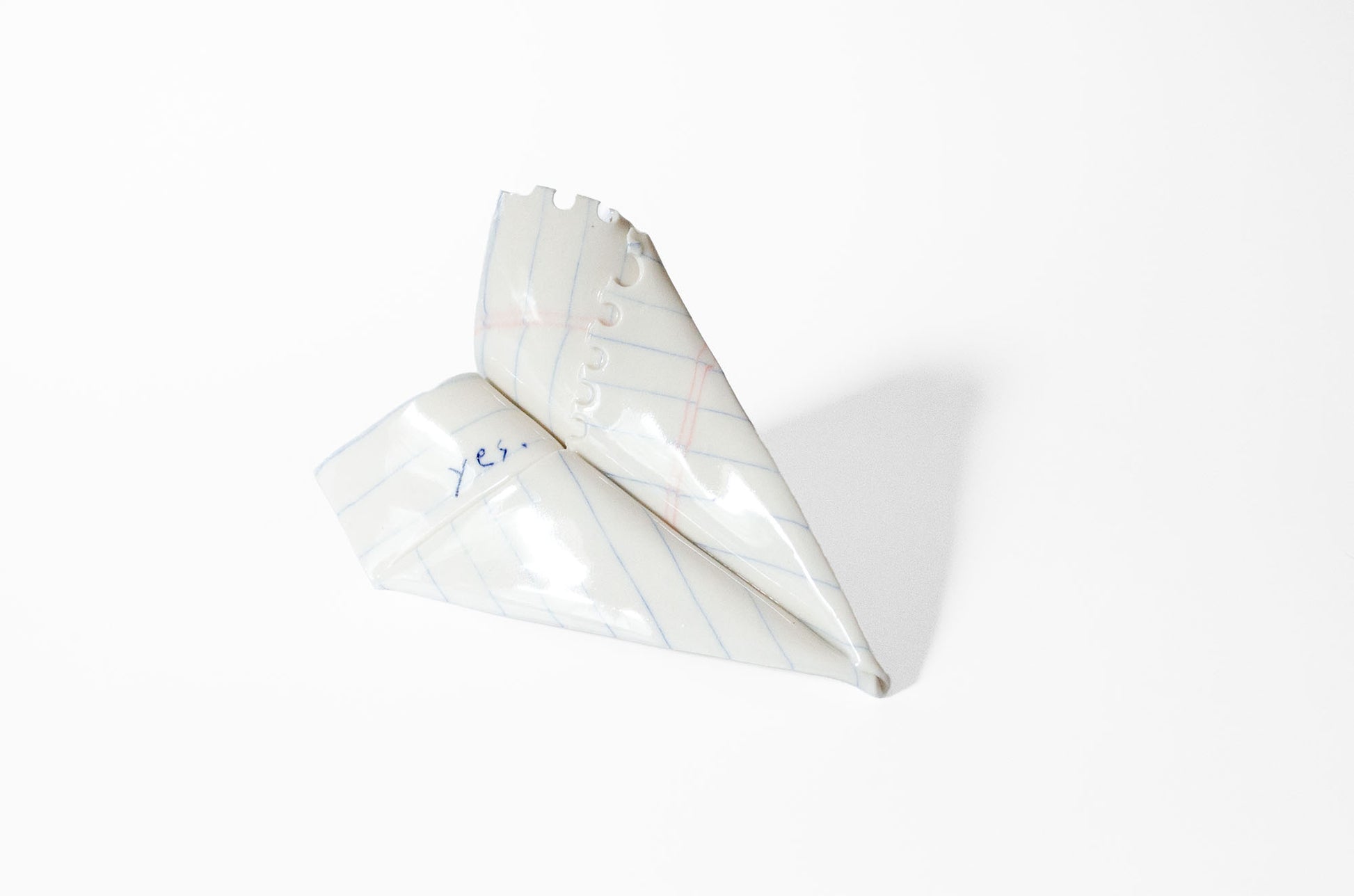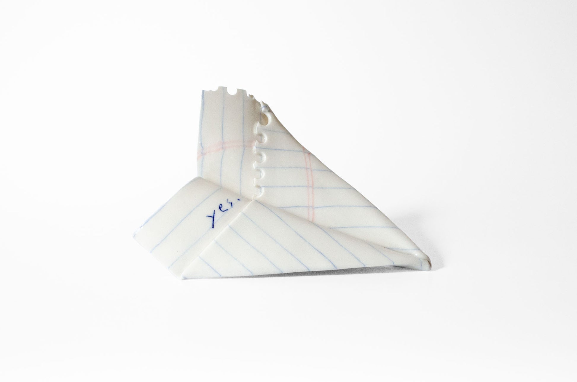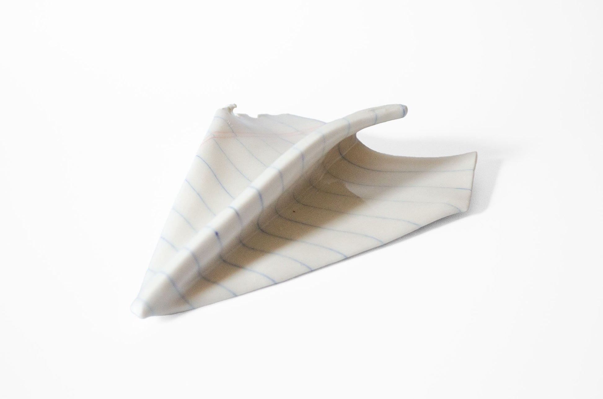 This is a porcelain sculpture: a notepad-like pattern created by the Nerikomi technique, punch-hole marks like torn-out notebooks, and a three-dimensional piece made to look like origami. All of these characteristics make this work unique.