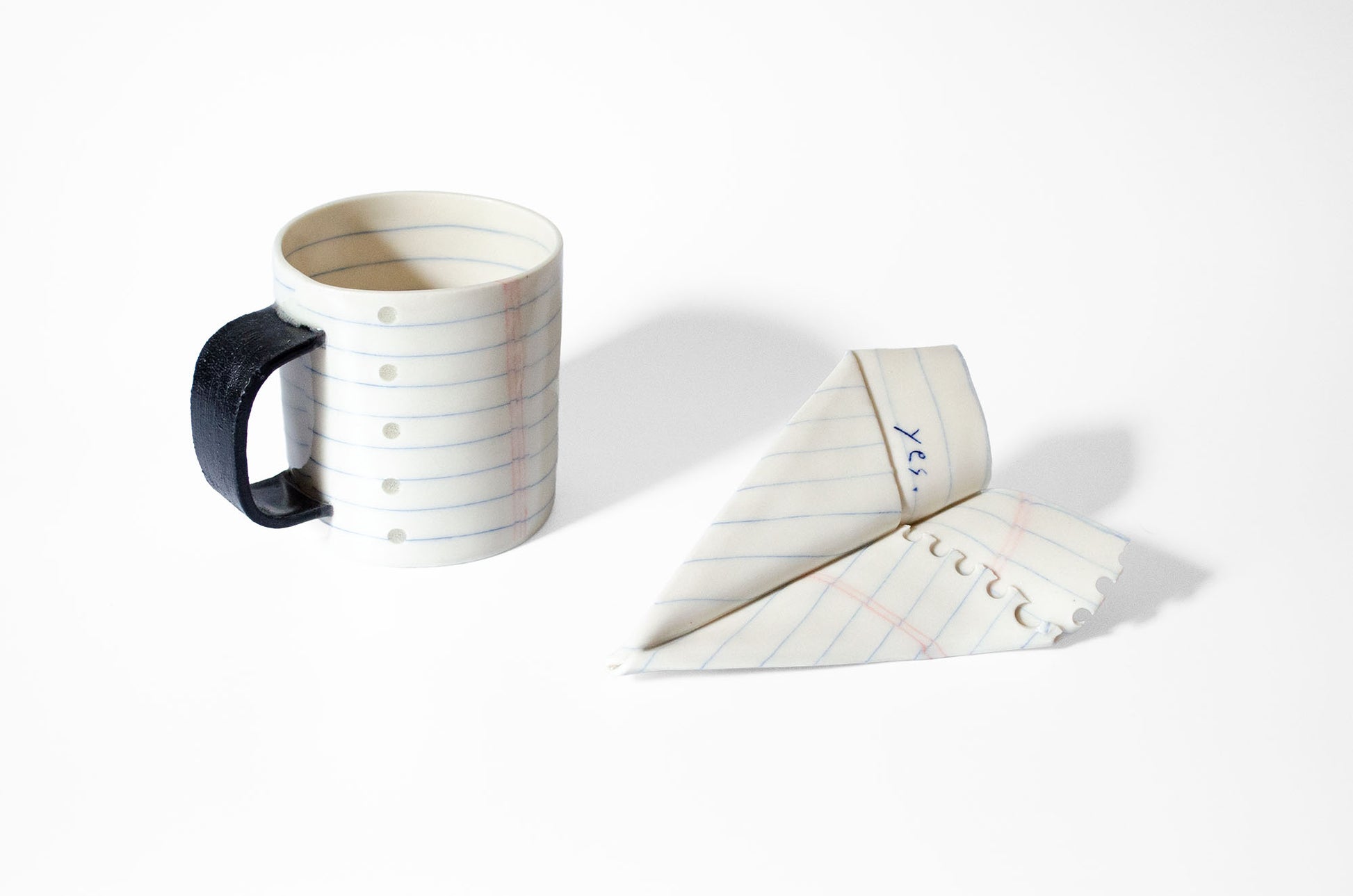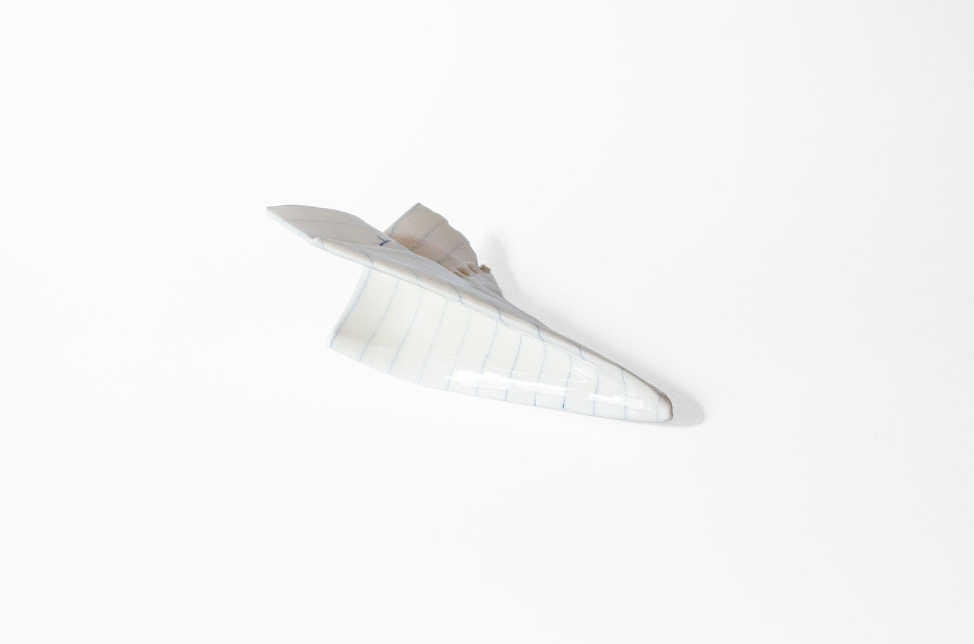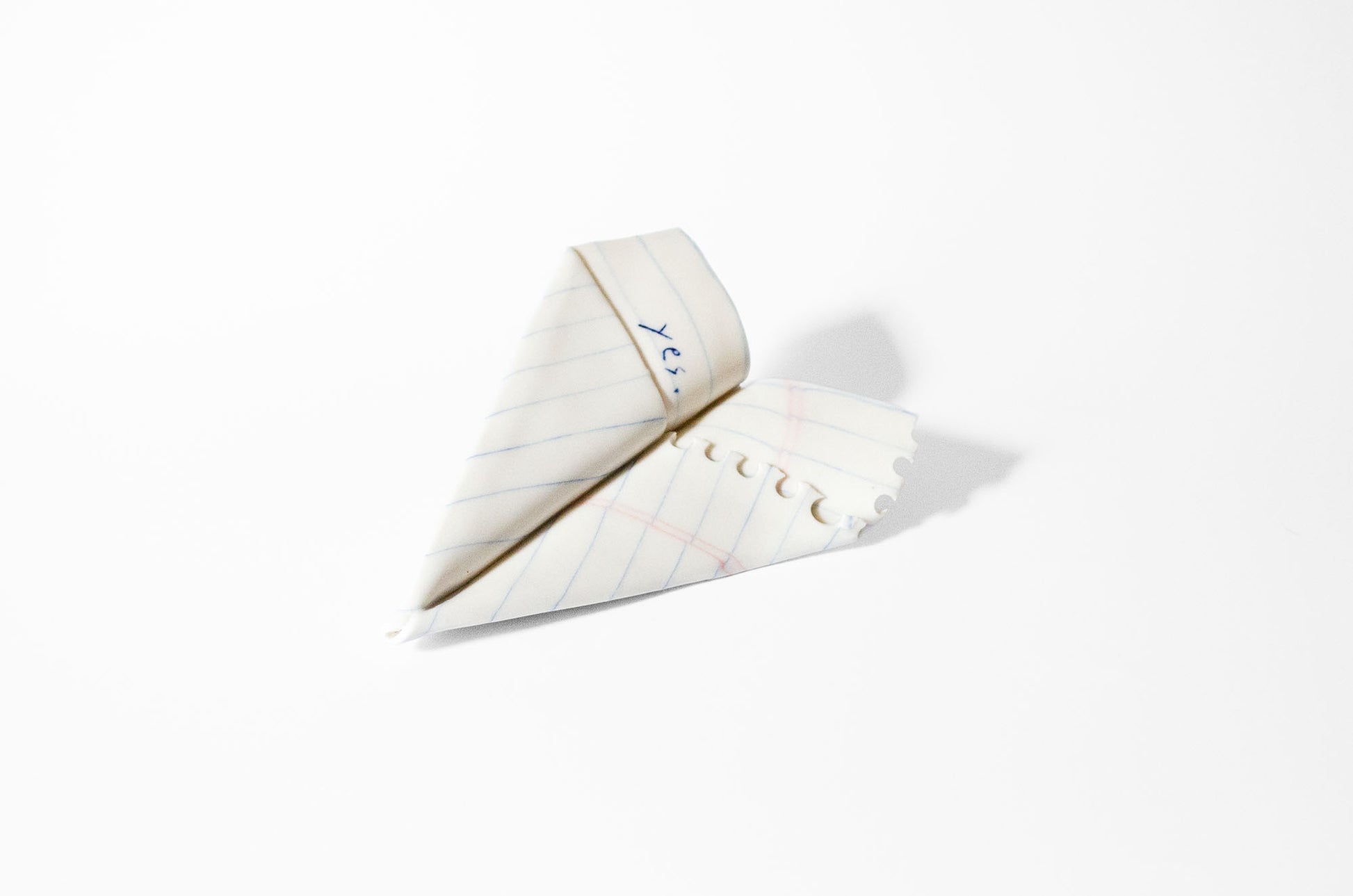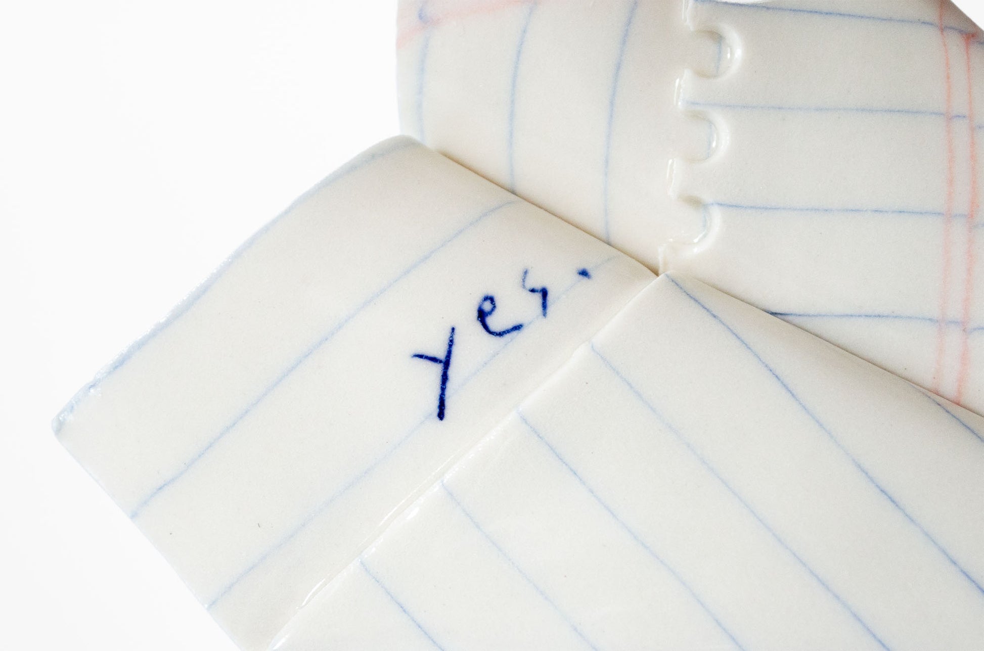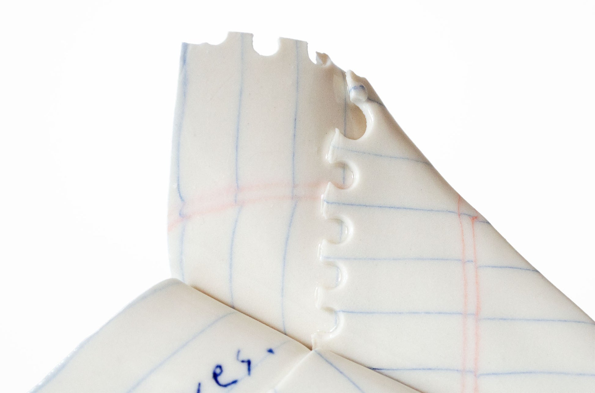 This is a porcelain sculpture: a notepad-like pattern created by the Nerikomi technique, punch-hole marks like torn-out notebooks, and a three-dimensional piece made to look like origami. All of these characteristics make this work unique.