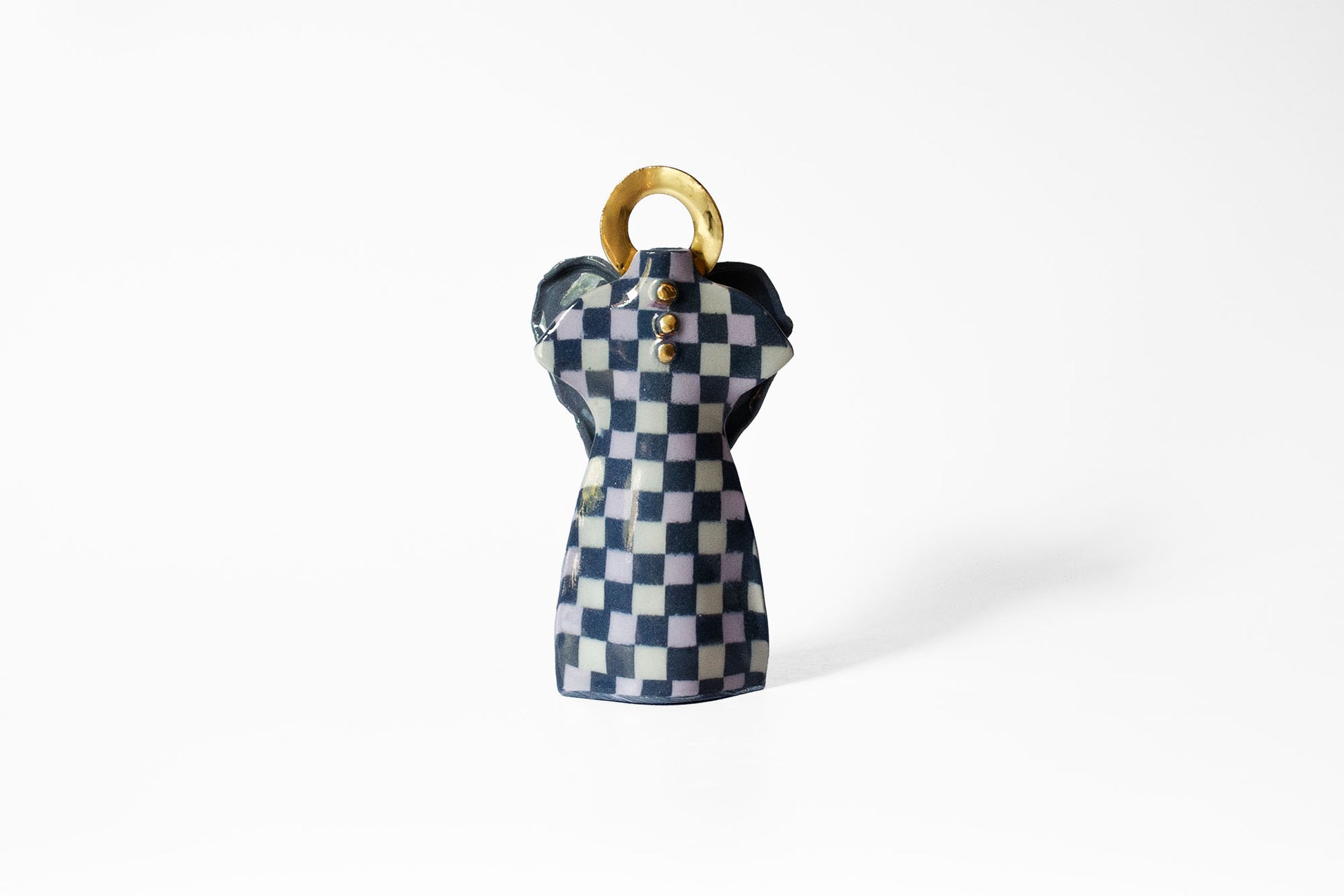 The entire surface is coated with a glossy transparent glaze, while the collar and buttons have a pure gold glaze, creating a distinctive texture that is characteristic of handmade ceramics.