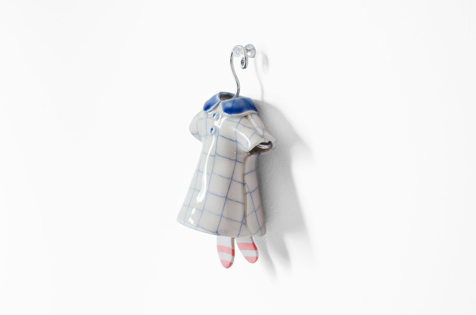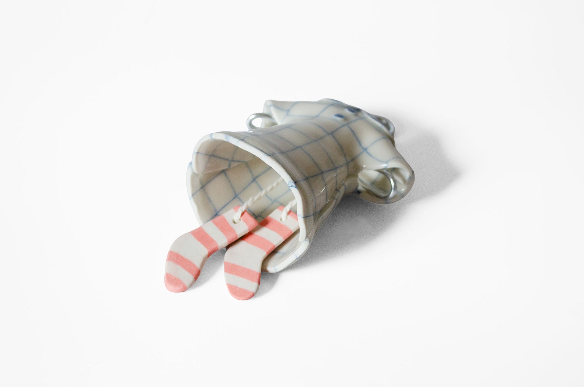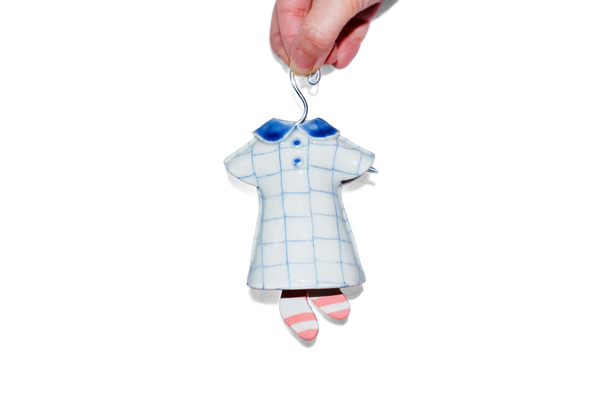 Porcelain hanging bell in the form of a dress, featuring a grid pattern created using the nerikomi technique.
