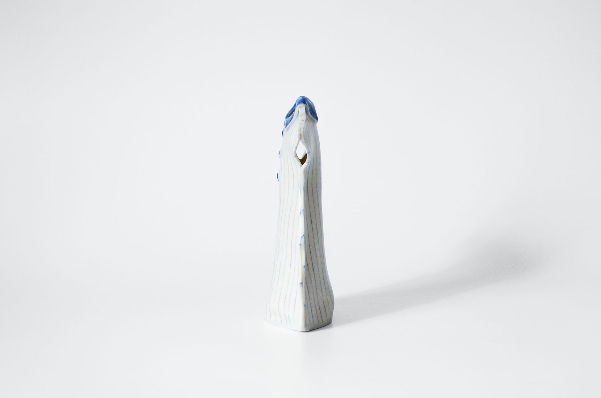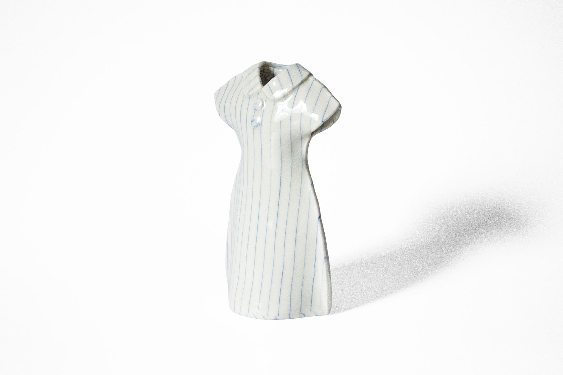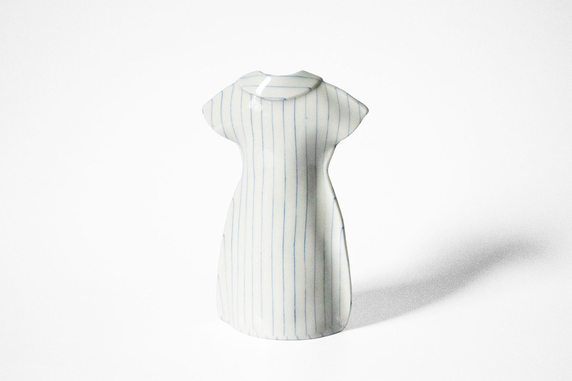 This porcelain bud vase features a design reminiscent of a doll's dress. Thin sheets of clay with a stripe pattern, created using the Nerikomi technique, are combined like fabric to form a flat dress shape.