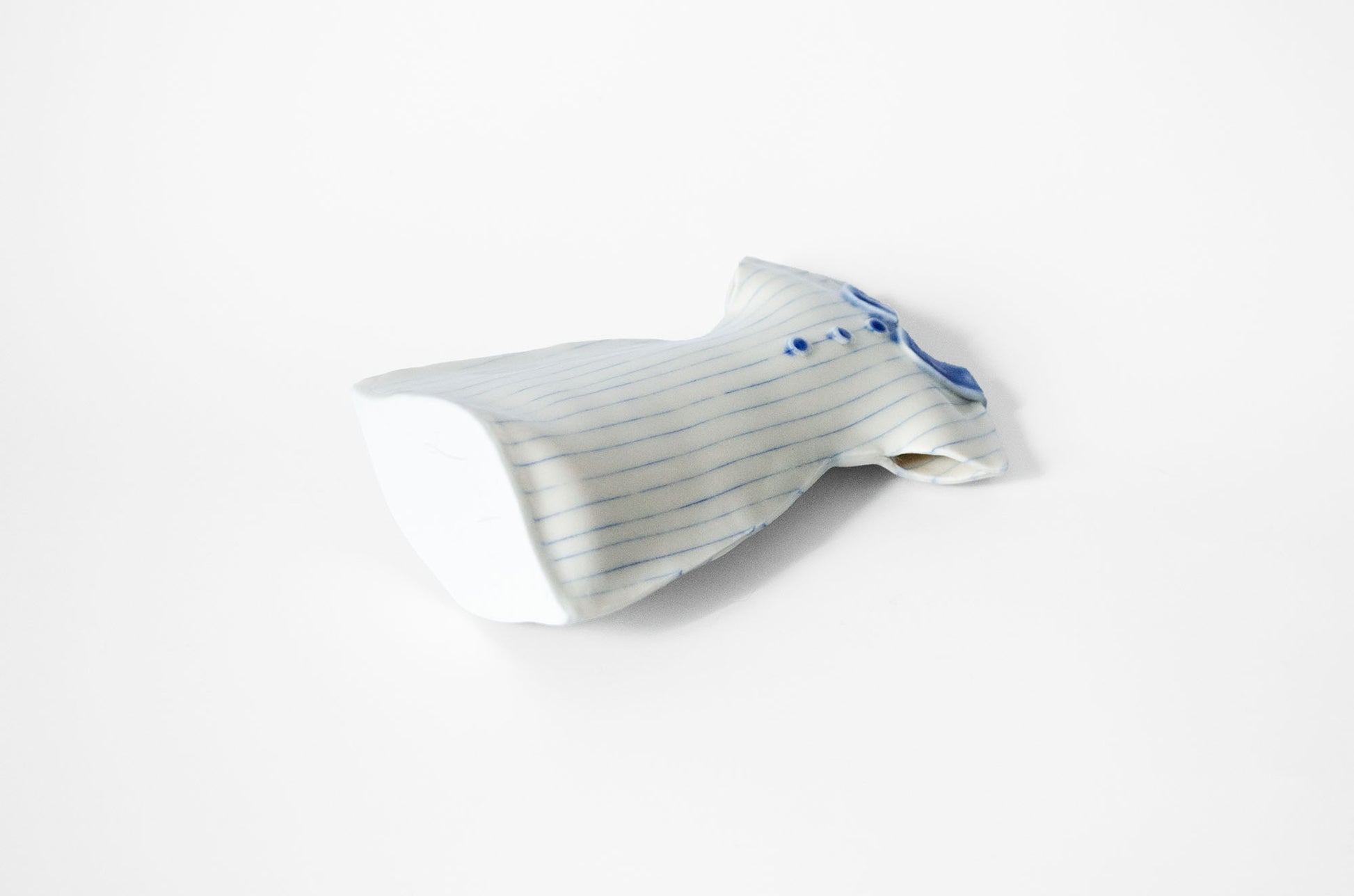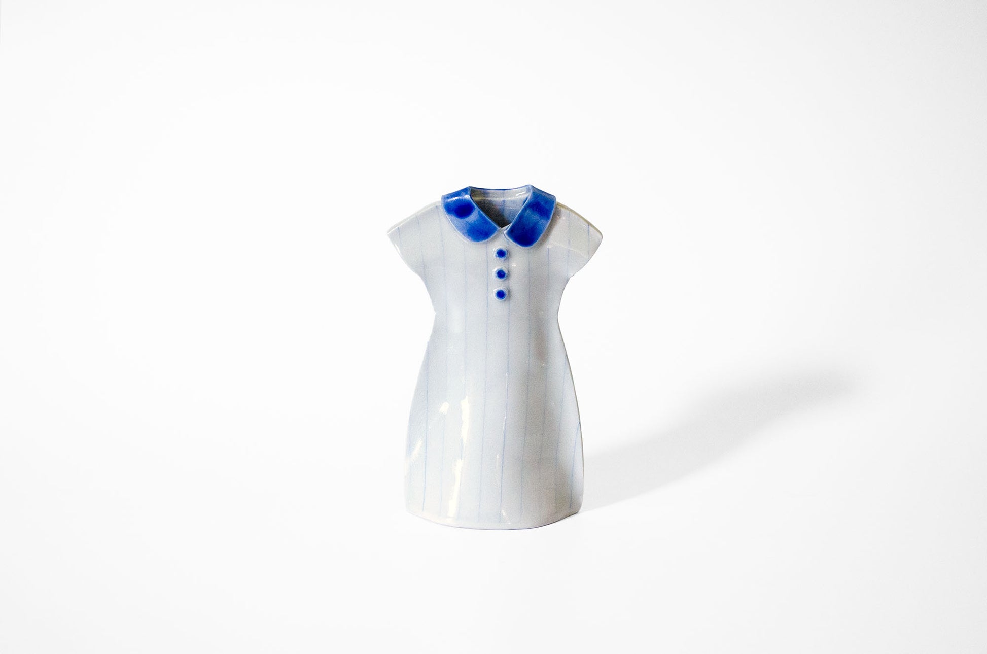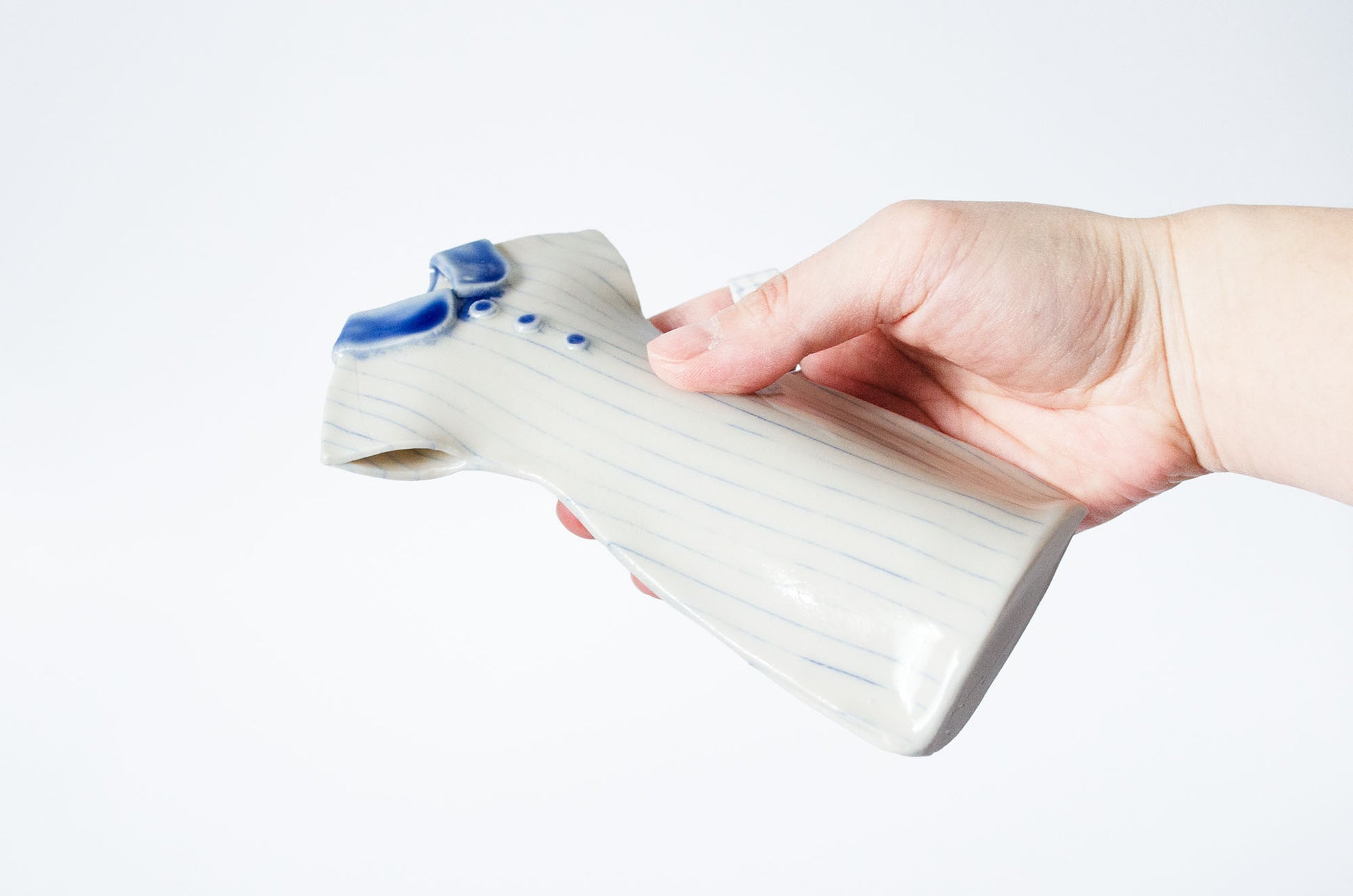 This porcelain bud vase features a design reminiscent of a doll's dress. Thin sheets of clay with a stripe pattern, created using the Nerikomi technique, are combined like fabric to form a flat dress shape.