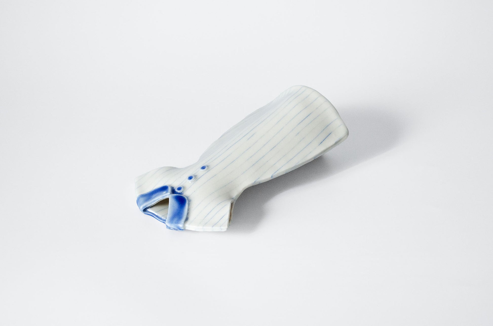 The entire surface is coated with a glossy transparent glaze, while the collar and buttons have a matte blue glaze, creating a distinctive texture that is characteristic of handmade ceramics.