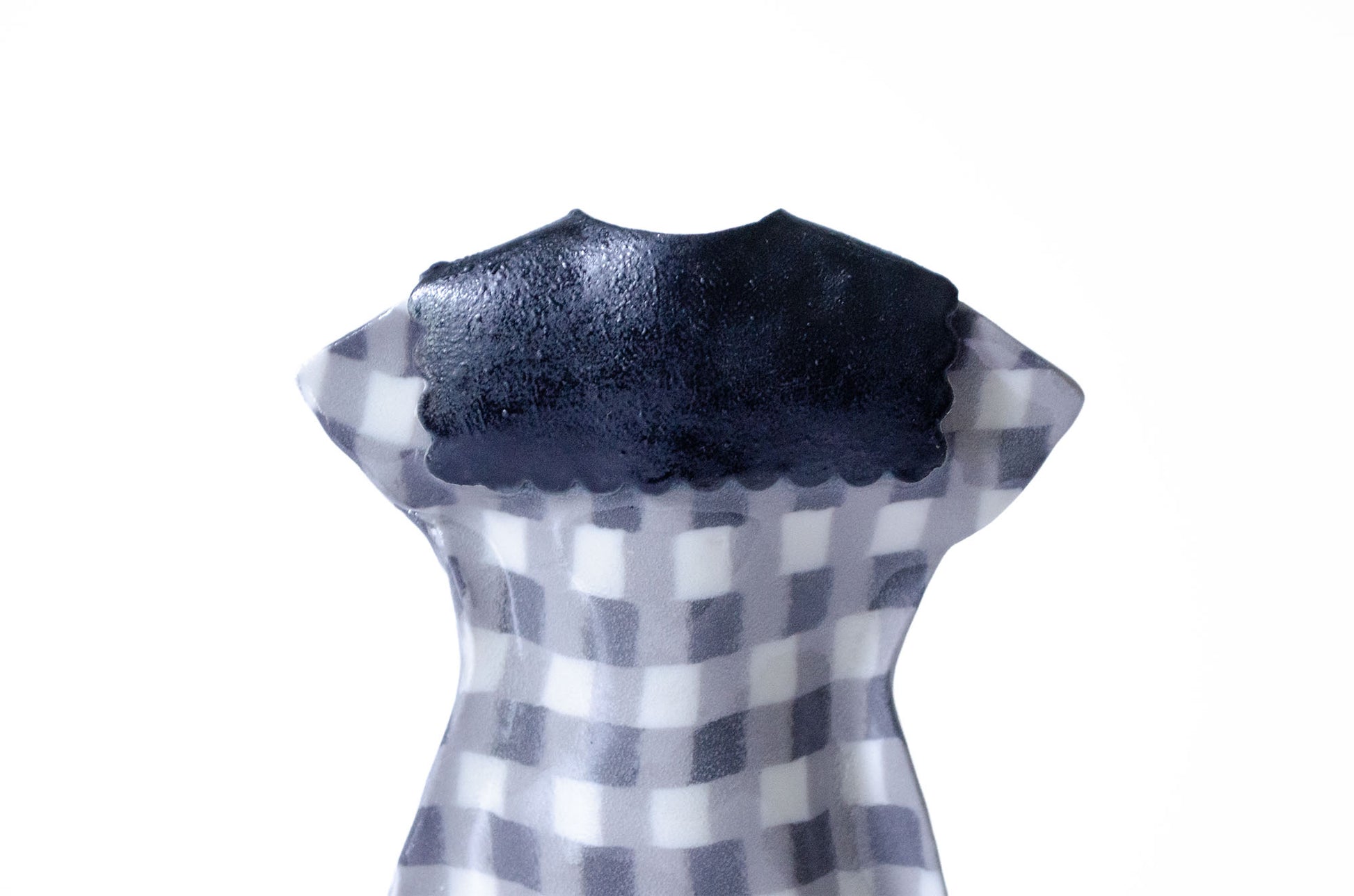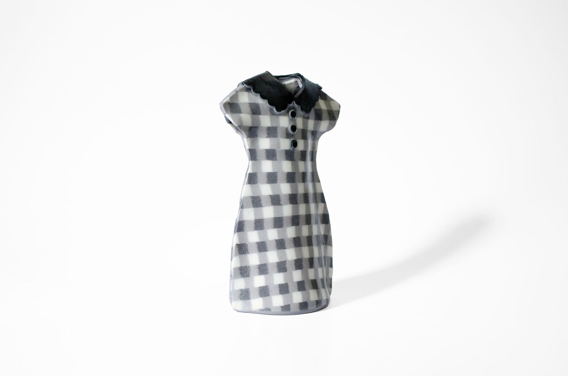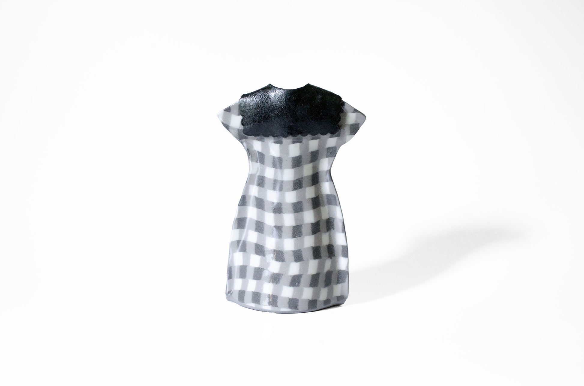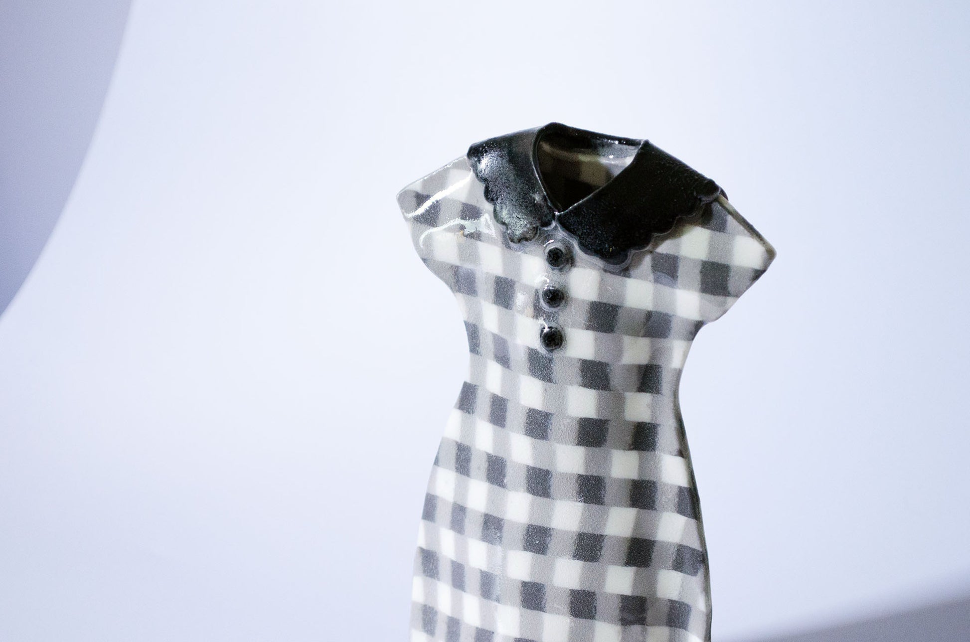This porcelain bud vase features a design reminiscent of a doll's dress. Thin sheets of clay with a checked pattern, created using the Nerikomi technique, are combined like fabric to form a flat dress shape.