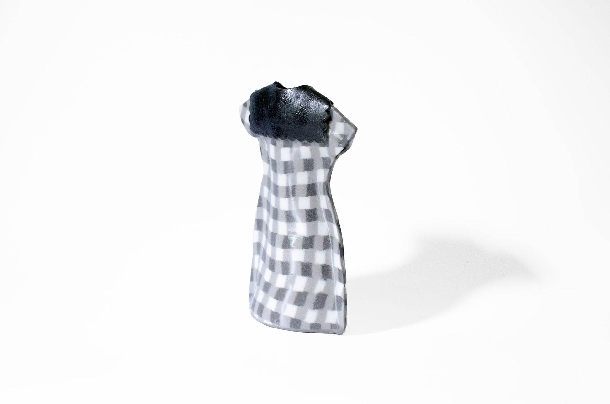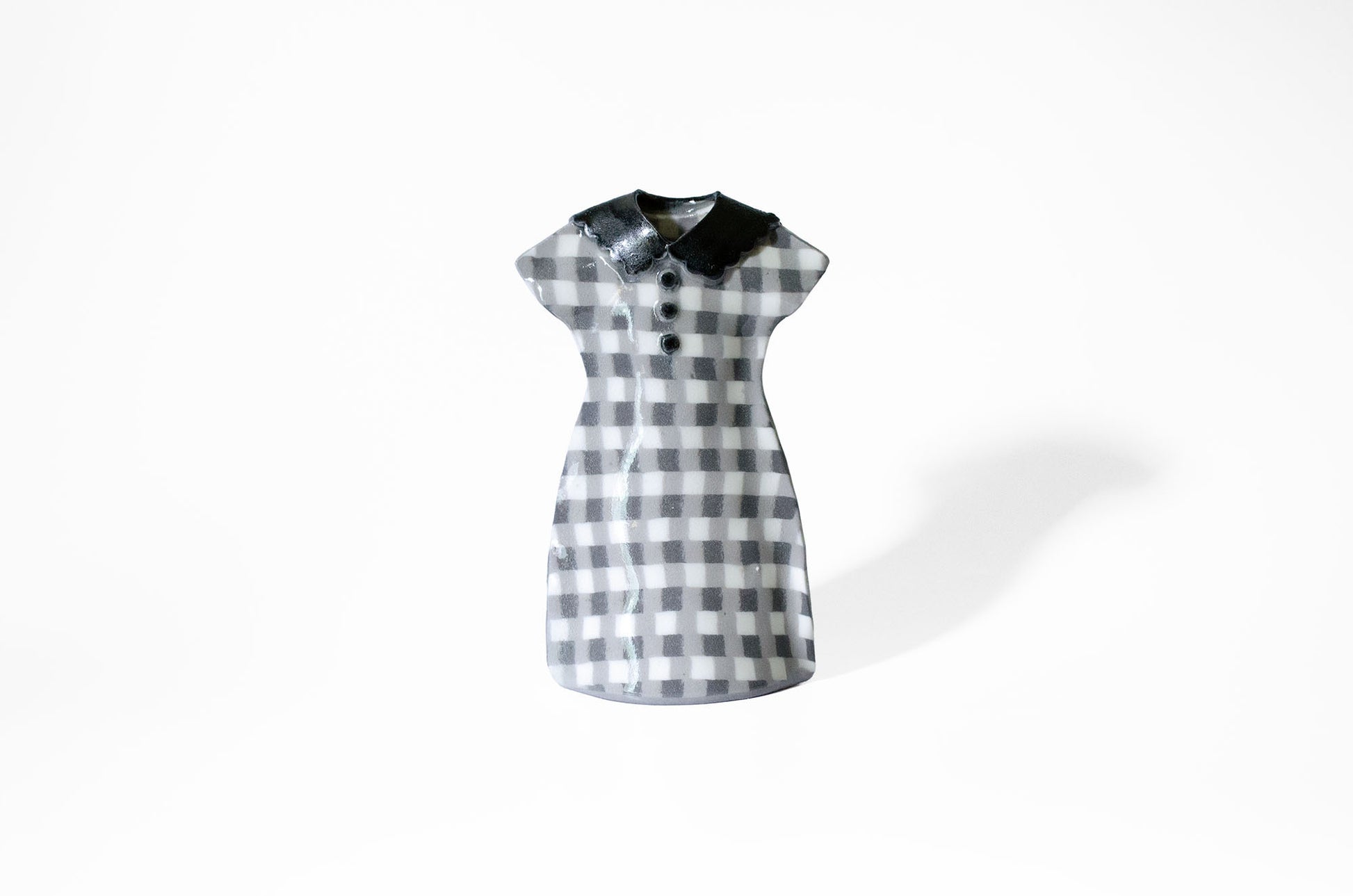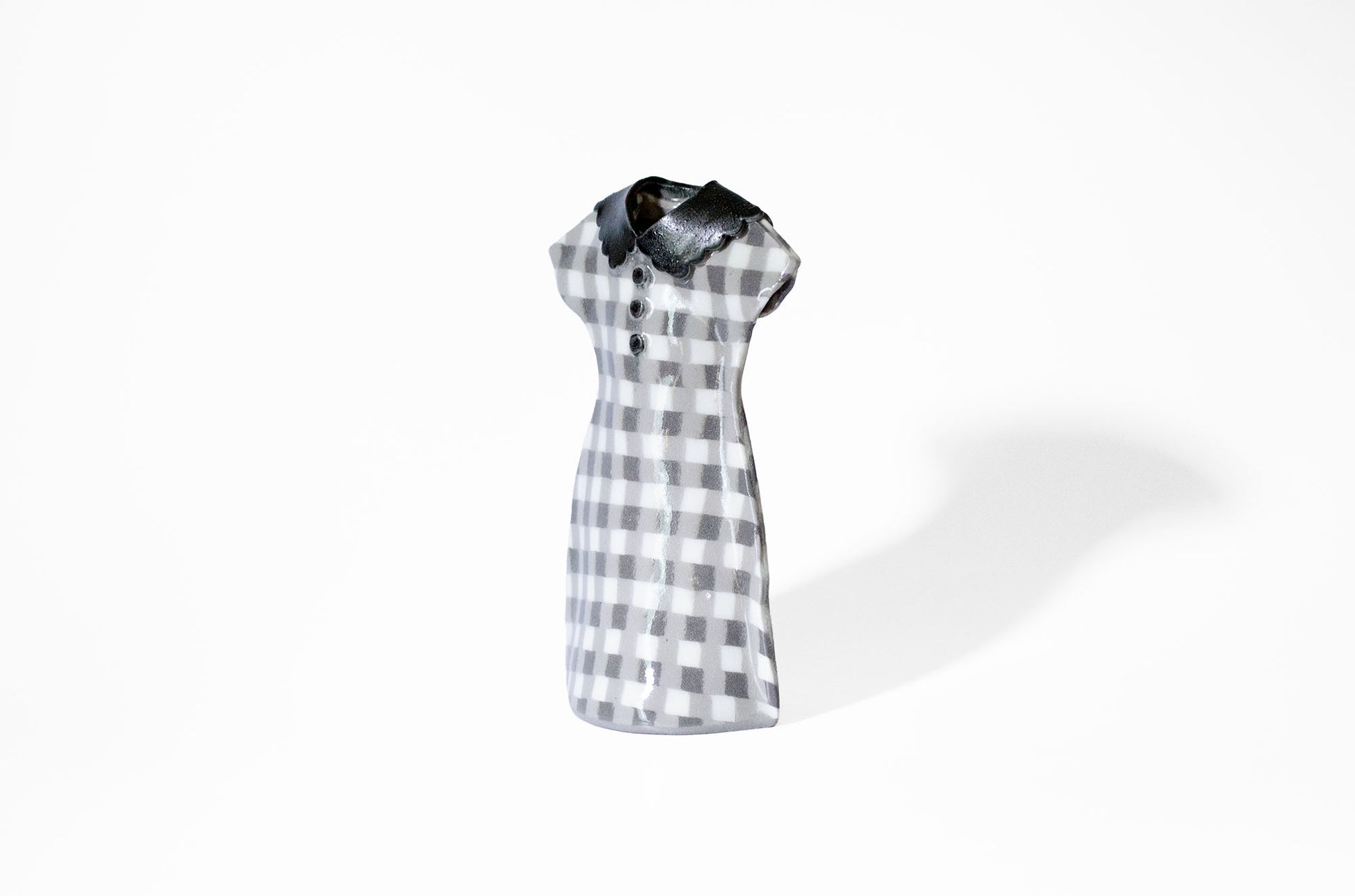 This porcelain bud vase features a design reminiscent of a doll's dress. Thin sheets of clay with a checked pattern, created using the Nerikomi technique, are combined like fabric to form a flat dress shape.
