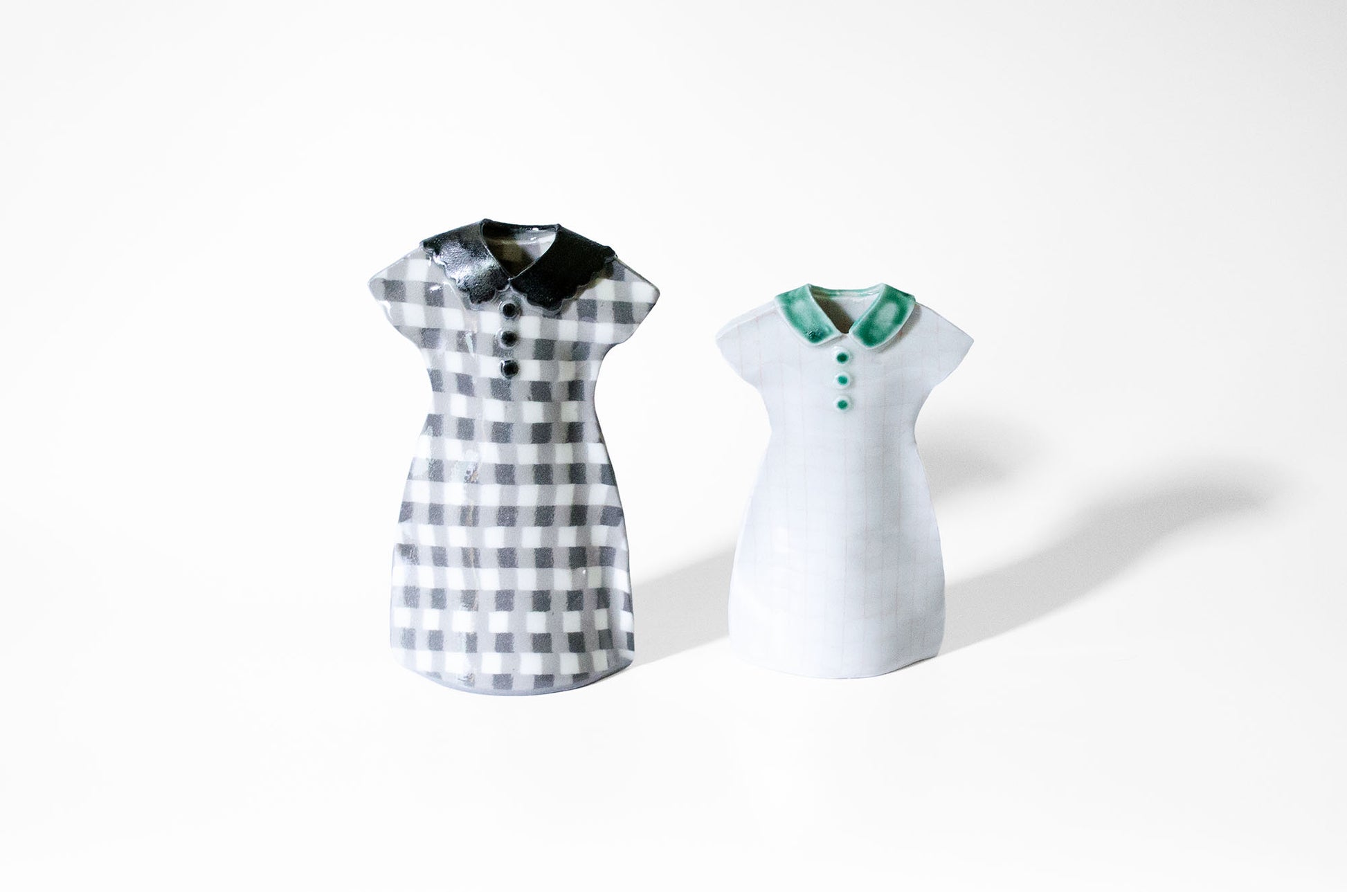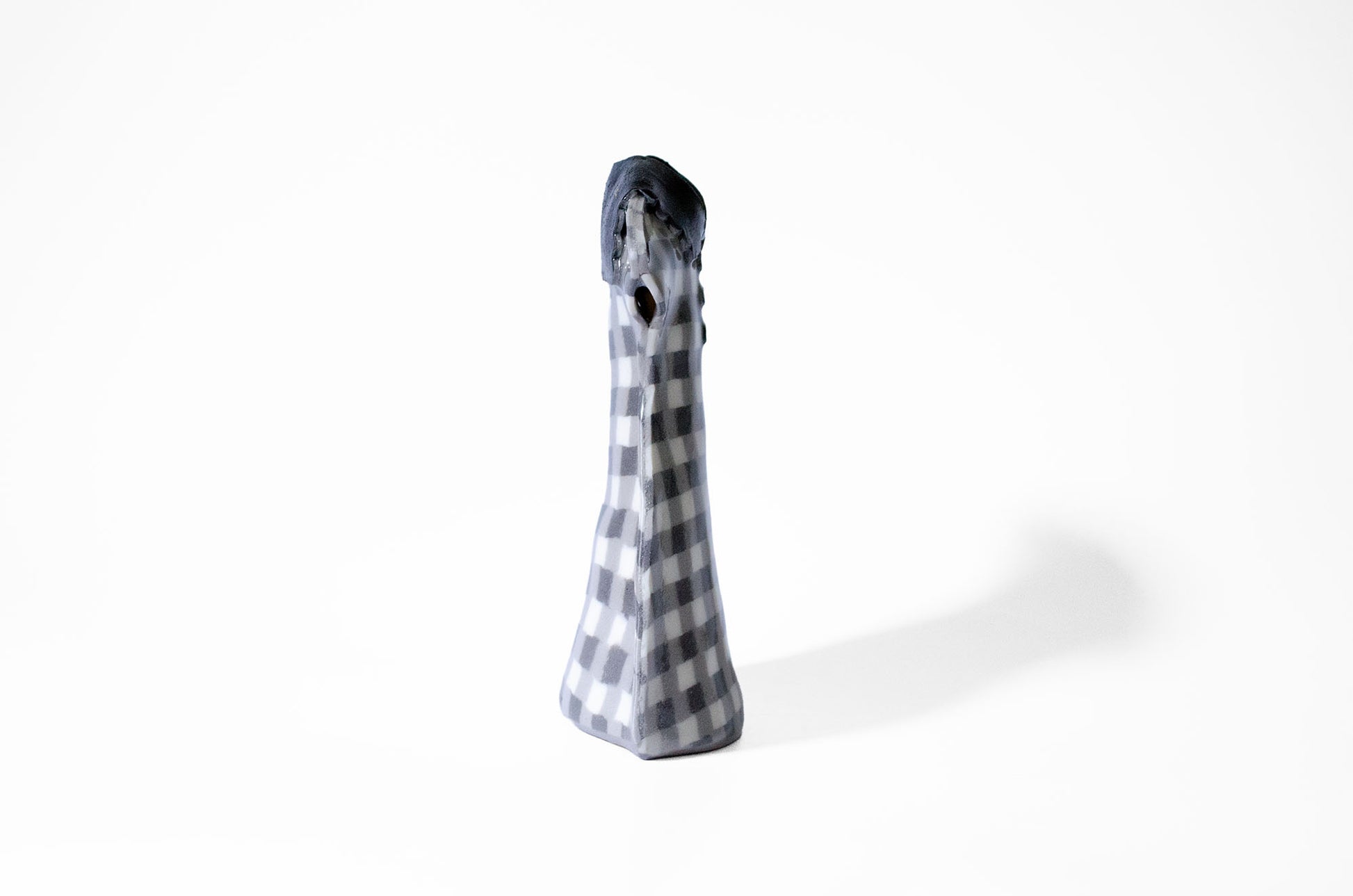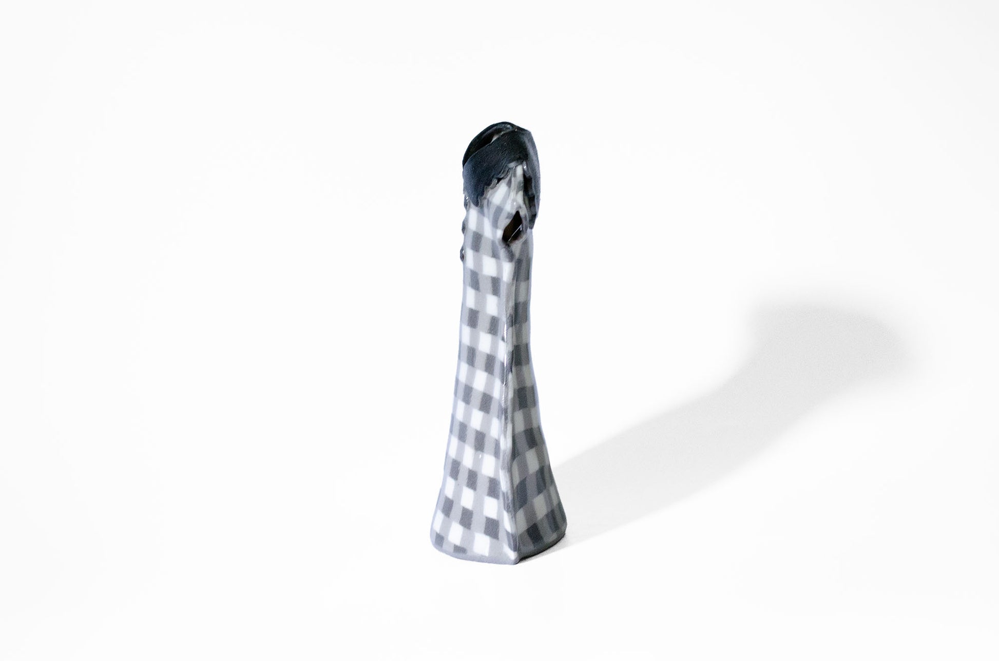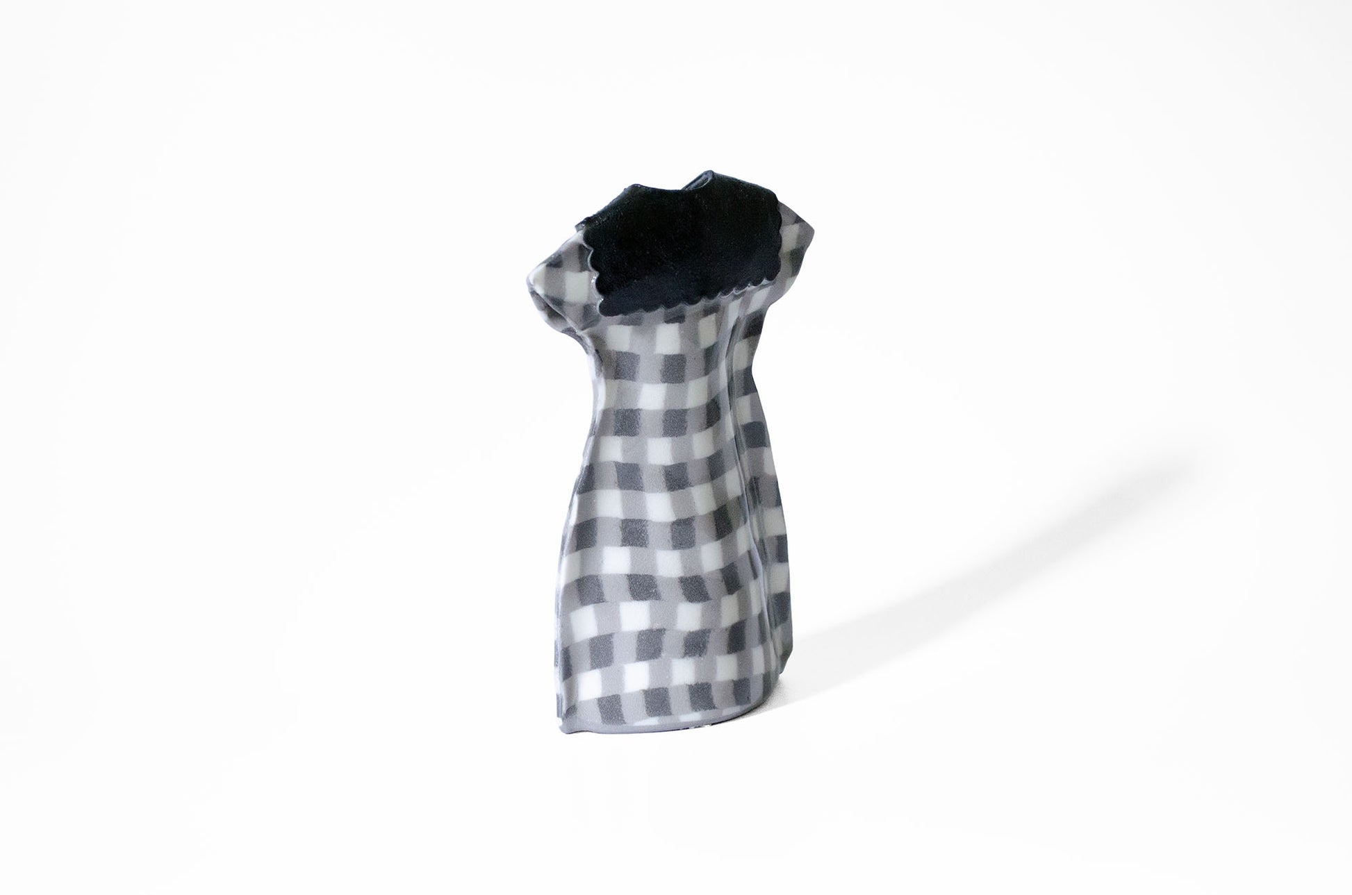 This porcelain bud vase features a design reminiscent of a doll's dress. Thin sheets of clay with a checked pattern, created using the Nerikomi technique, are combined like fabric to form a flat dress shape.