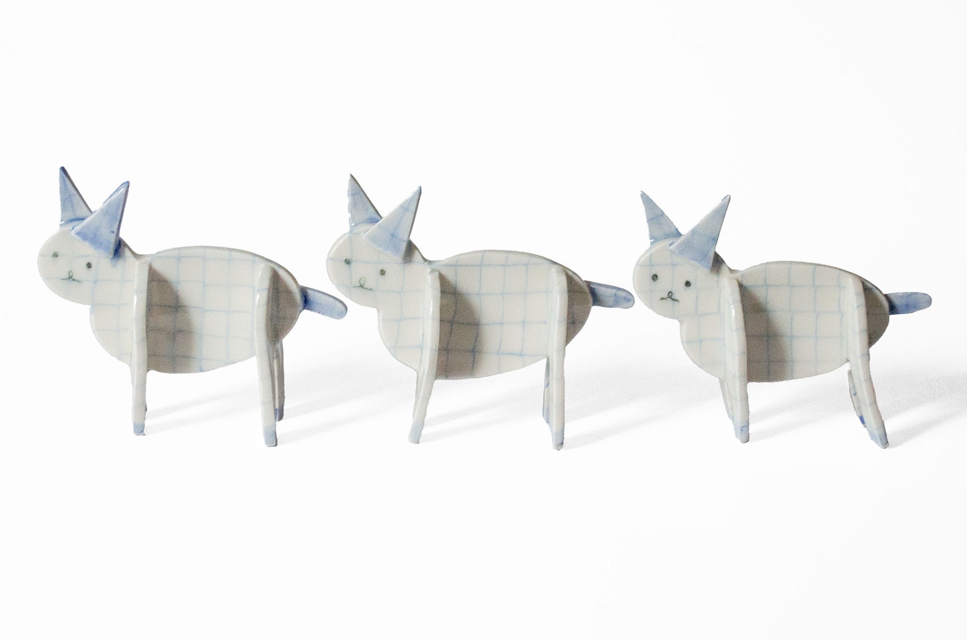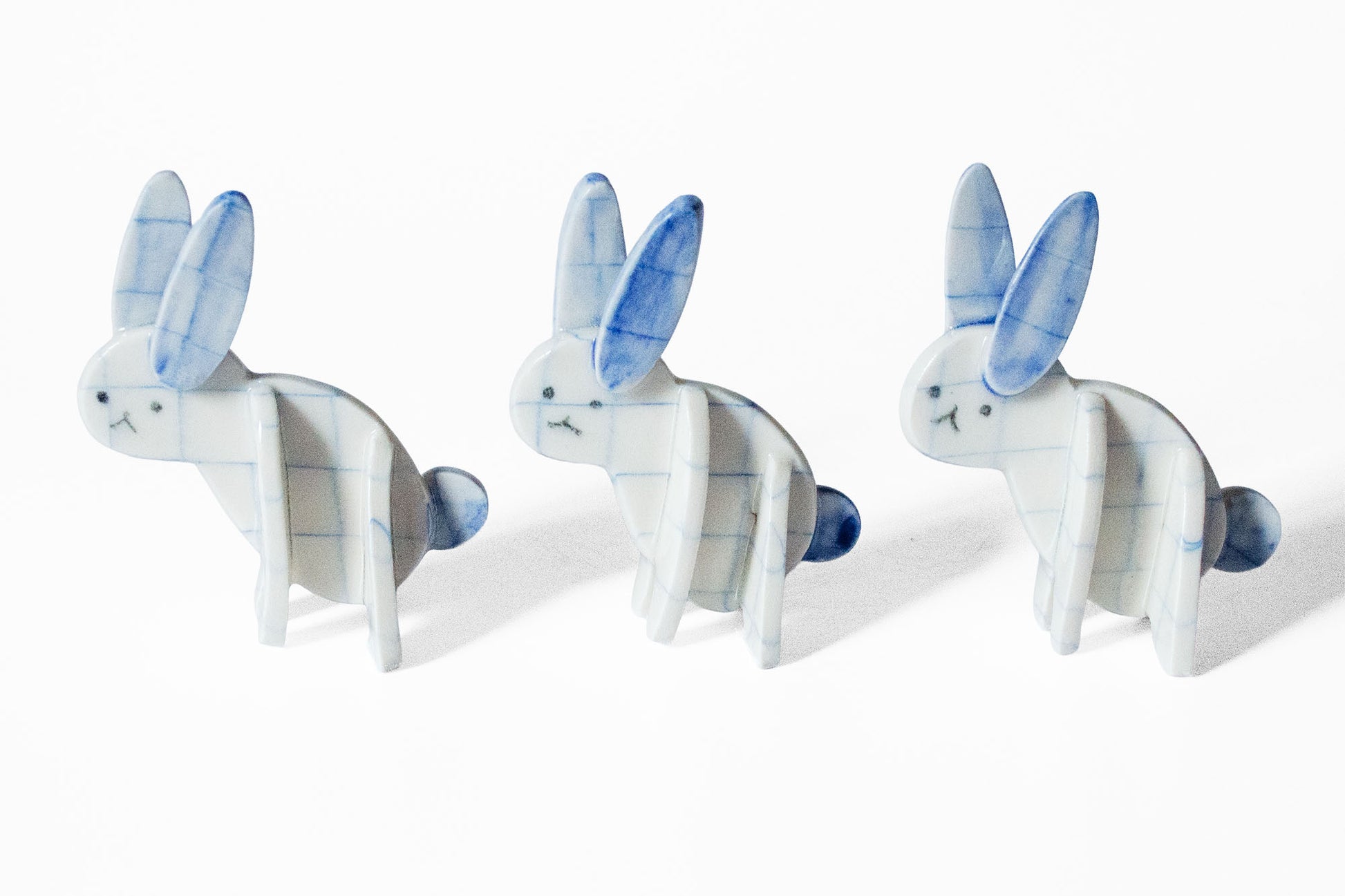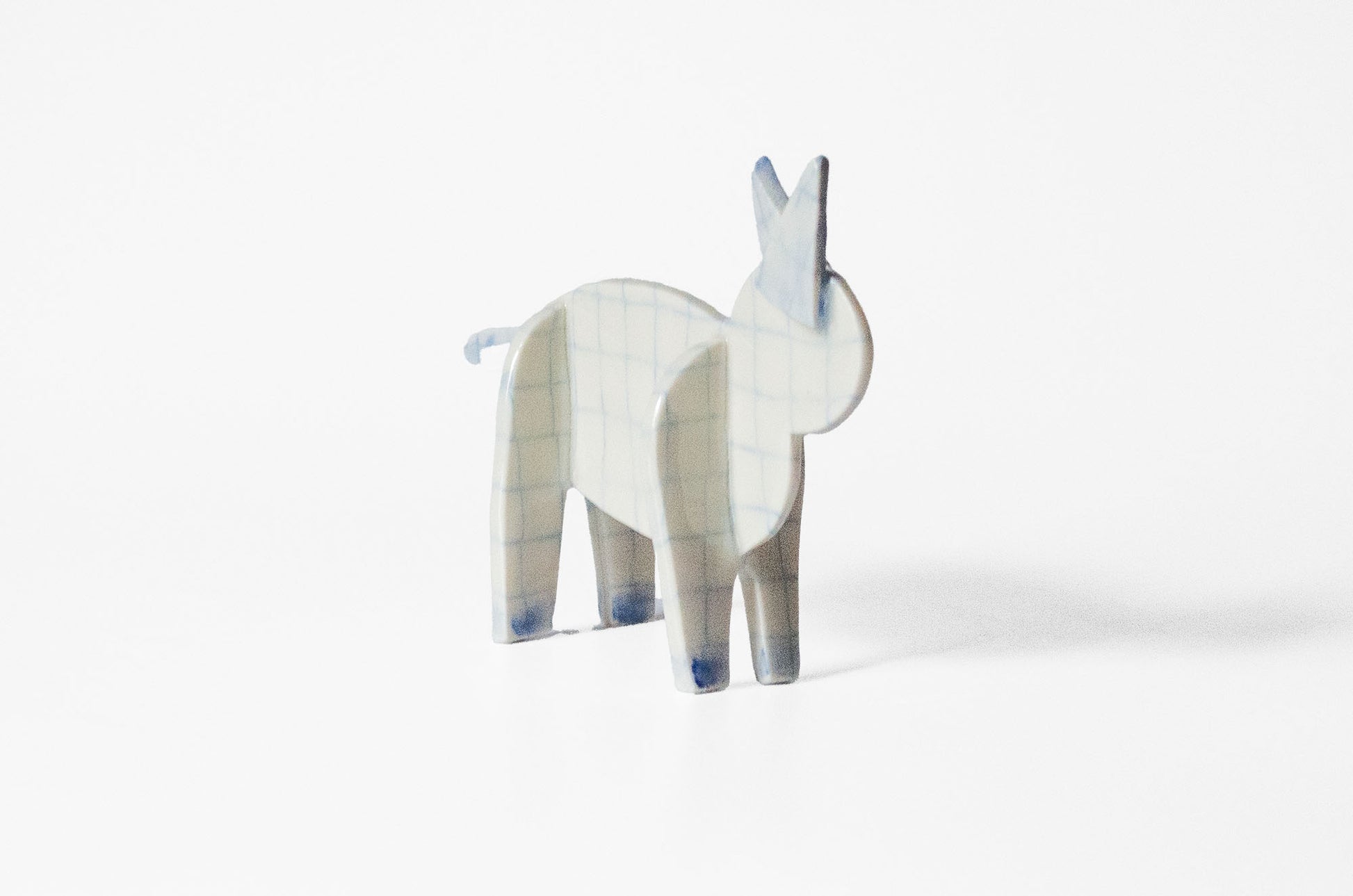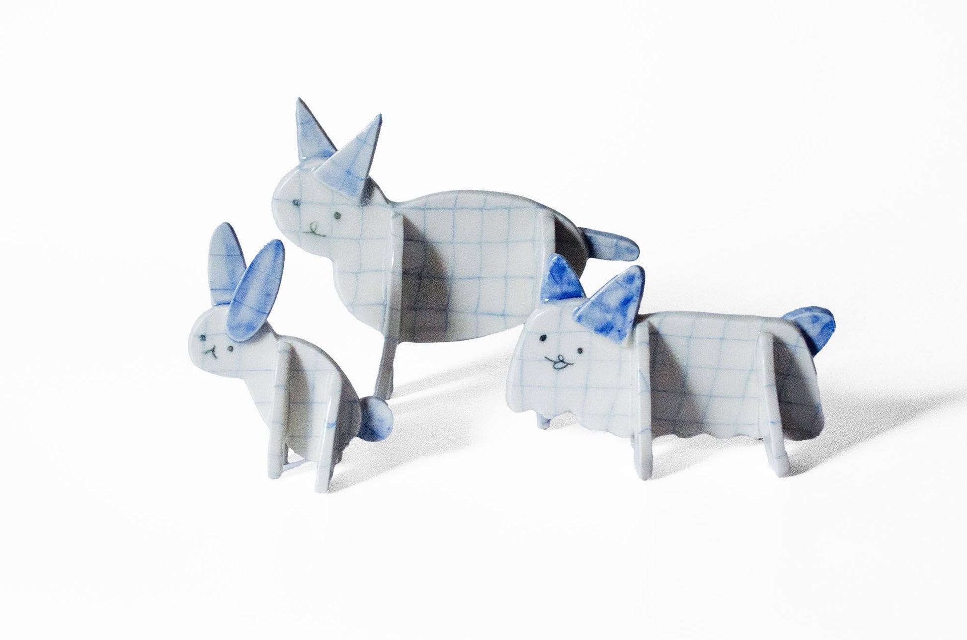 The blue grid pattern, created using the nerikomi technique, evokes the look of traditional porcelain while turning them into animal figures unlike any you’ve seen before.