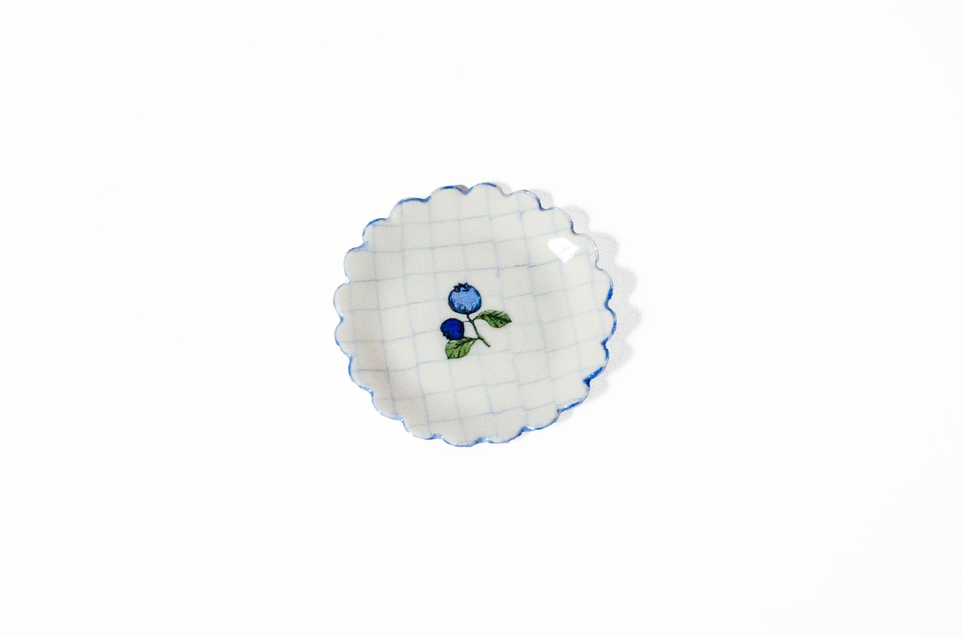 It features a reversible grid pattern created using the handmade Nerikomi technique, a delicate red flower or cute blueberry, and a scalloped edge formed using a small pie mold.