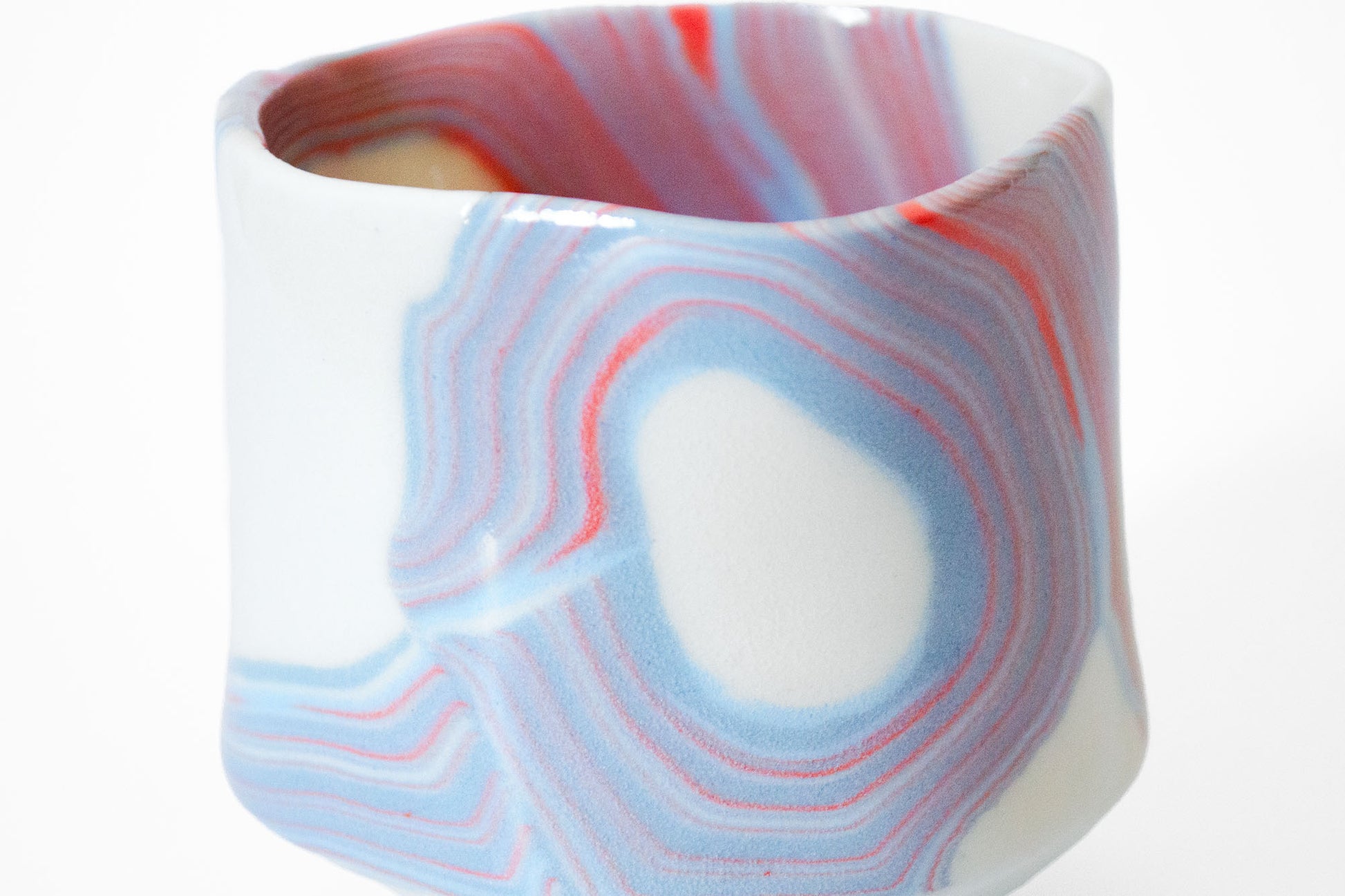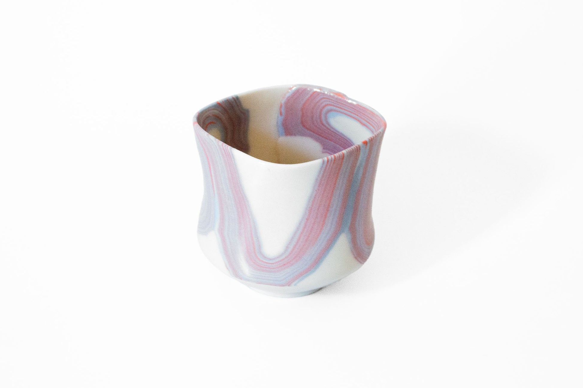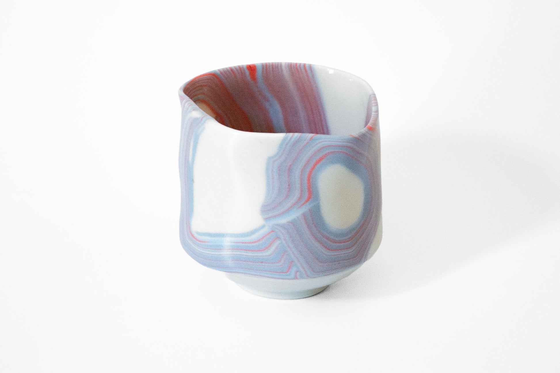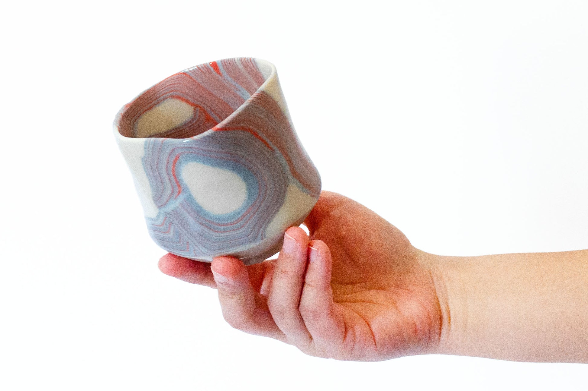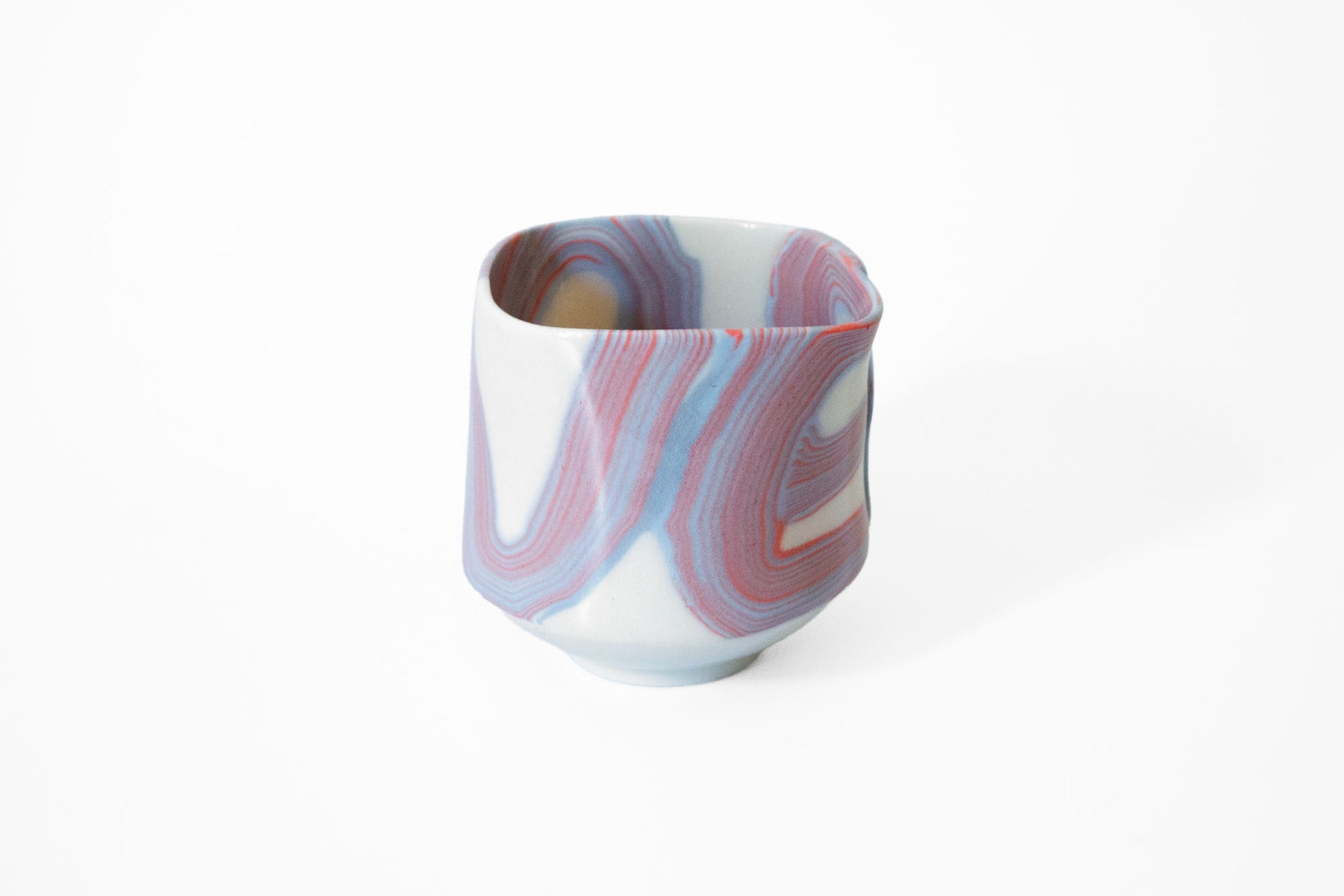 The teacups are created using the Nerikomi technique, in which several types of colored clay are combined and sliced to create a reversible pattern. It is designed to be both artistic and practical, achieved through the use of Nerikomi and wheel-throwing techniques.