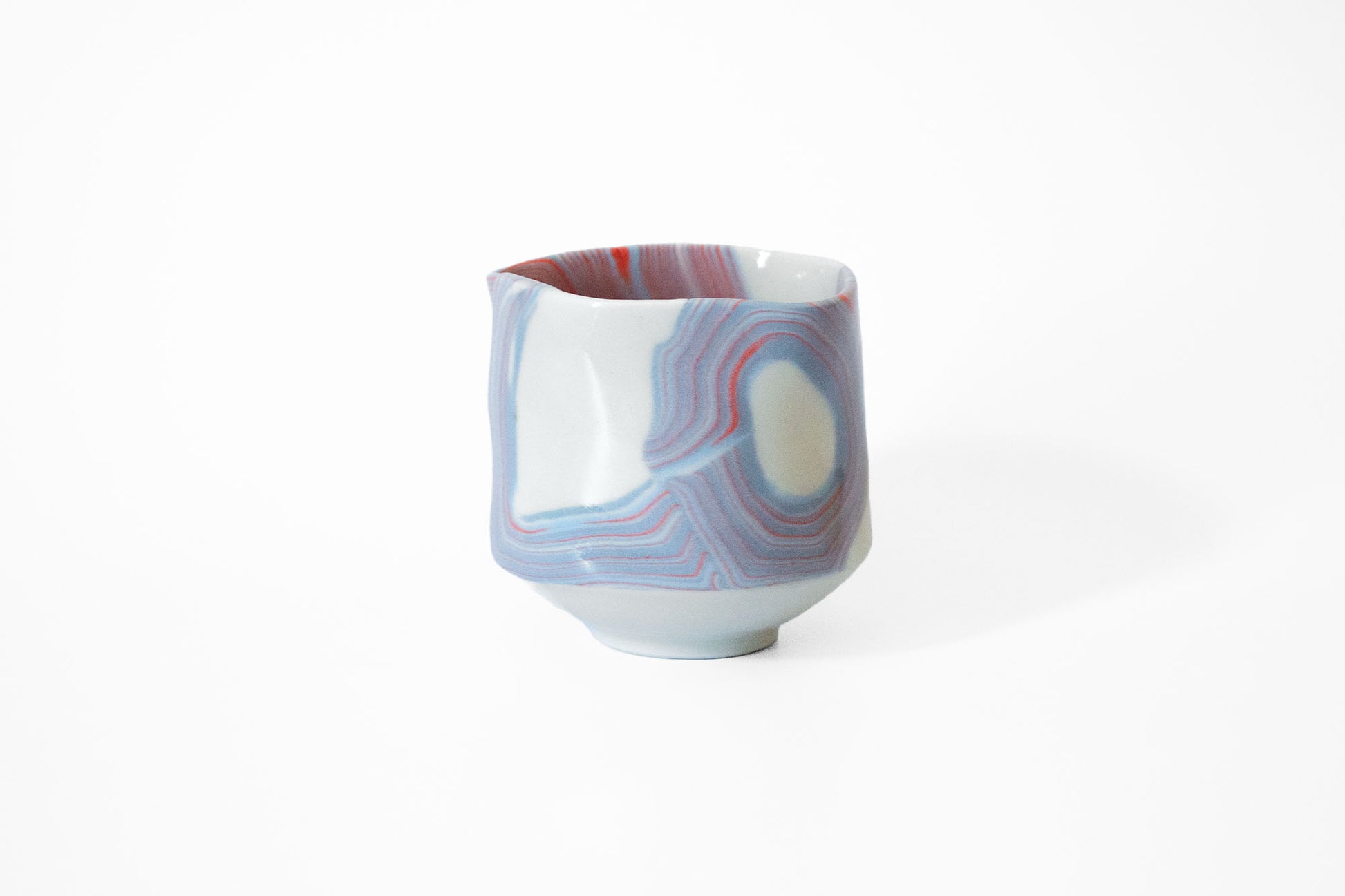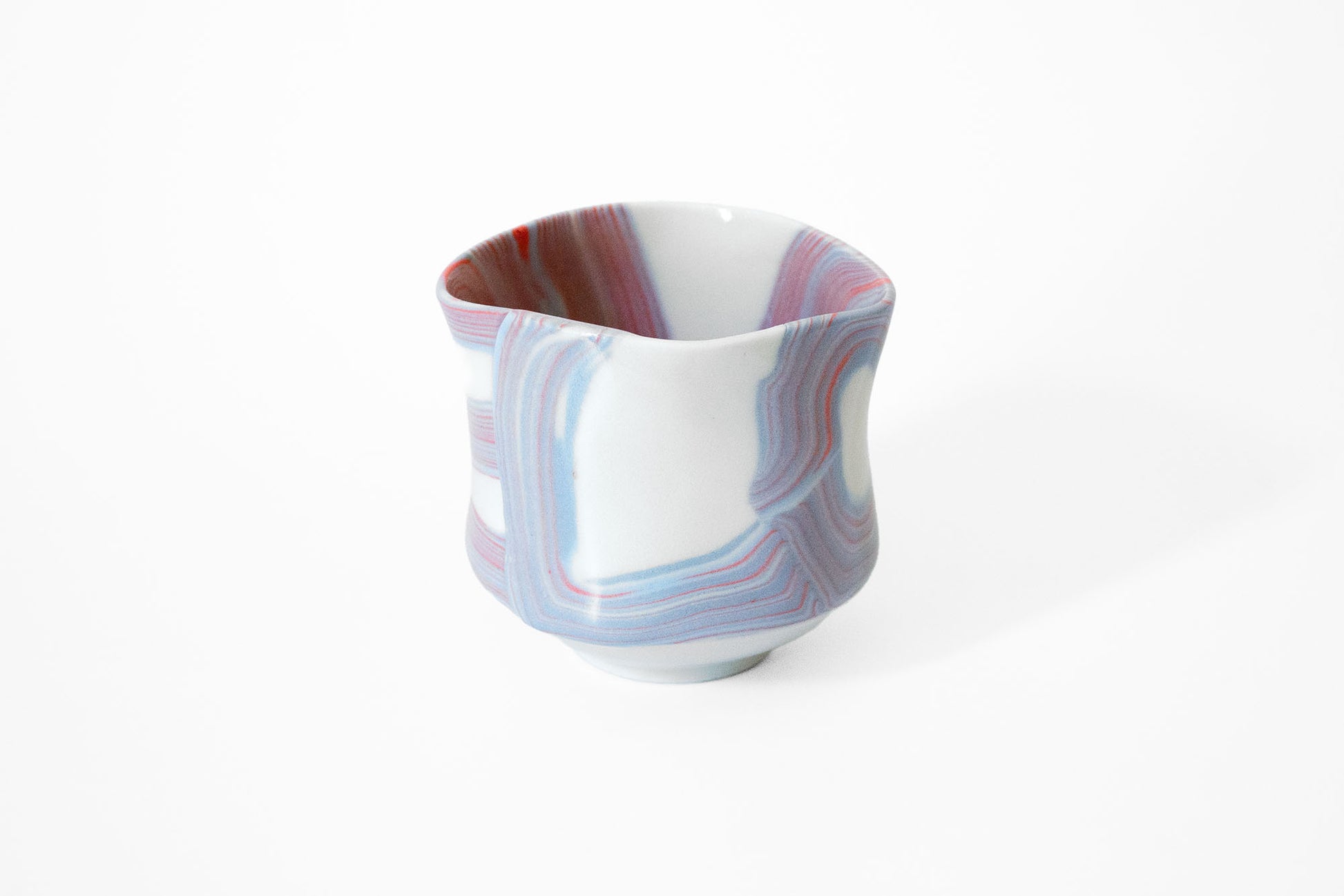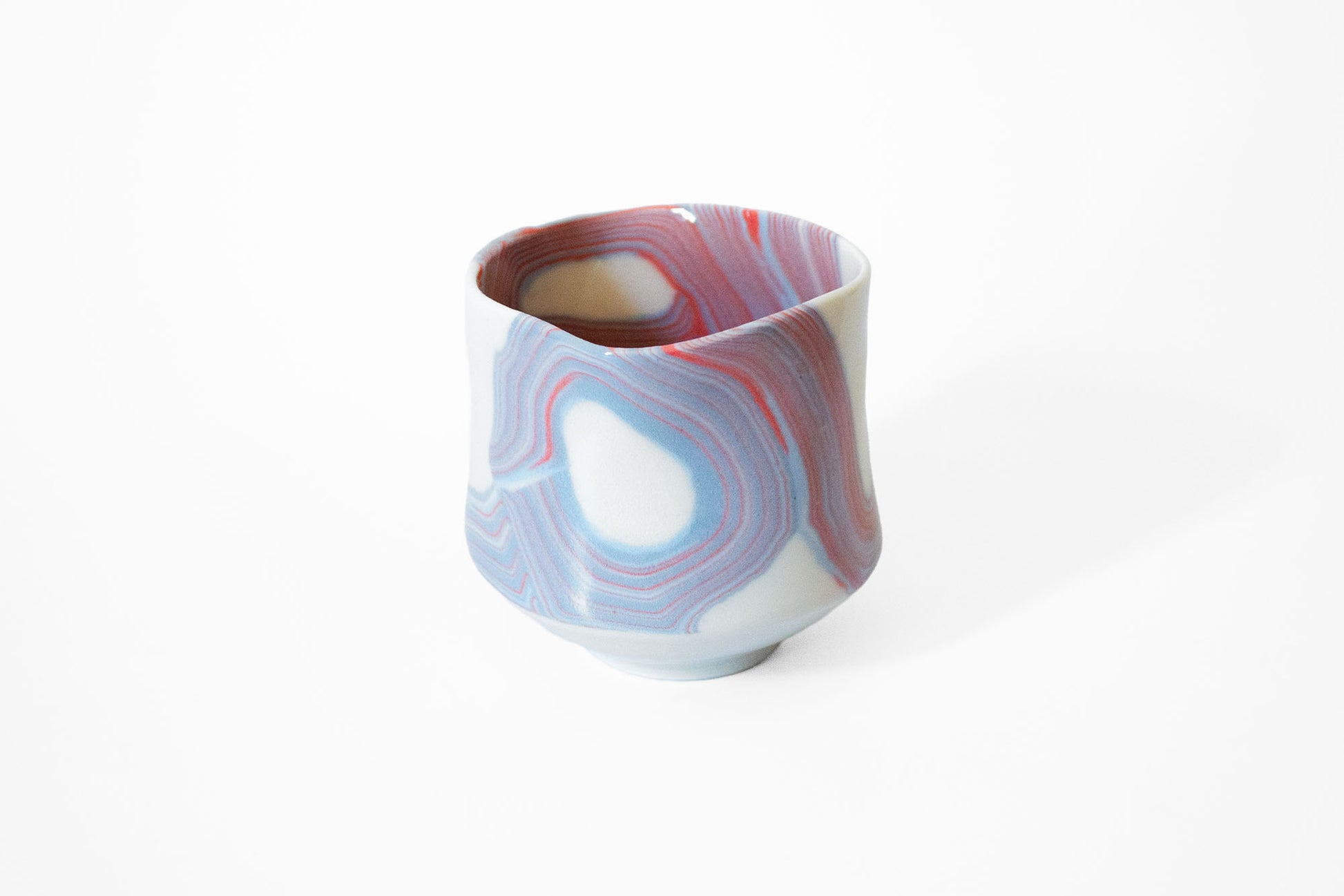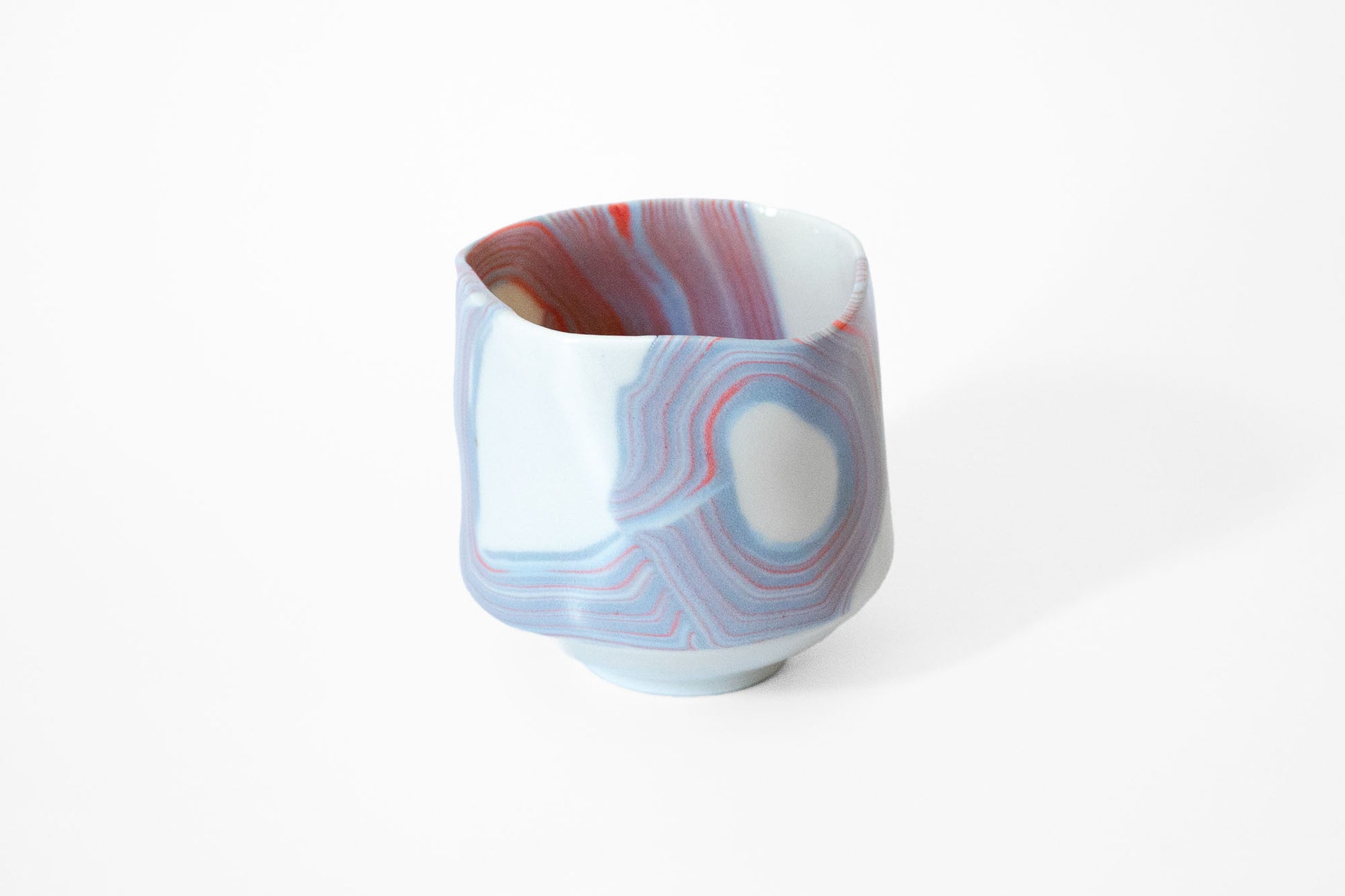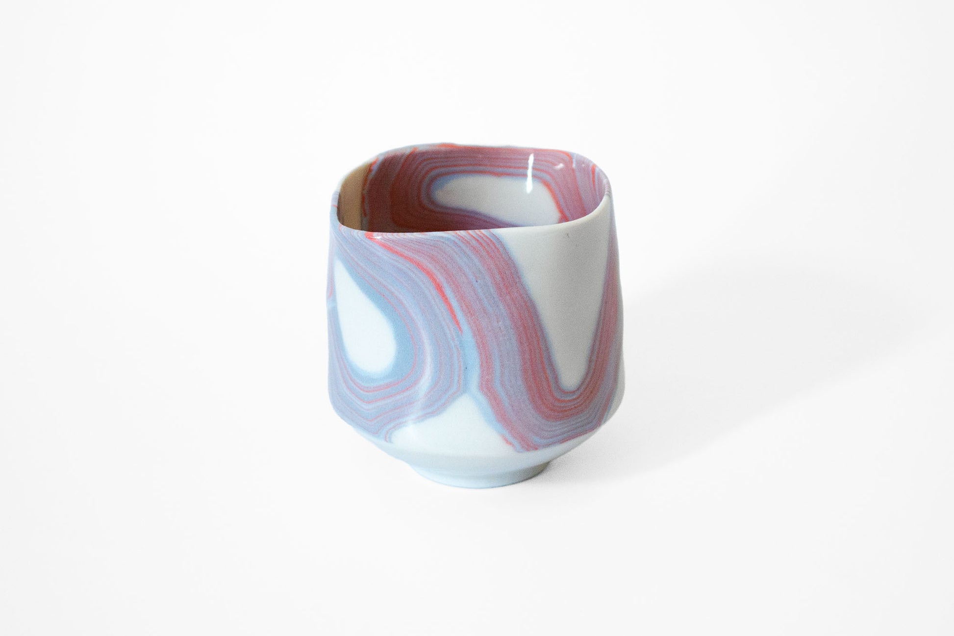 The teacups are created using the Nerikomi technique, in which several types of colored clay are combined and sliced to create a reversible pattern. It is designed to be both artistic and practical, achieved through the use of Nerikomi and wheel-throwing techniques.