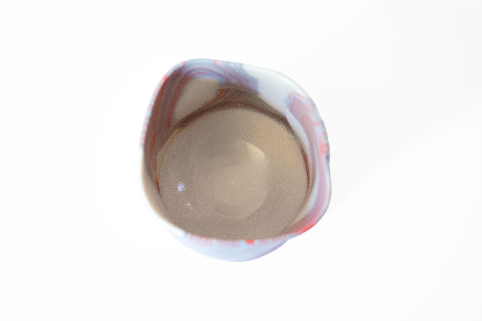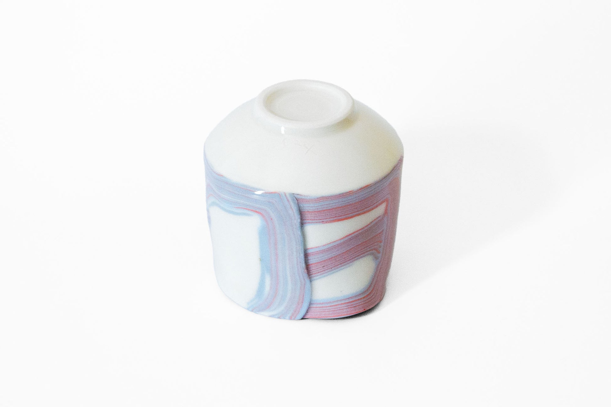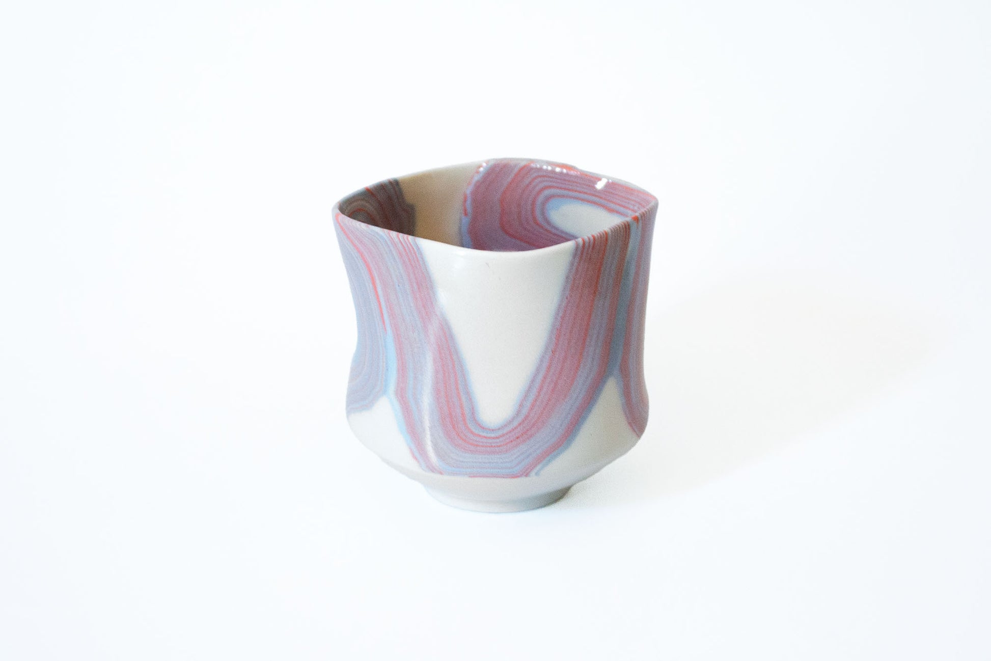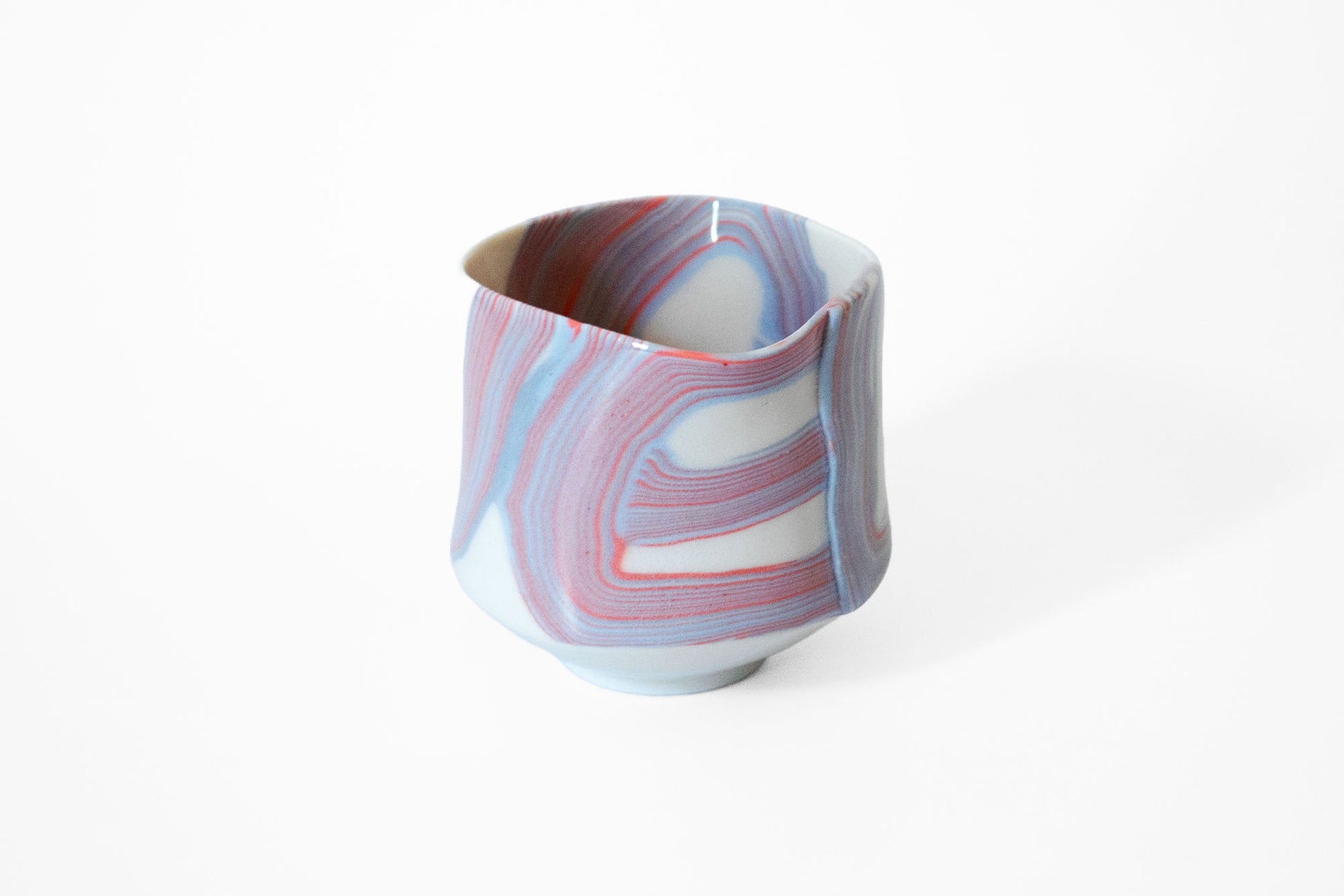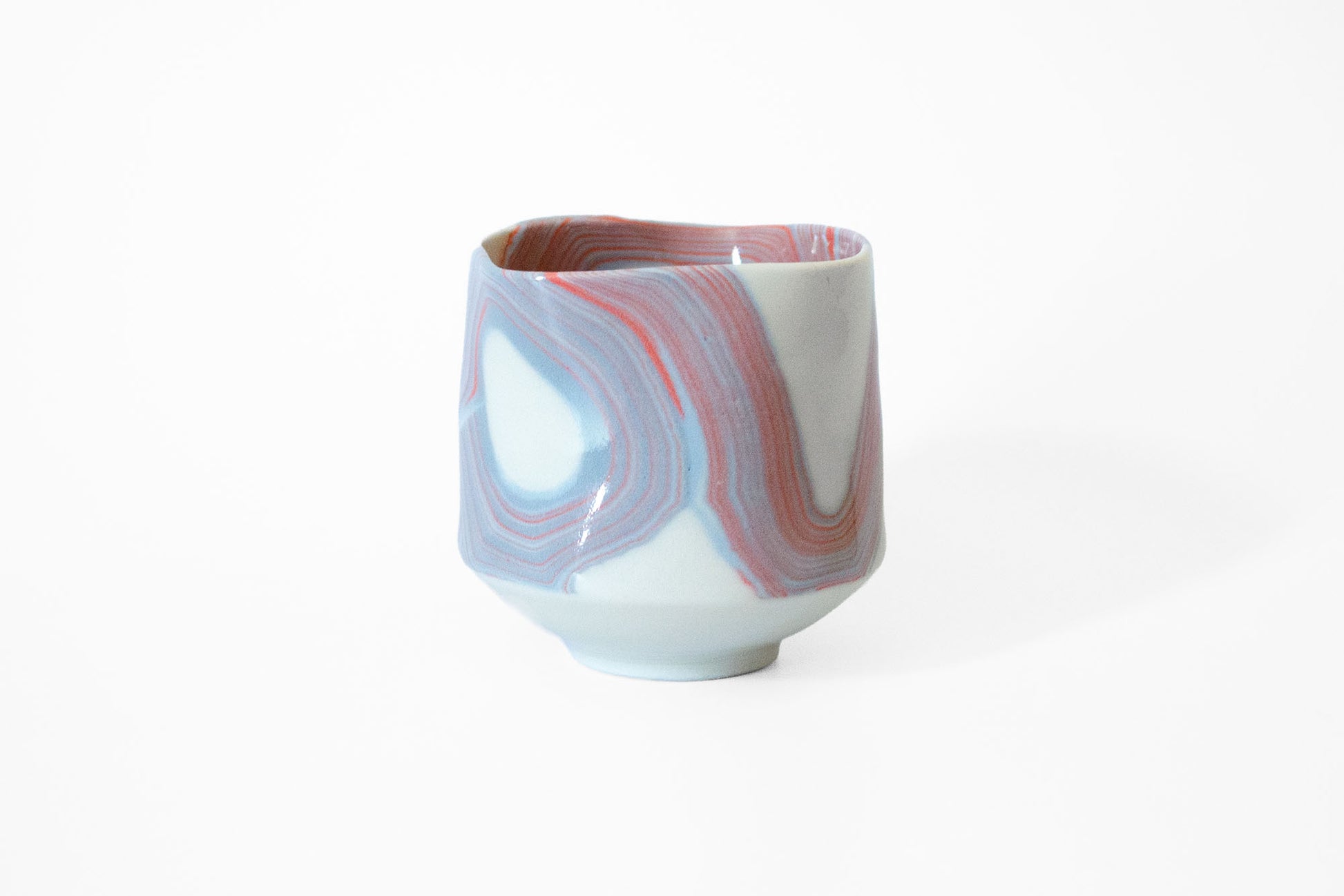 The teacups are created using the Nerikomi technique, in which several types of colored clay are combined and sliced to create a reversible pattern. It is designed to be both artistic and practical, achieved through the use of Nerikomi and wheel-throwing techniques.