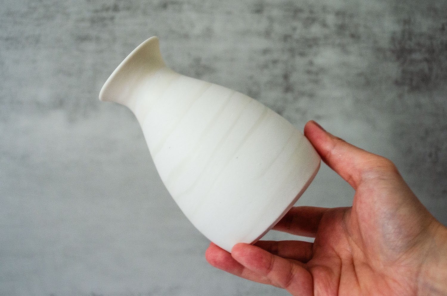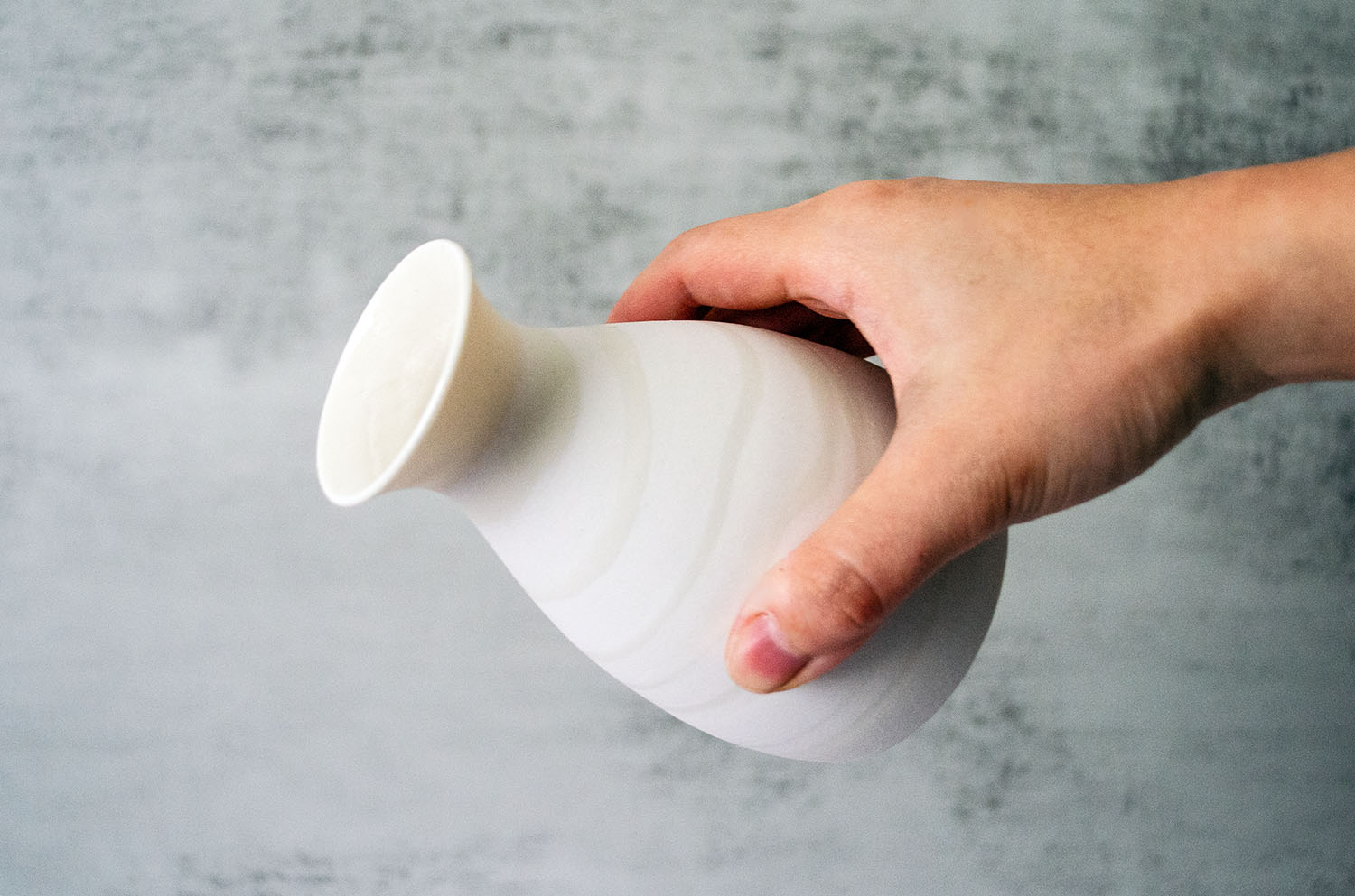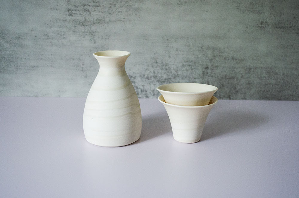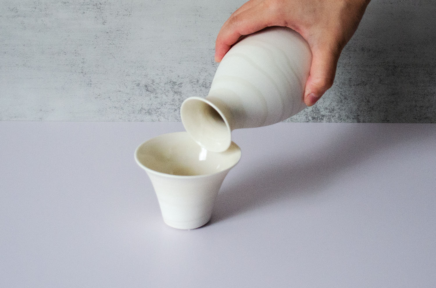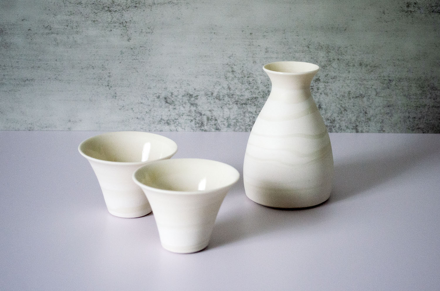 The tokkuri has a slender neck and a wide base for stability, while the ochoko cups are very lightweight and fit easily in the hand.