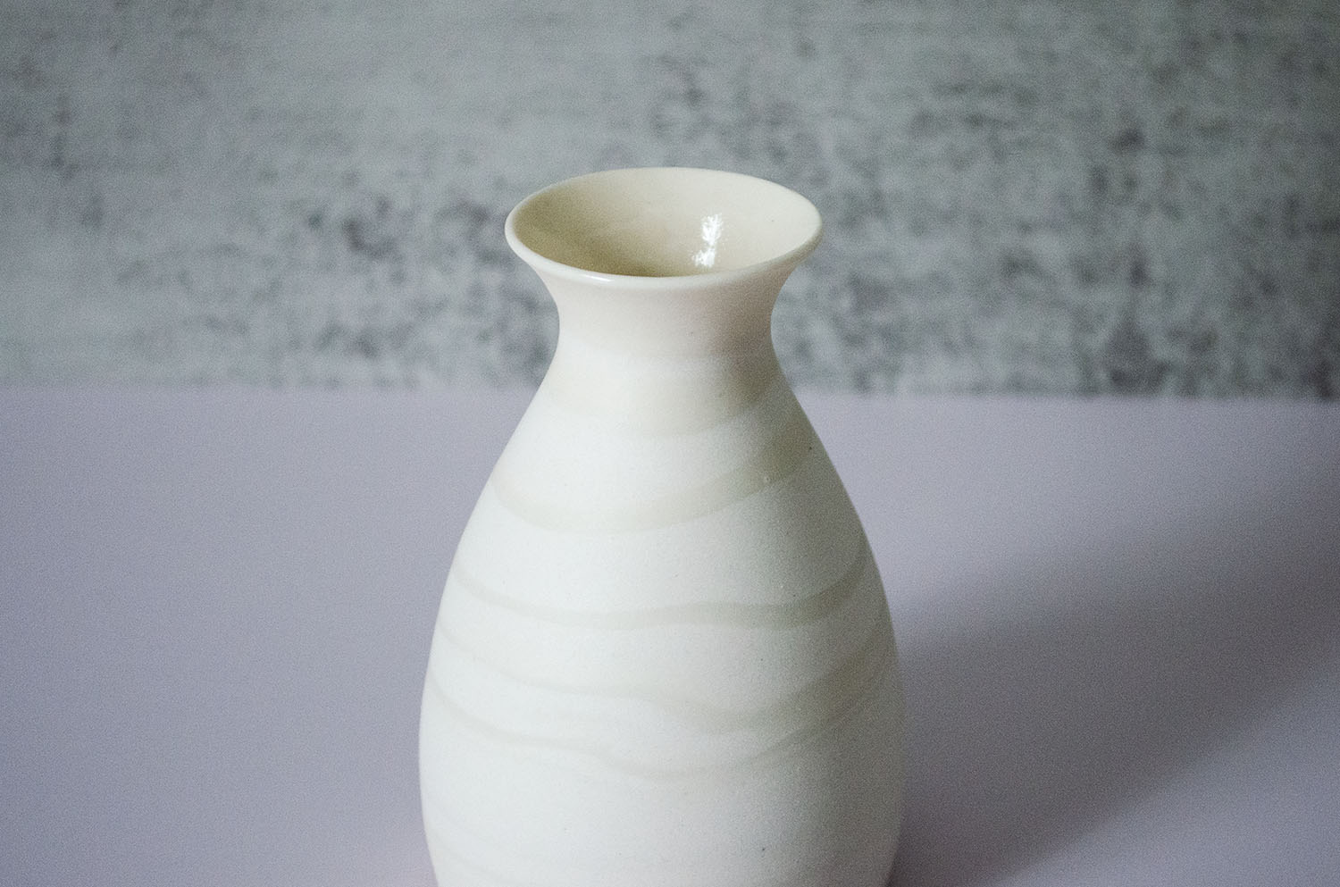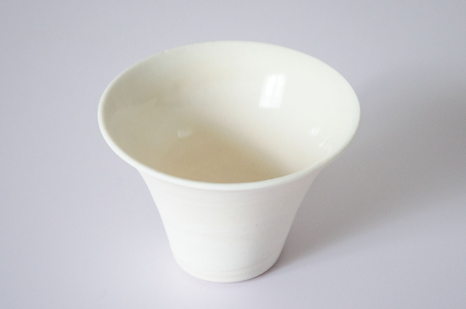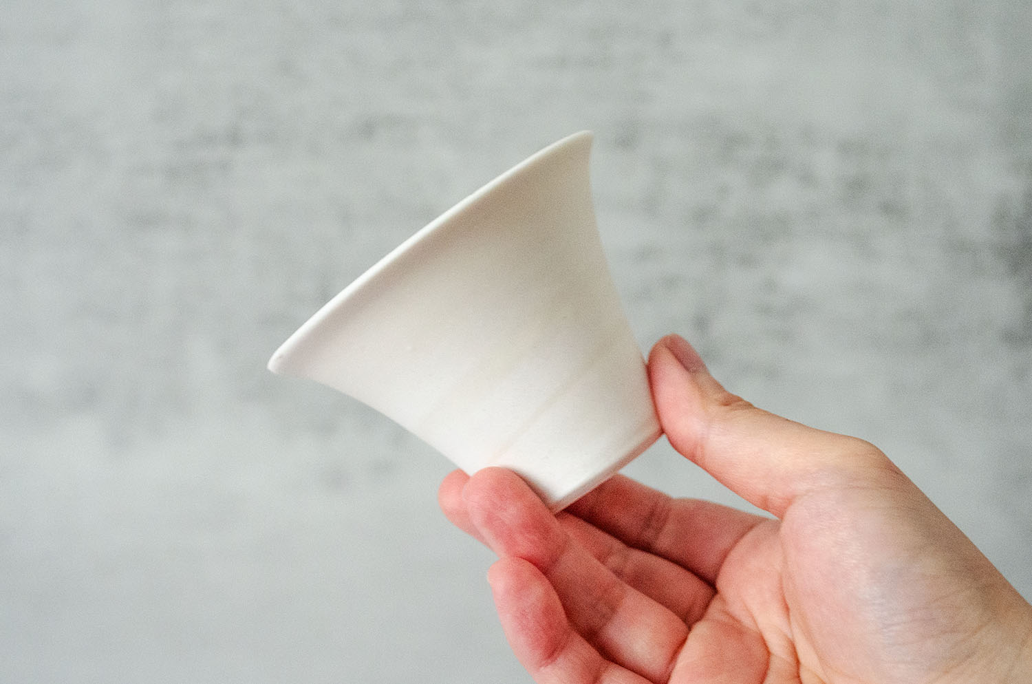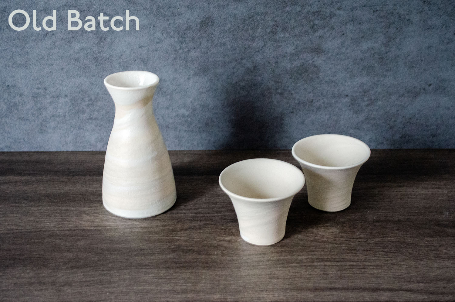 The tokkuri has a slender neck and a wide base for stability, while the ochoko cups are very lightweight and fit easily in the hand.