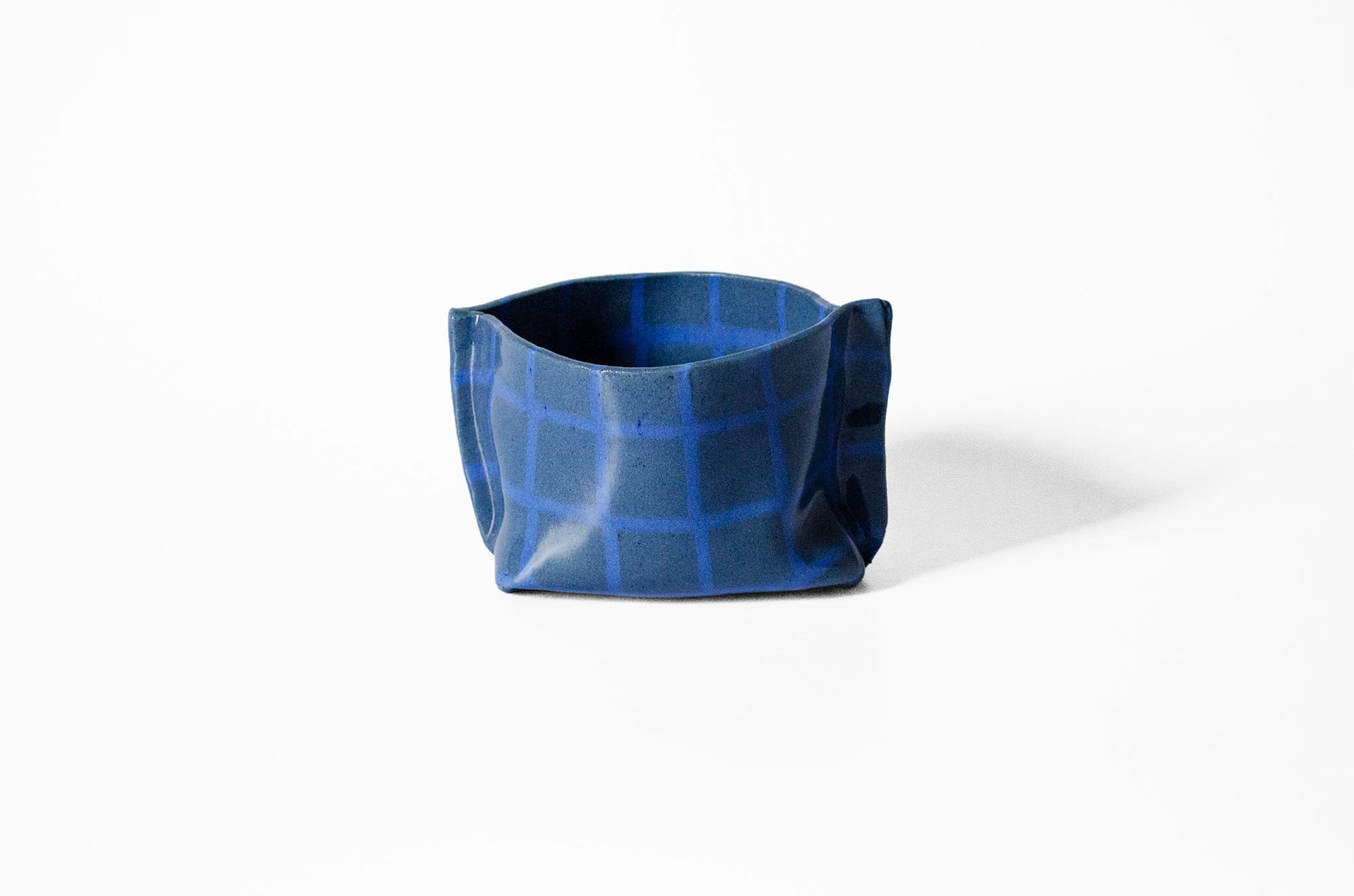 This piece features black and blue check patterns created using the Nerikomi technique, where layers of colored clay are sliced into thin sheets. These sheets are then carefully assembled into a bag-like form.