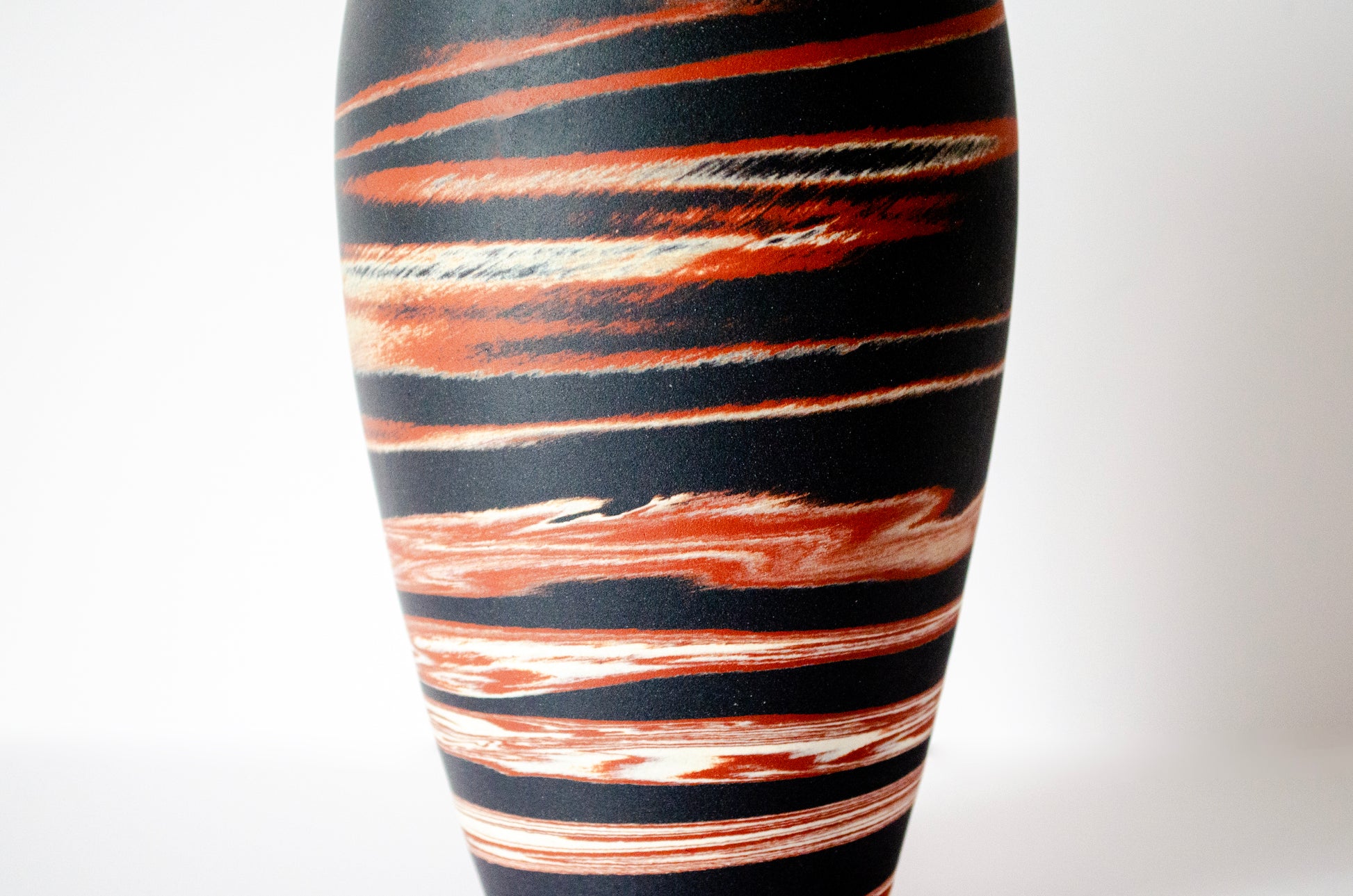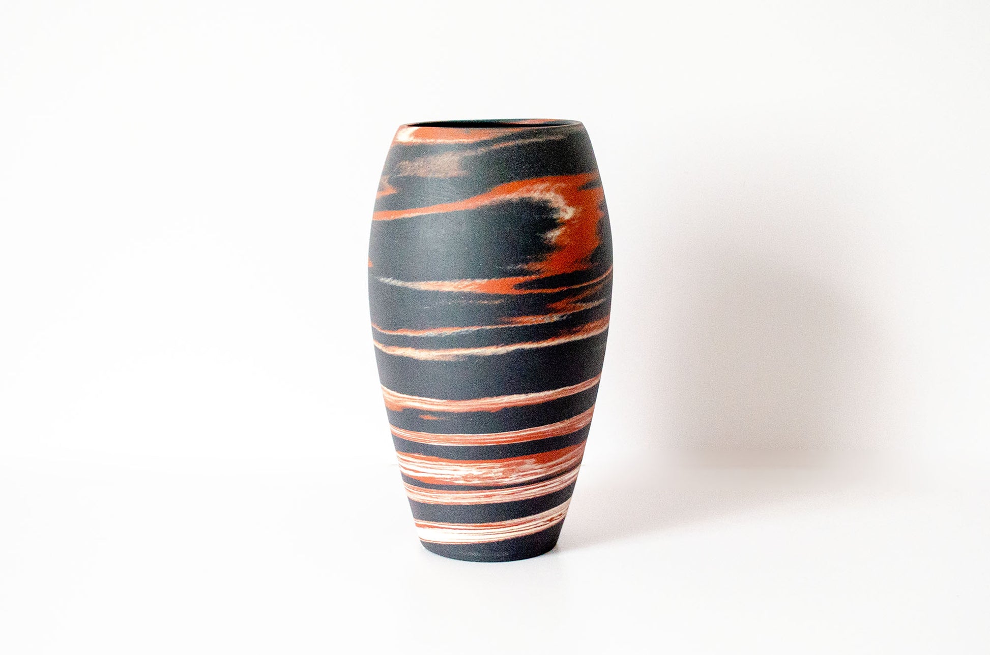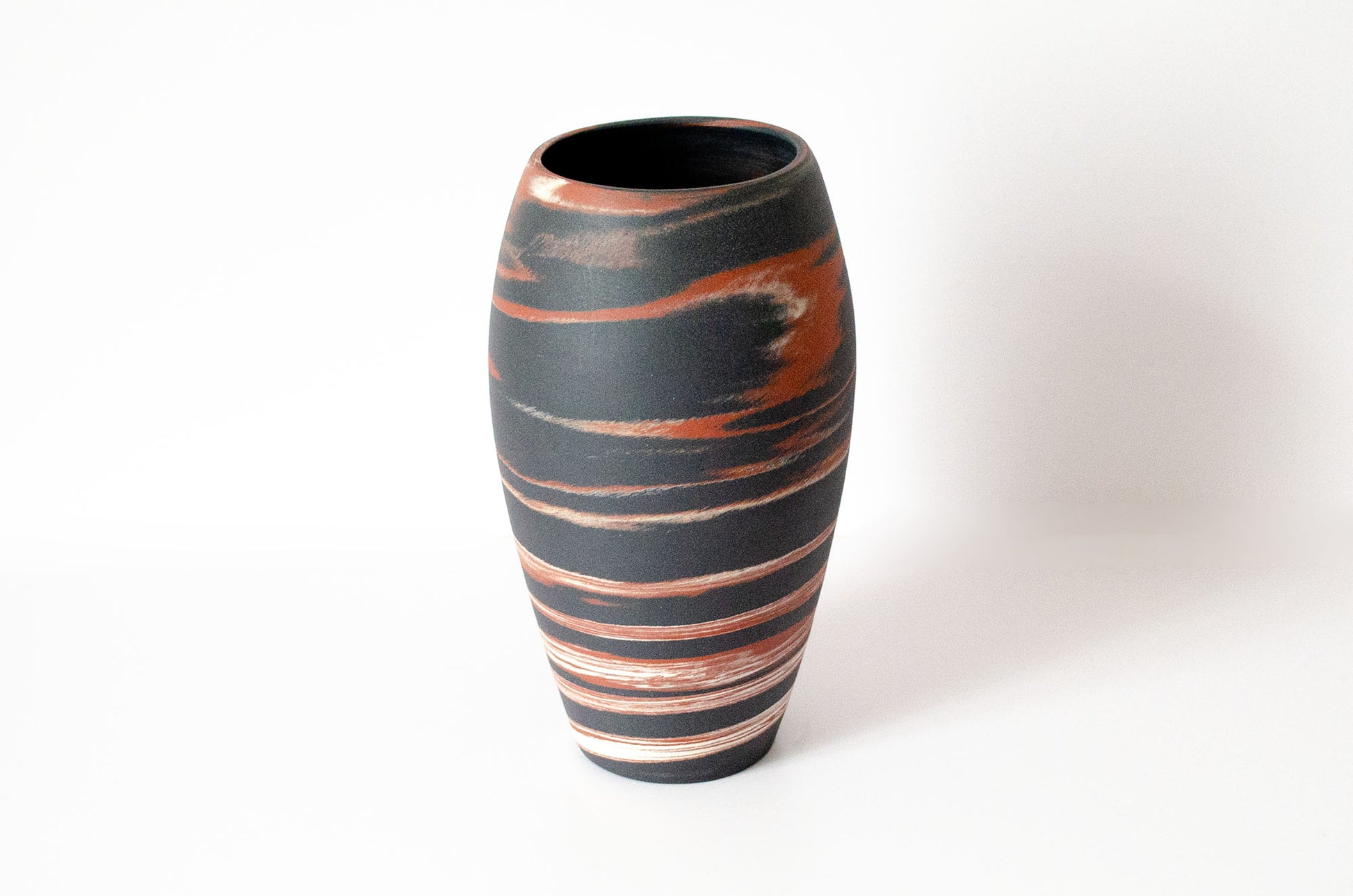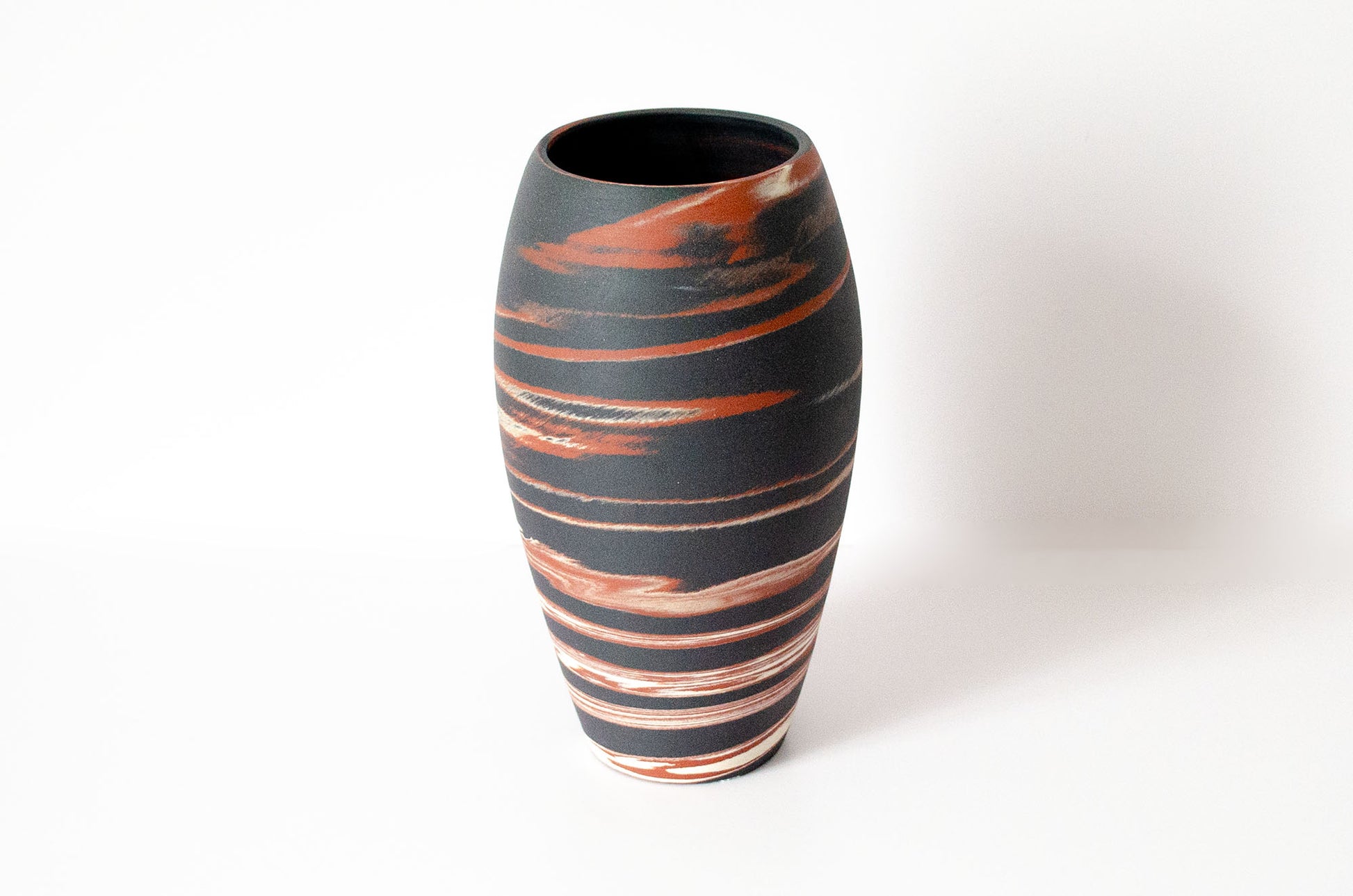 Using the Neriage (marble ware, agateware) technique, it was formed by wheel throwing using black, red, and white colored clay. You can see the process of making this piece on the following YouTube Short: